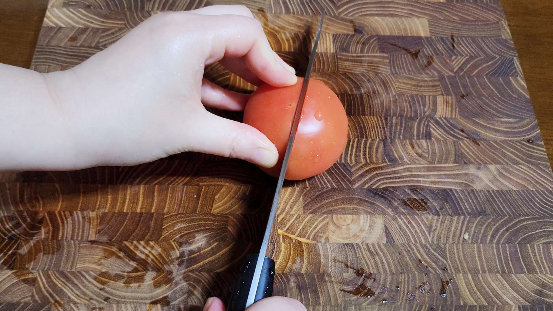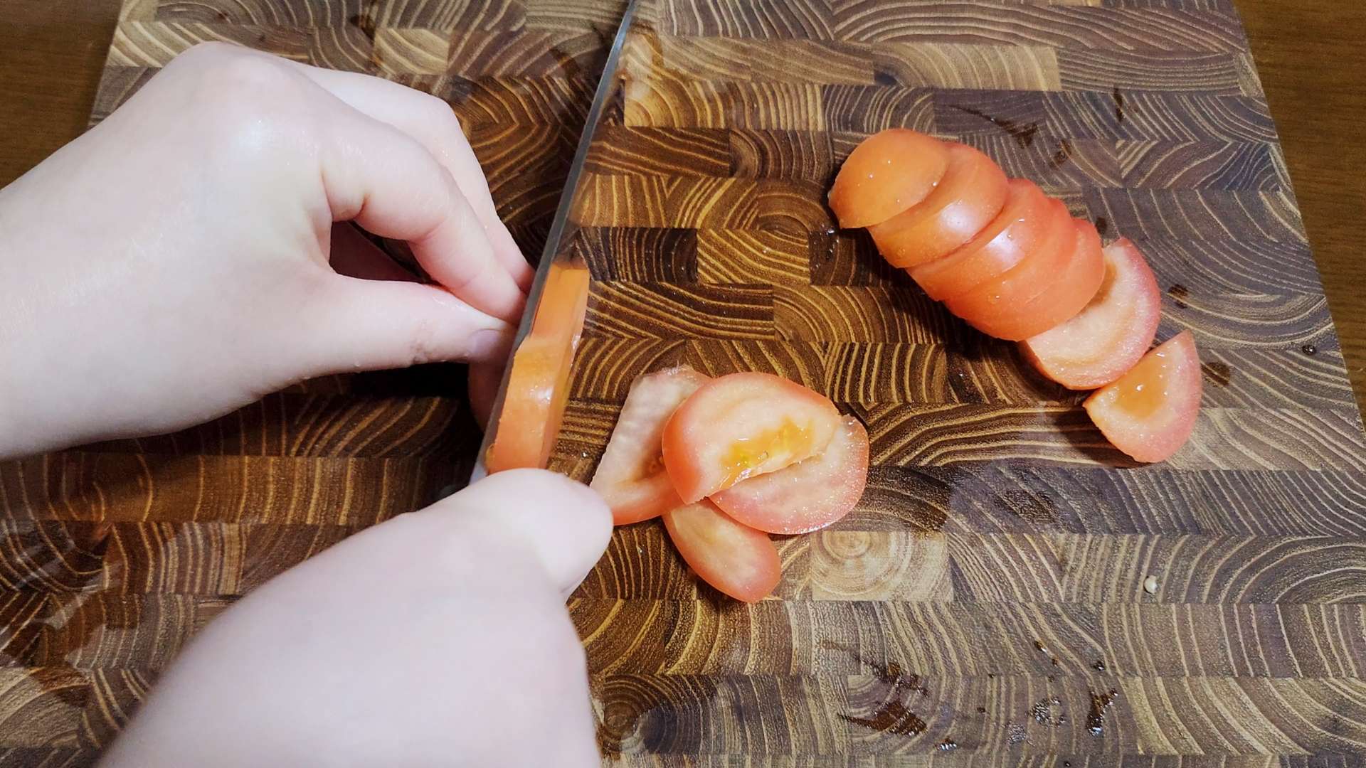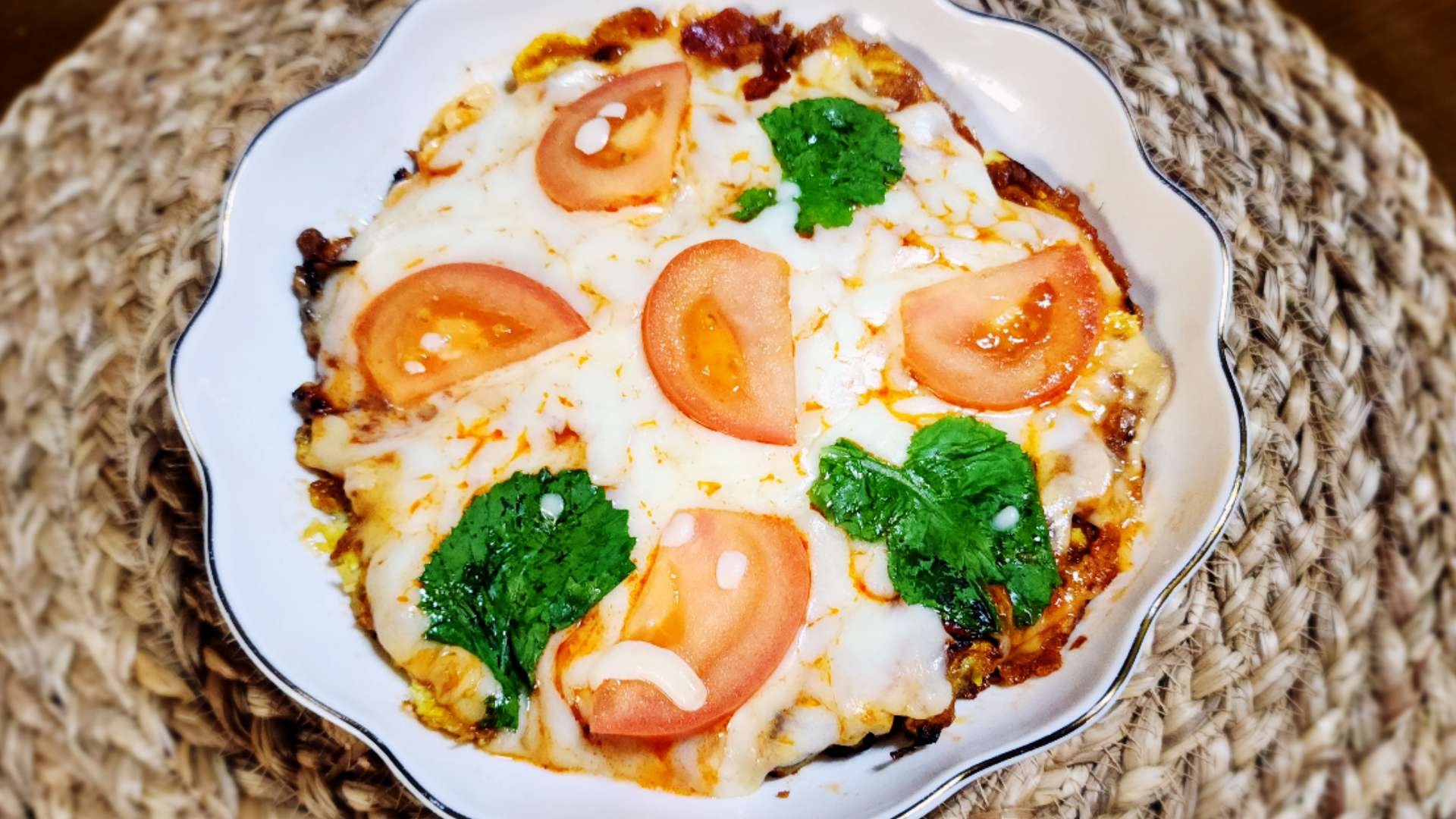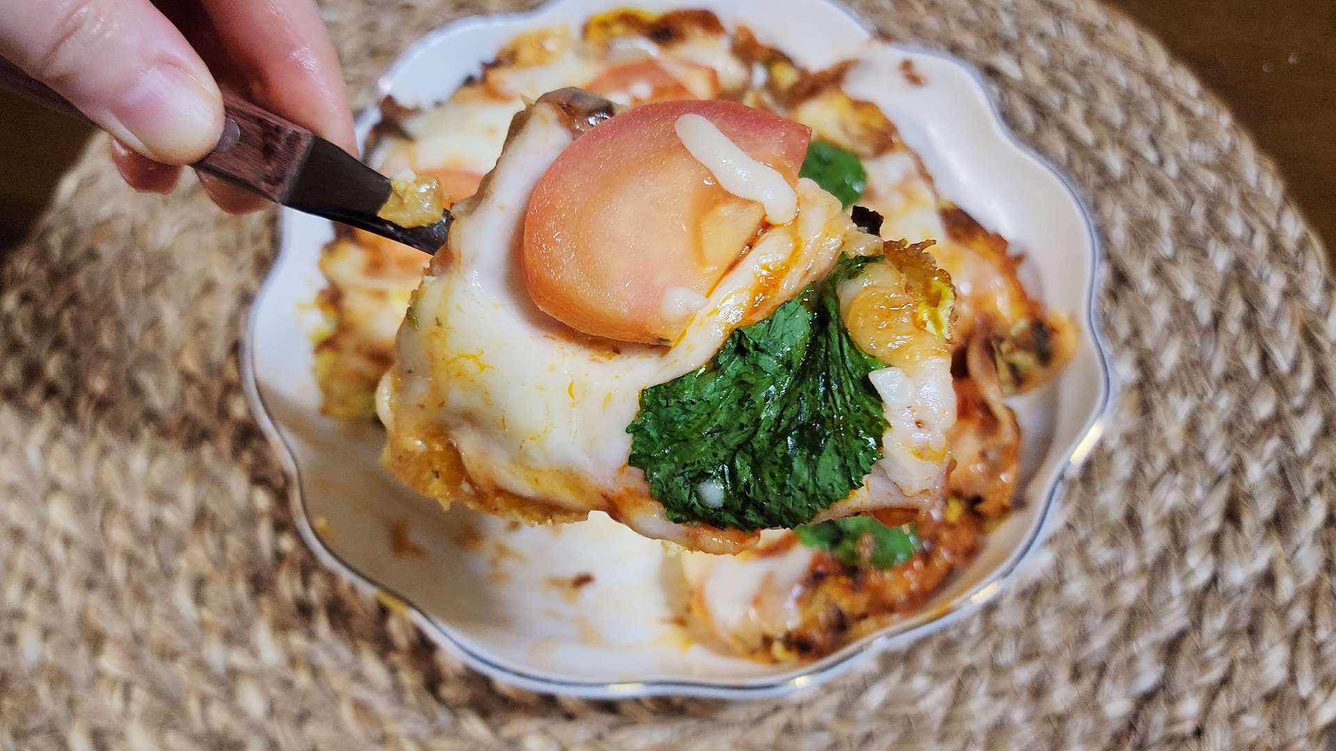 재료: 양배추 1/8개, 달걀 2개, 소금 약간, 올리브유, 라이스 페이퍼 1장, 토마토소스 1T, 모차렐라 치즈, 토마토, 유채 잎