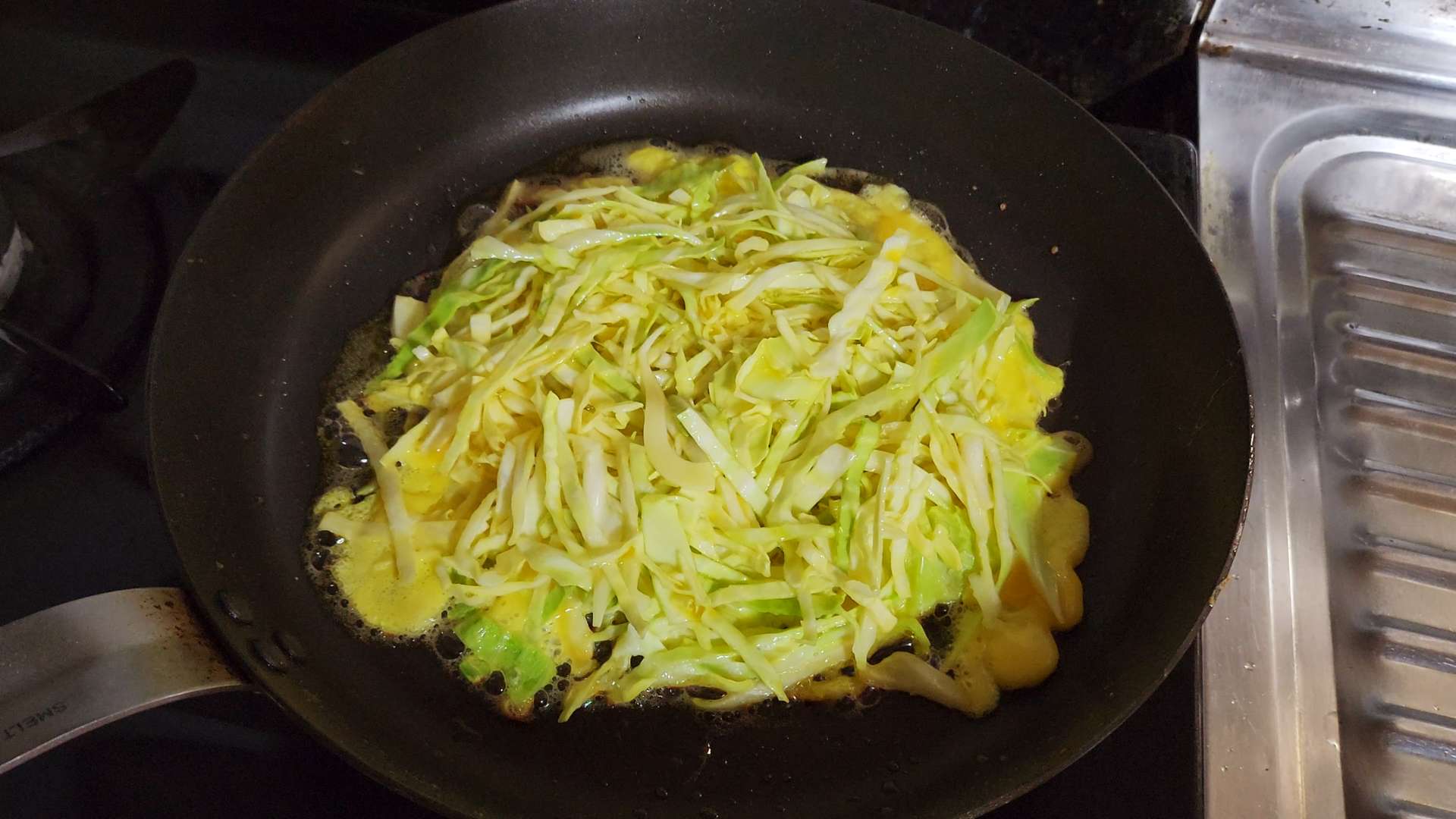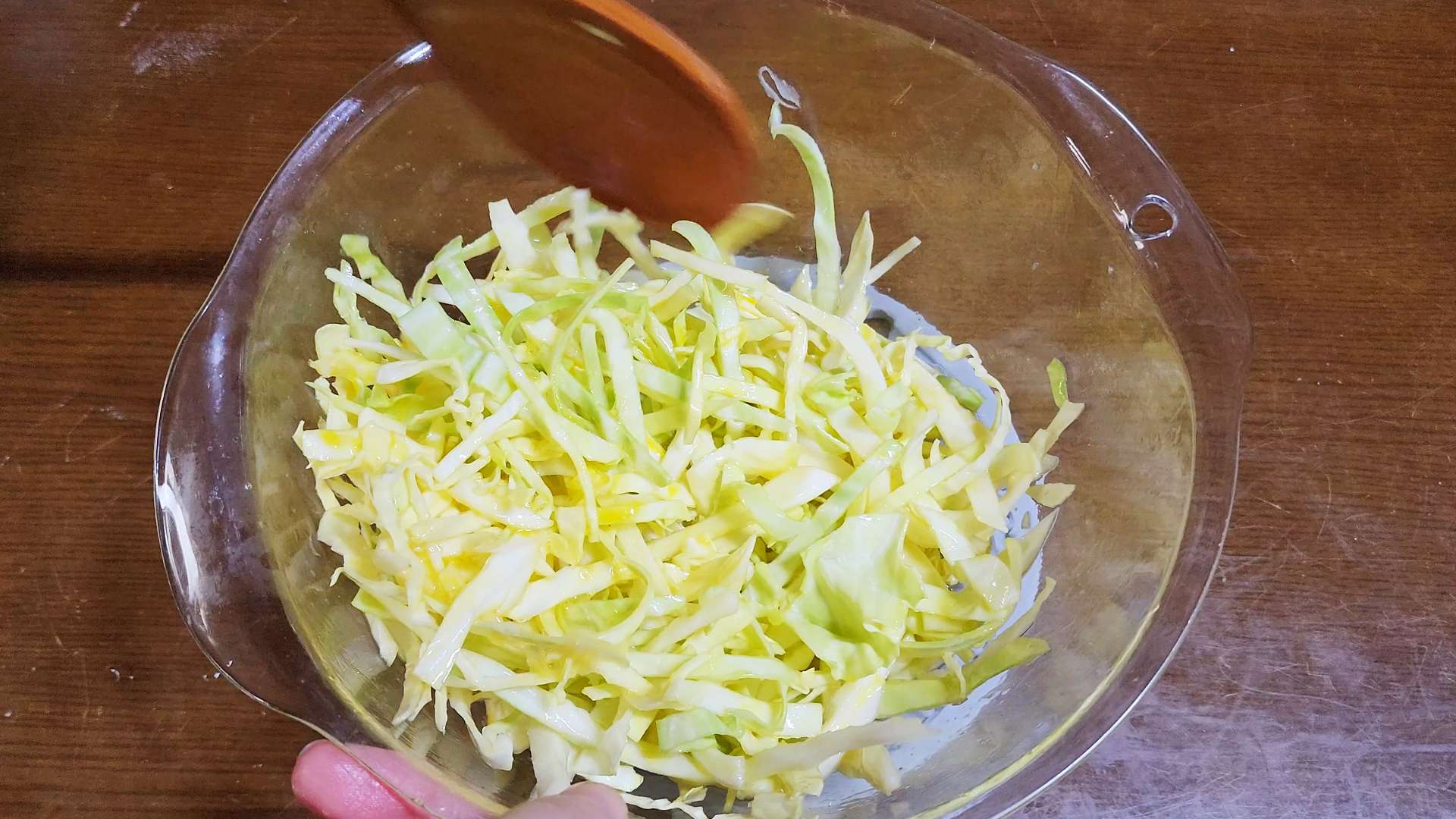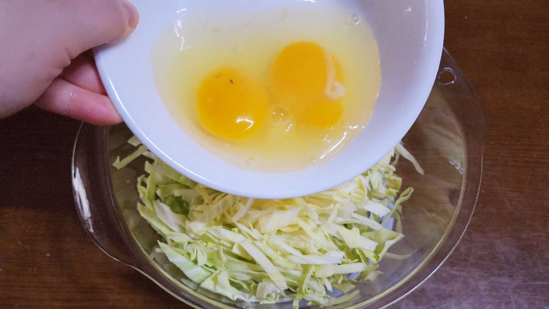 양배추, 달걀 2개, 소금 약간을 넣고 섞어줍니다.