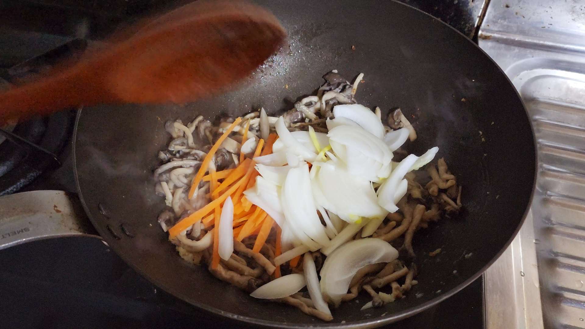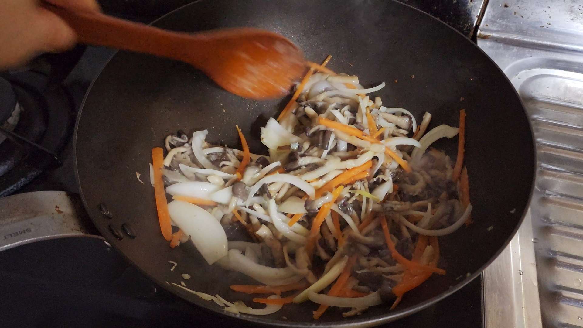 재료: 느타리버섯 200g, 양파 1/2개, 당근 약간, 대파 약간, 식용유, 굵은소금 1/2T