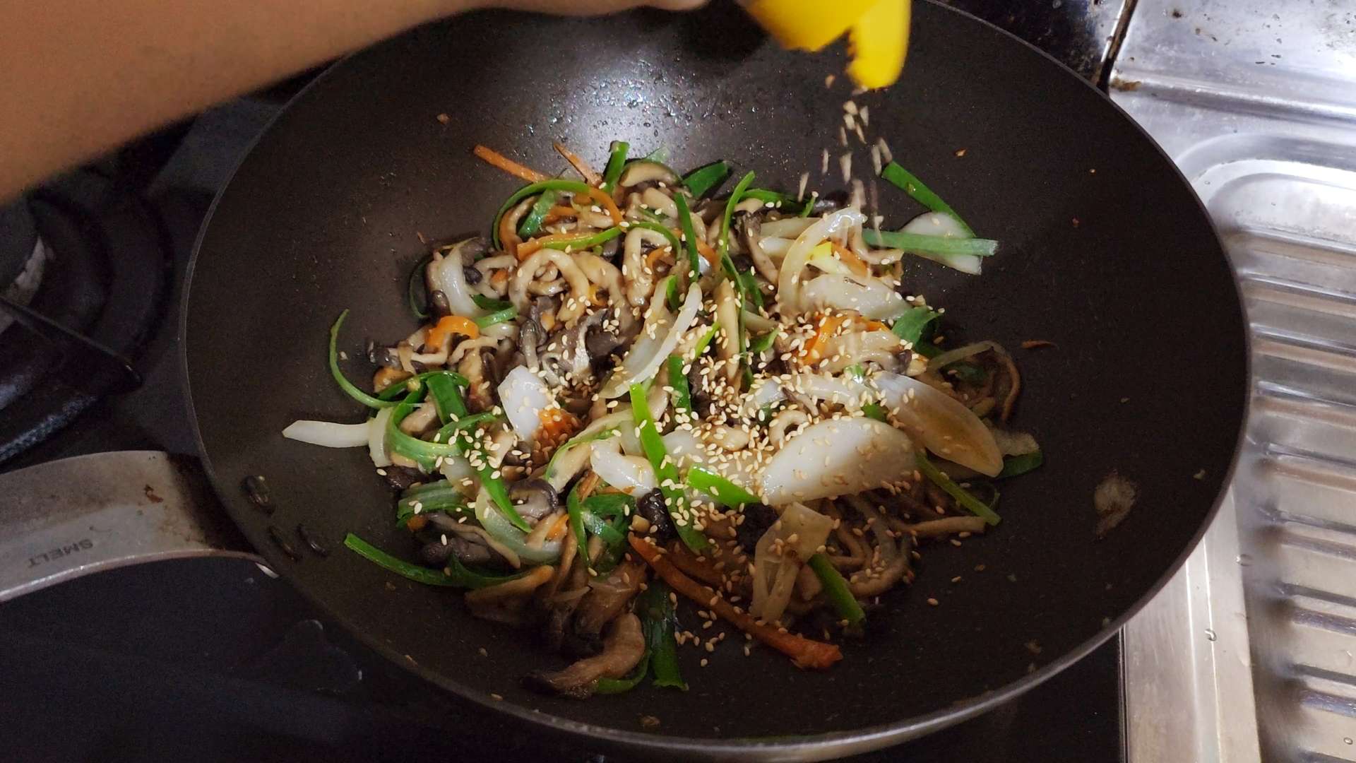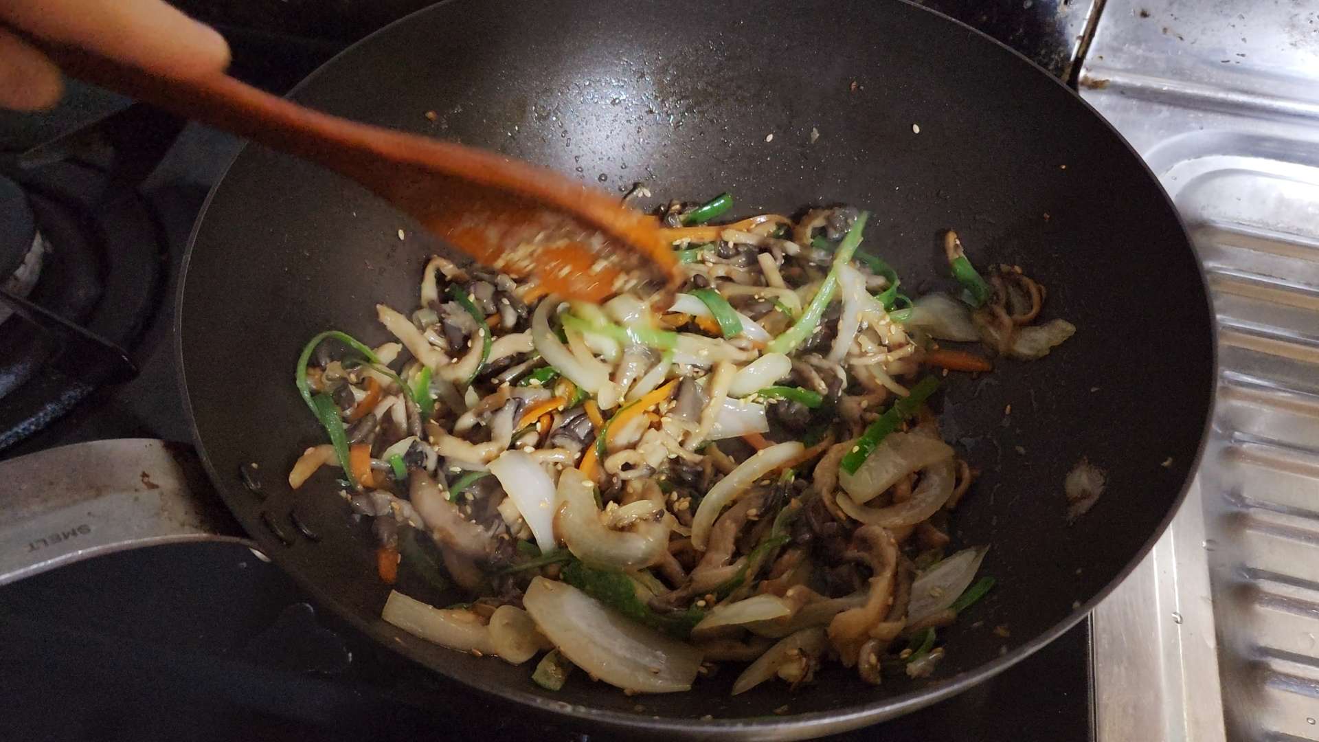 불을 끄고 참기름 1T, 통깨를 넣고 섞어줍니다.