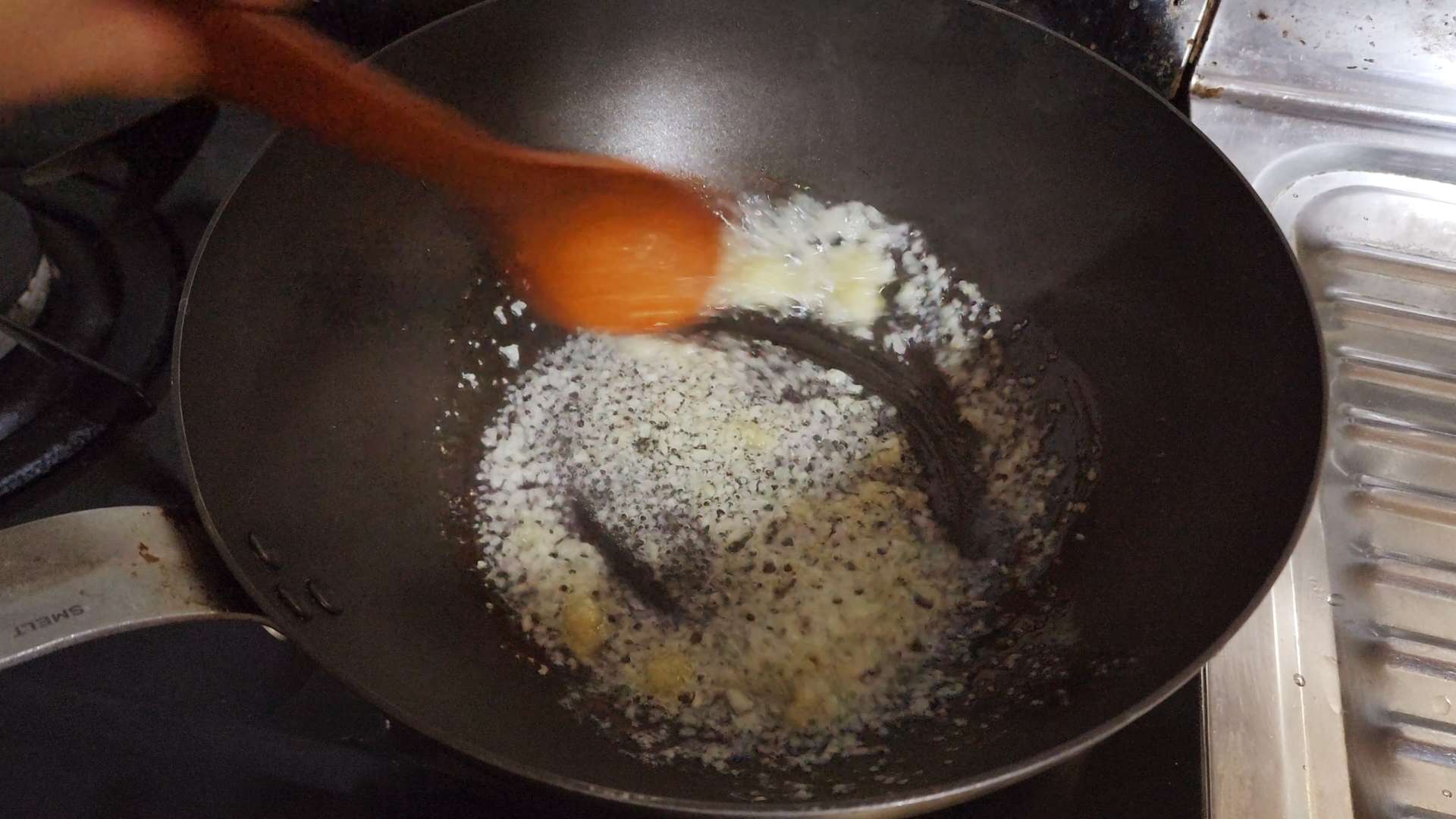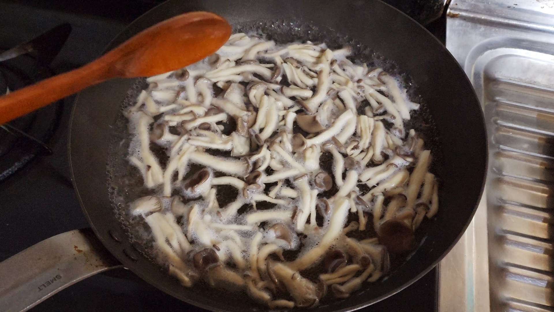 중불로 달군팬에 식용유를 두르고 다진마늘 1T, 느타리버섯을 넣고 볶아줍니다.