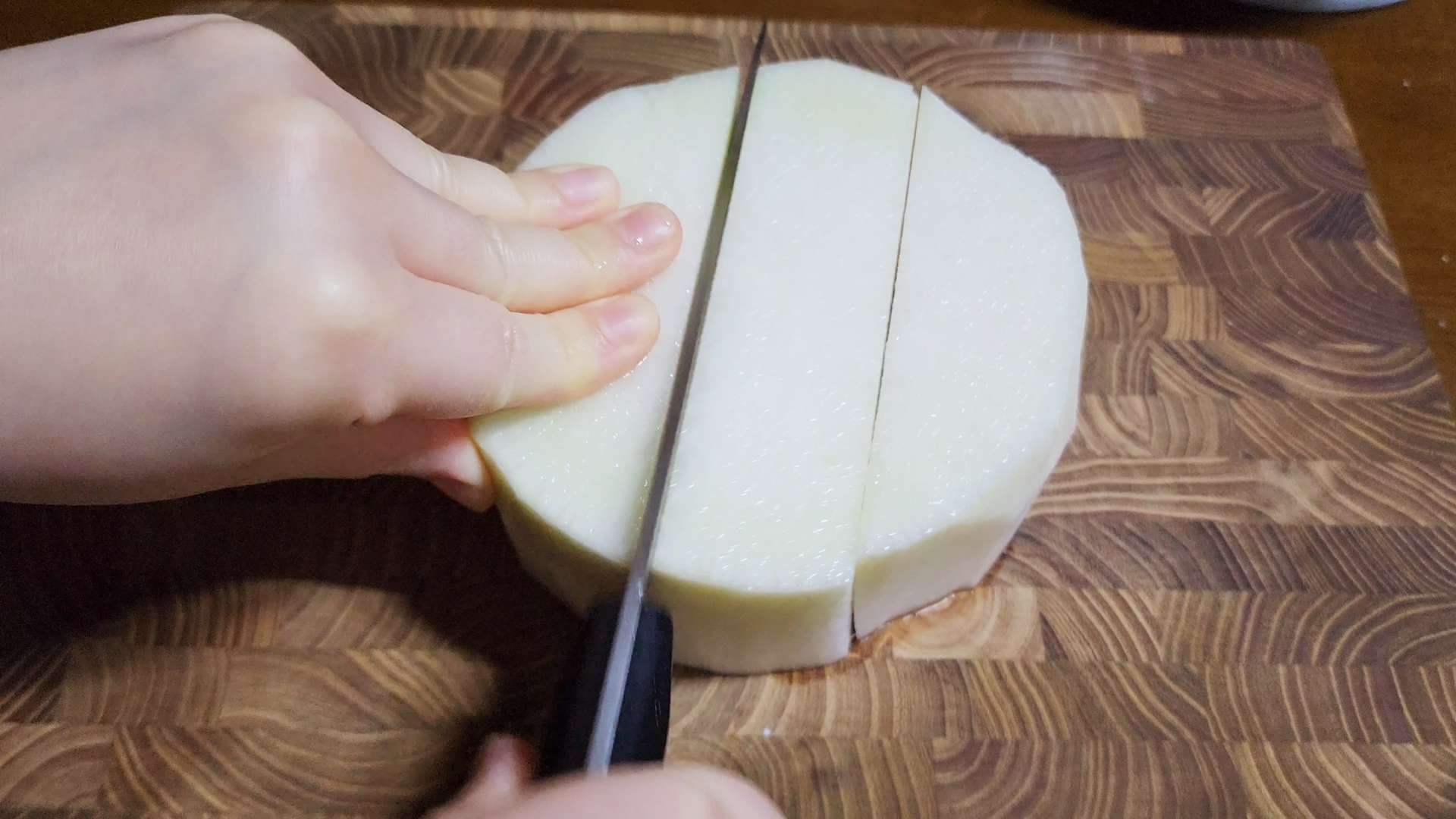 대파는 세로로 반 가르고 5cm 길이로 잘라줍니다.