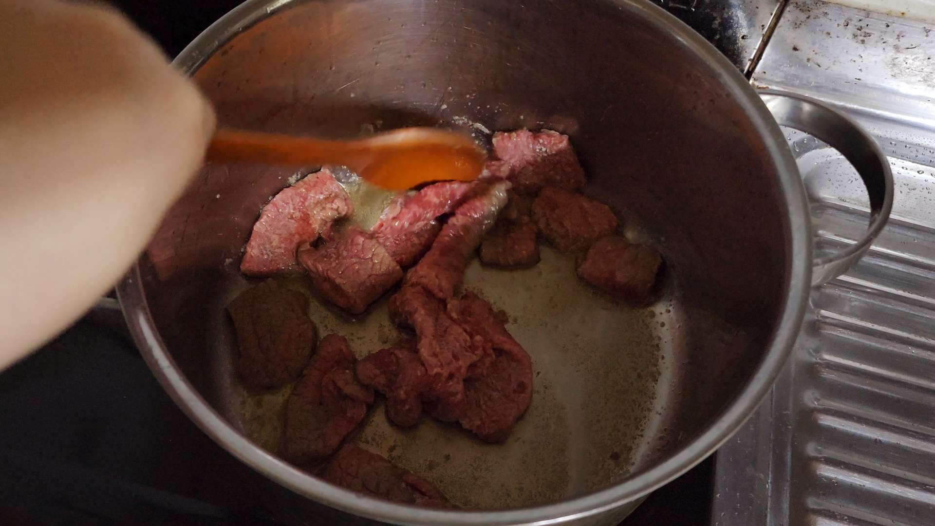 중불로 달군 냄비에 식용유 두 바퀴, 참기름 2T, 소고기 양지를 넣고 중불에서 볶아줍니다.