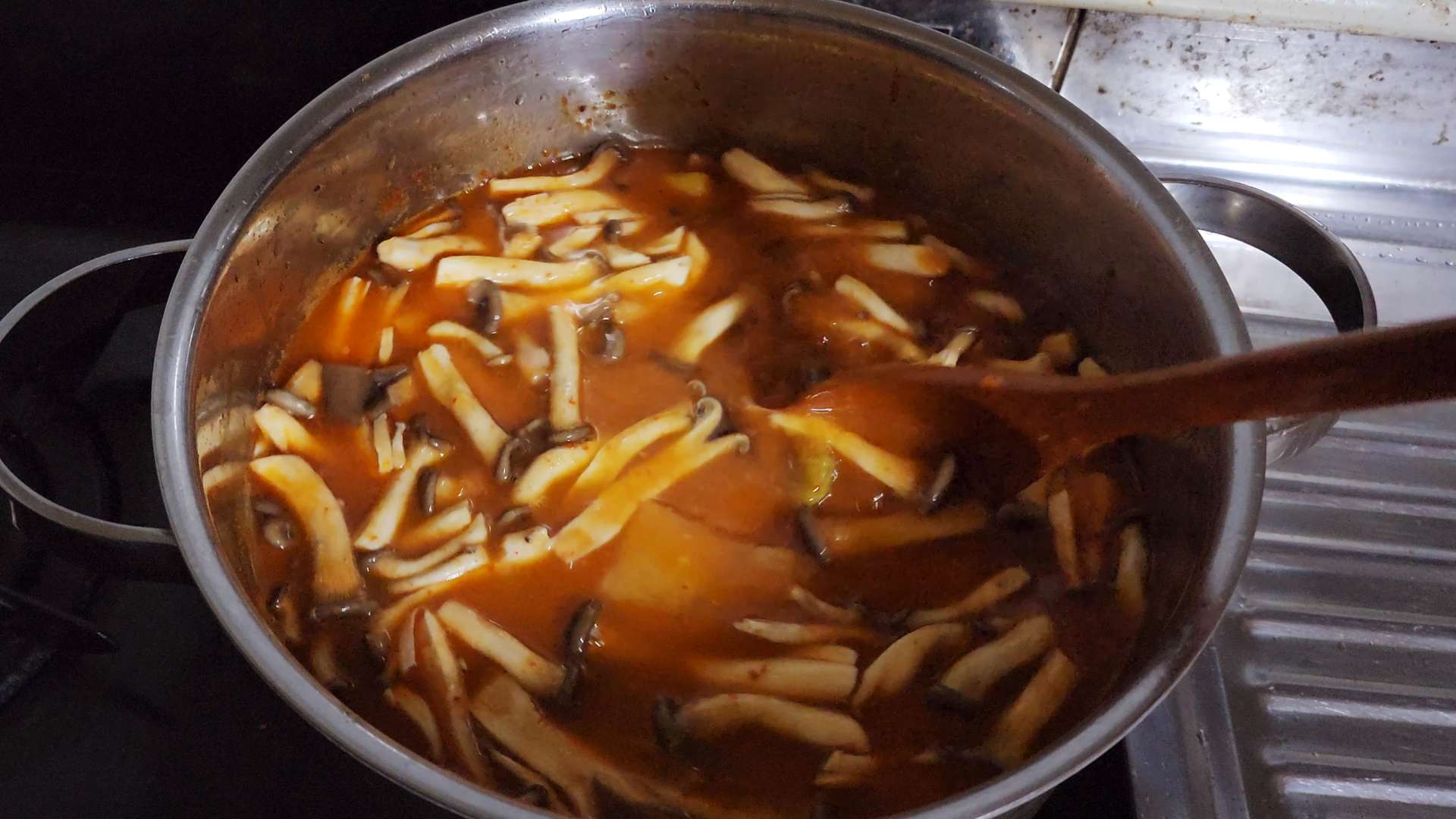 물 2L, 쌈장 2T, 느타리버섯을 넣고 강불에서 끓여줍니다. 물이 끓으면 뚜껑을 닫고 중불에서 20분 끓여줍니다.