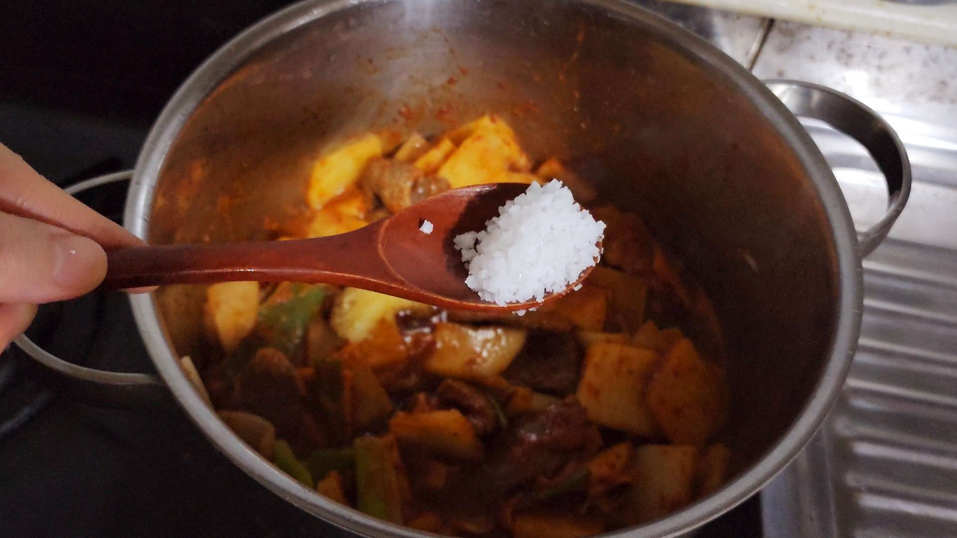 굵은소금 1/2T를 넣고 볶아줍니다.