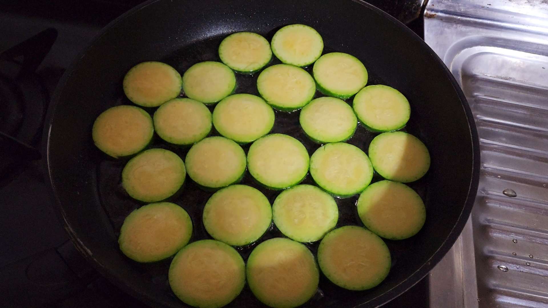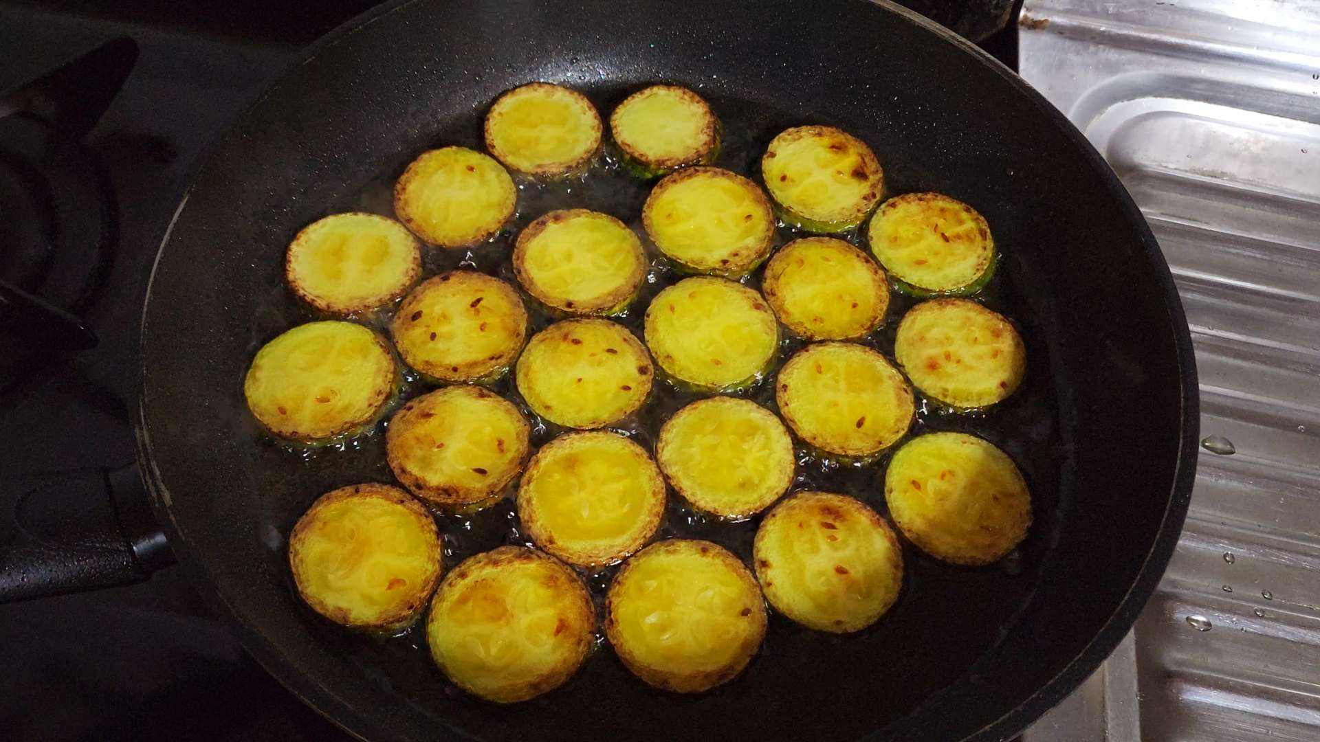 중불로 달군팬에 식용유 3T, 애호박은 겹치지 않게 올려 줍니다.