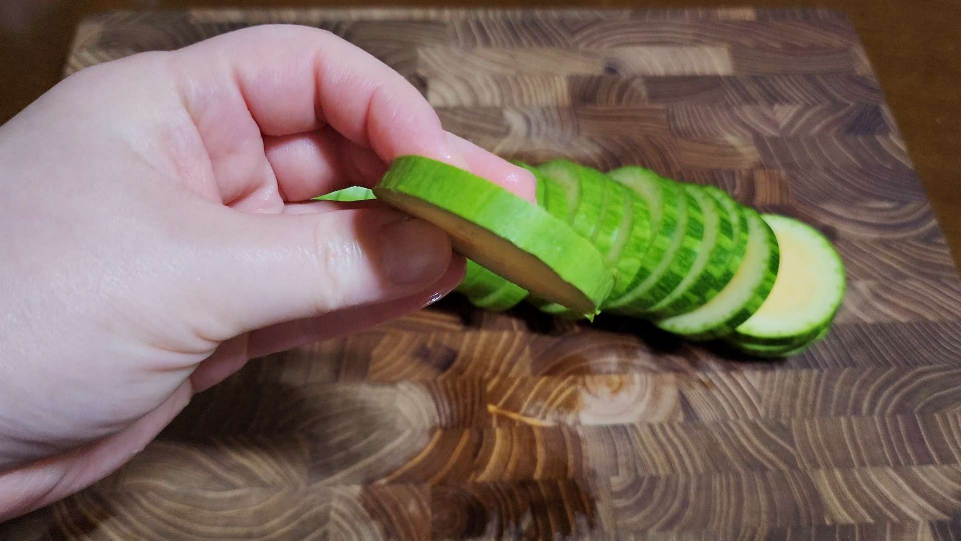 애호박은 깨끗하게 씻고 0.5cm 정도의 두께로 썰어줍니다.