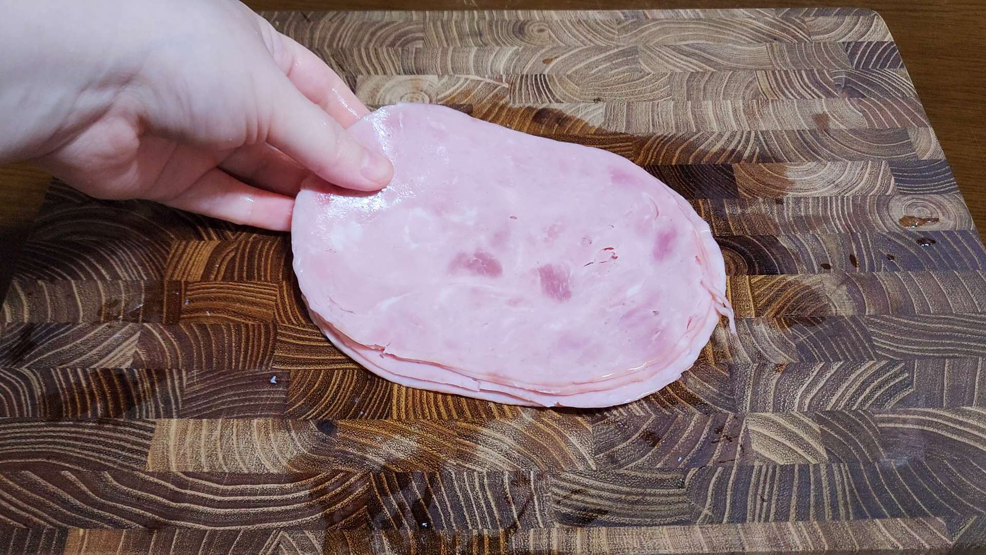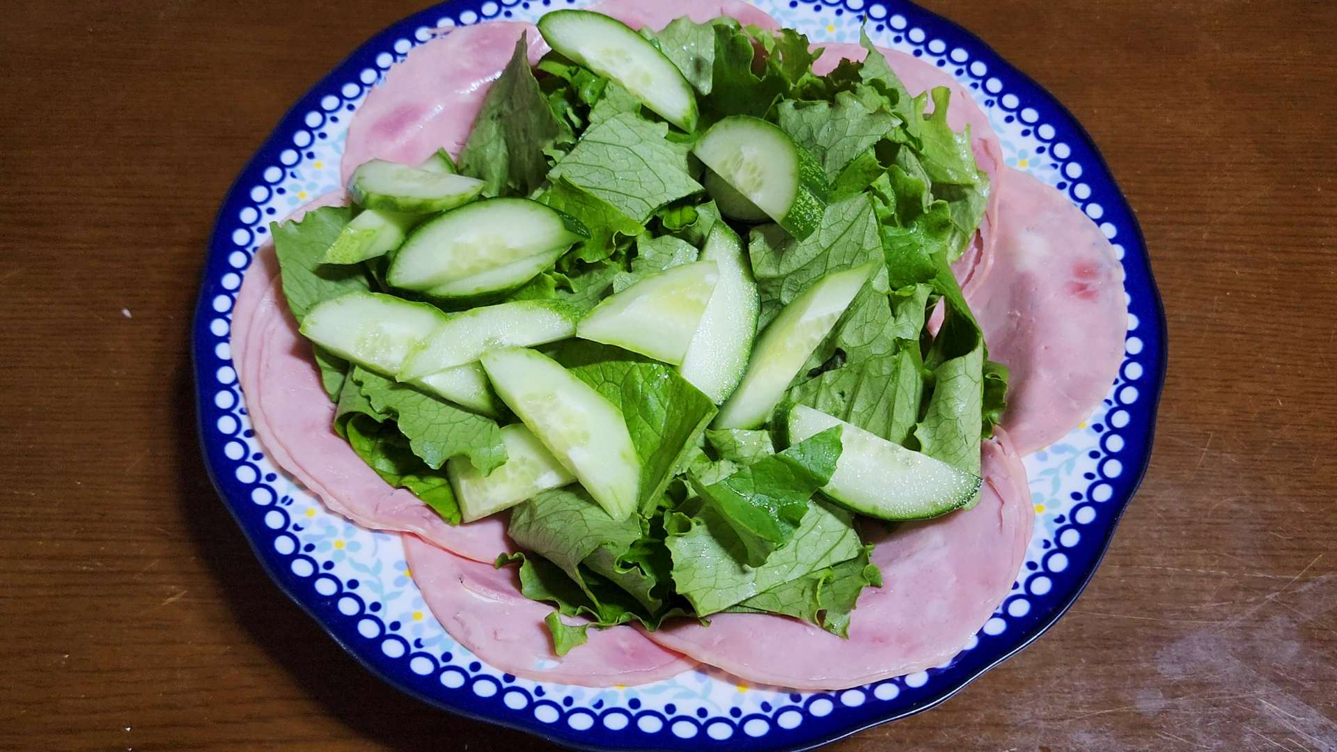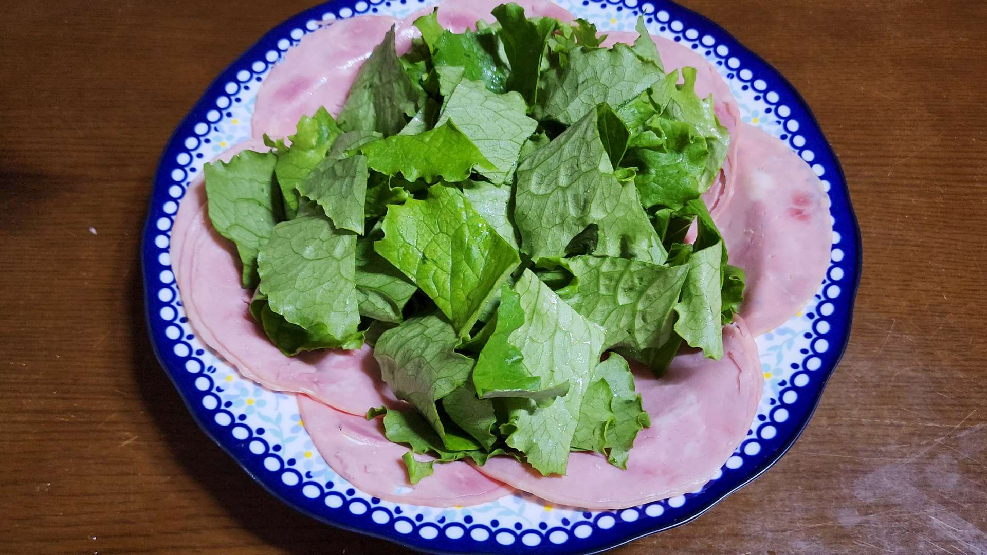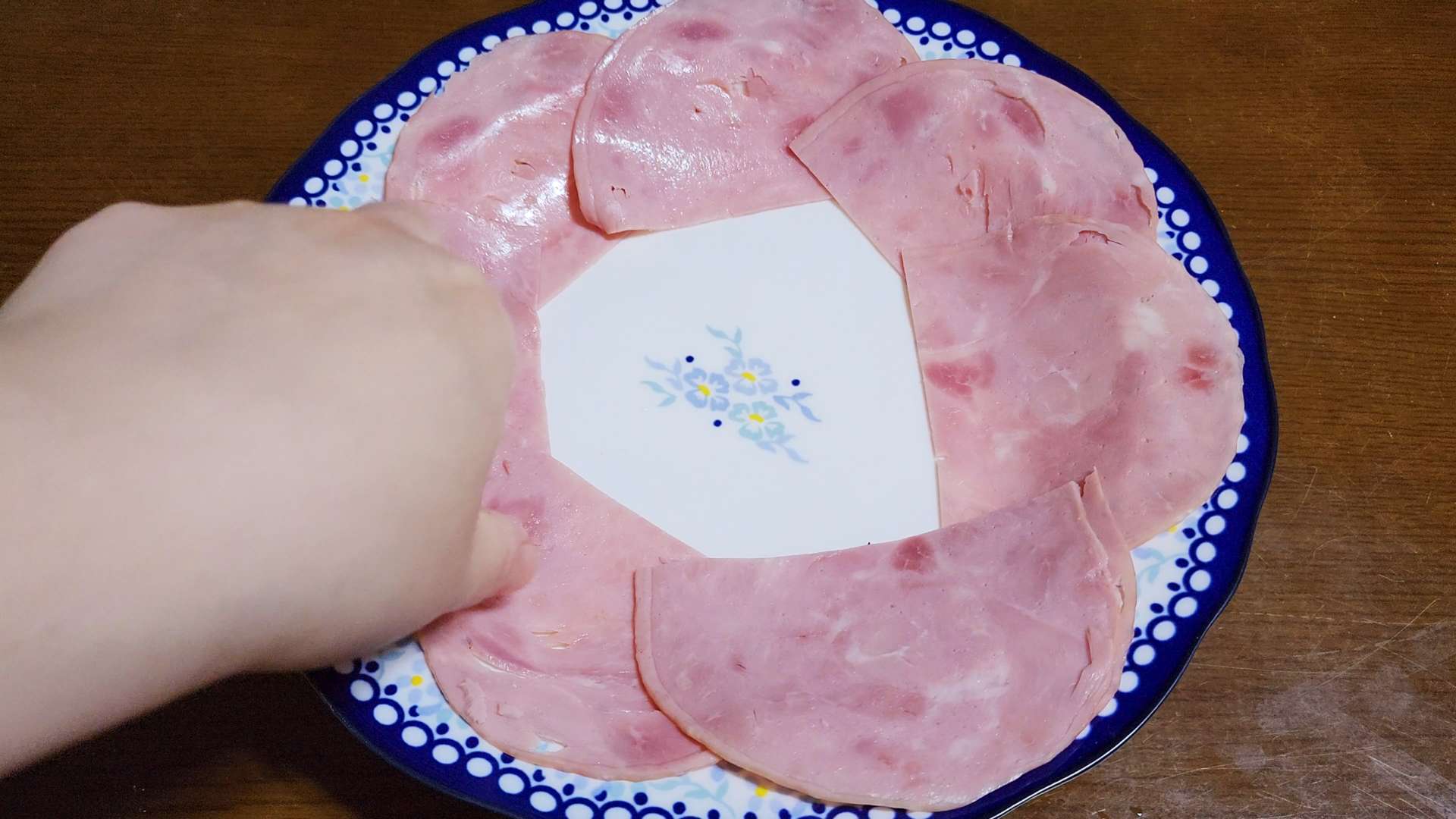 그릇 가장자리에 슬라이스햄을 담아줍니다.