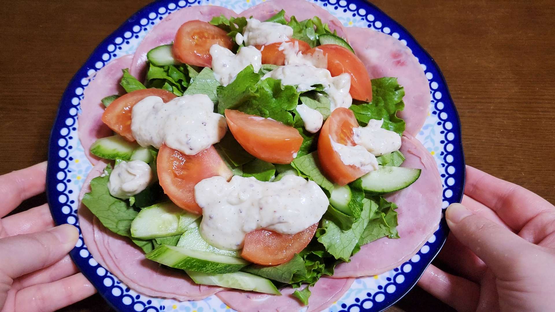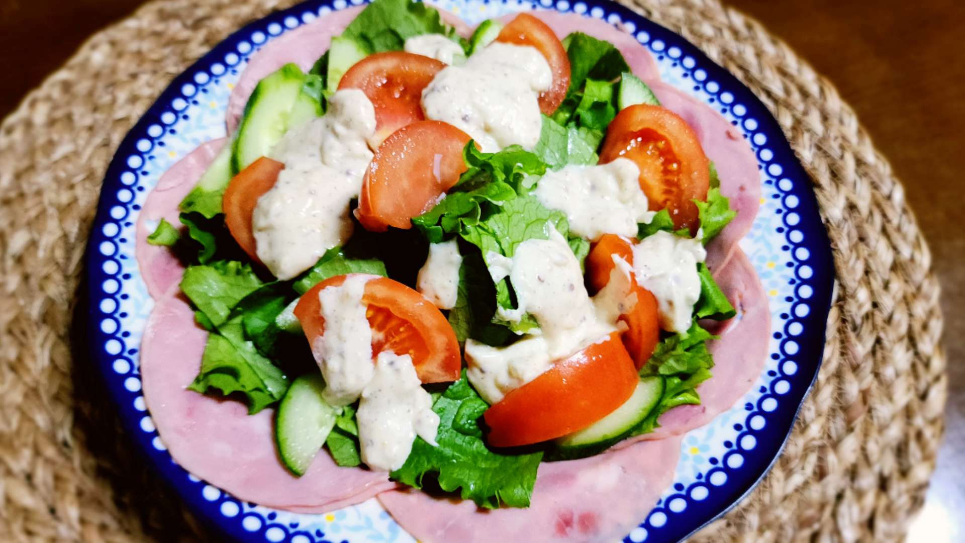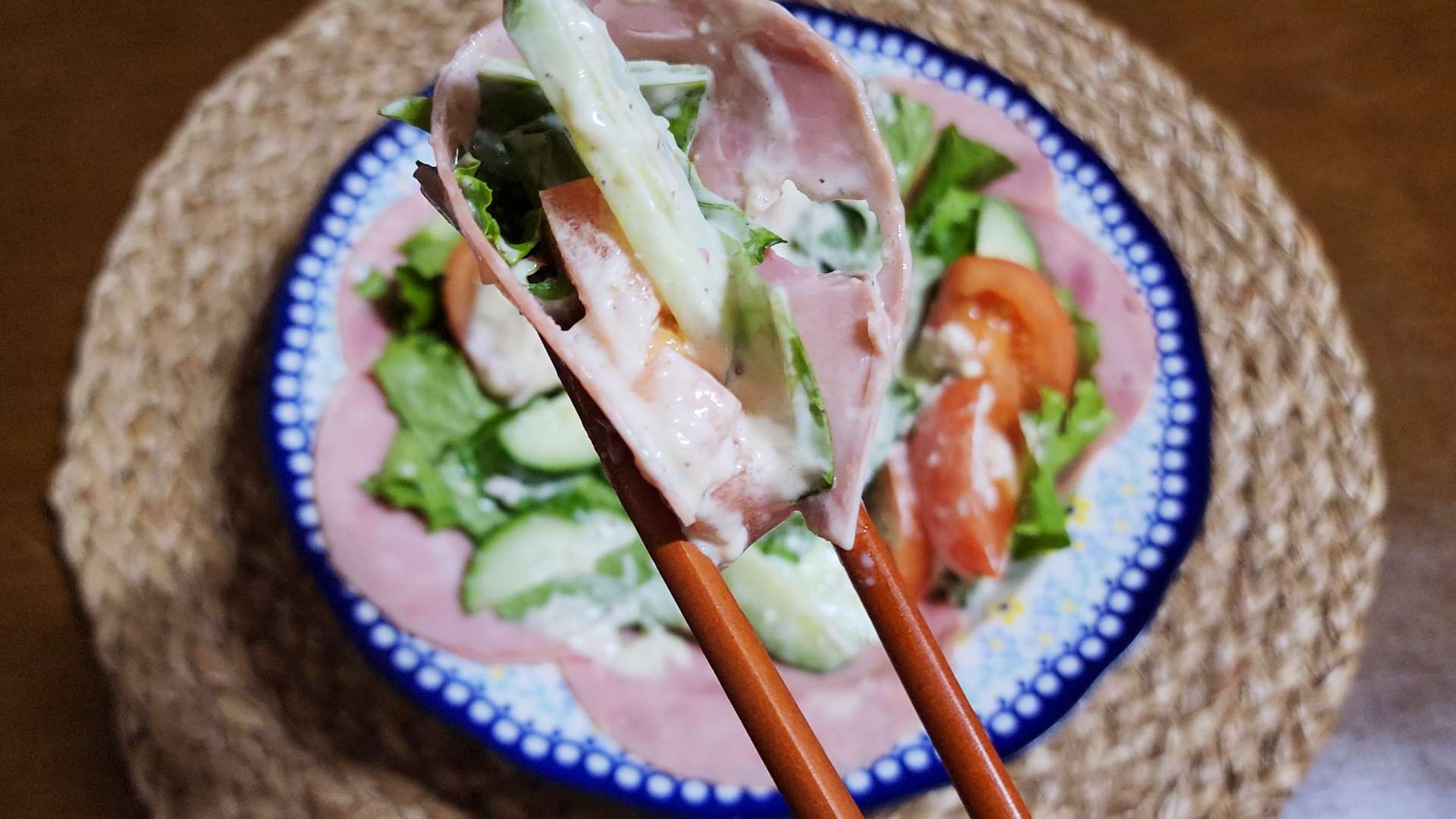 그릇 가장자리에 슬라이스햄을 담아줍니다.