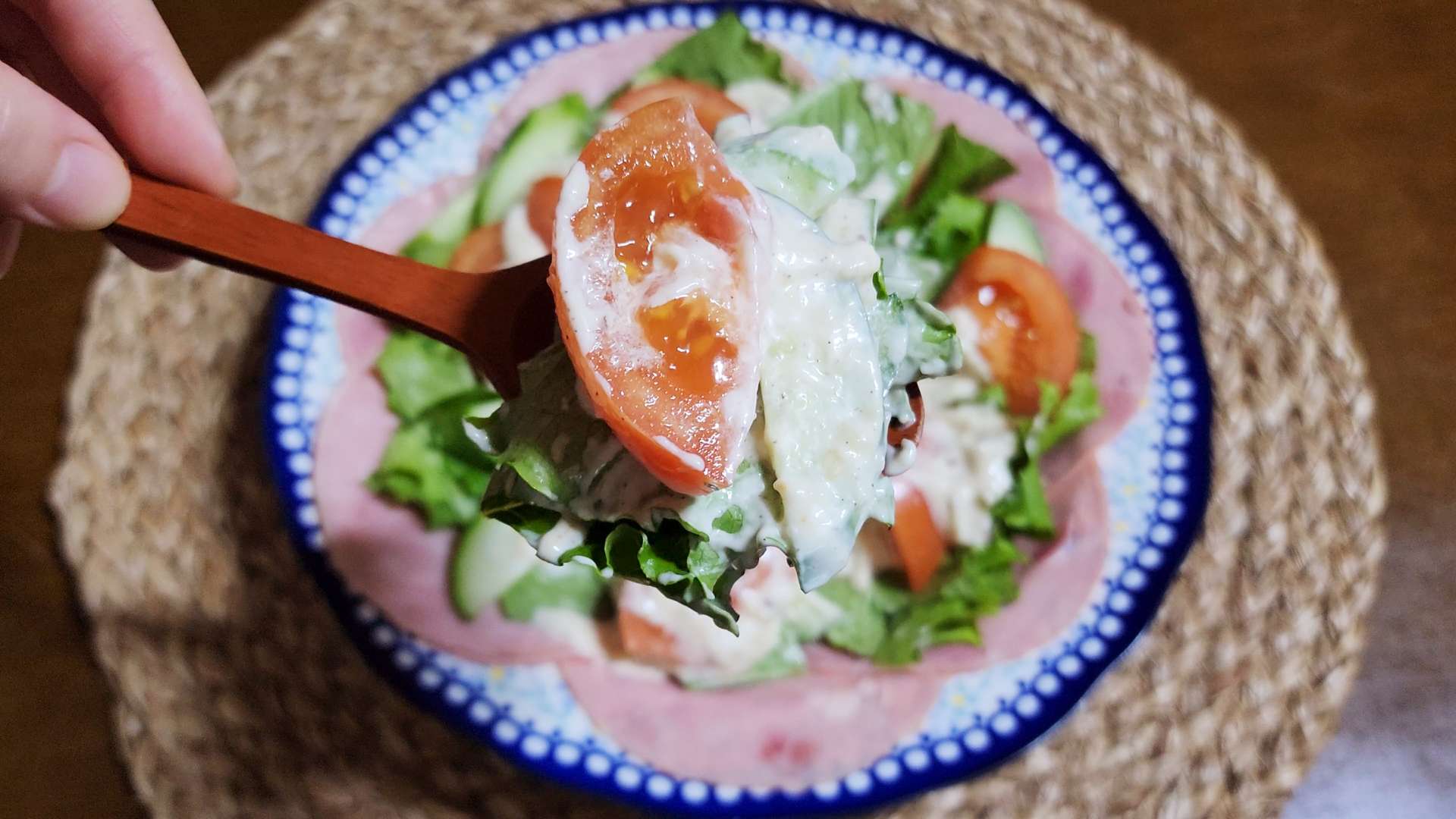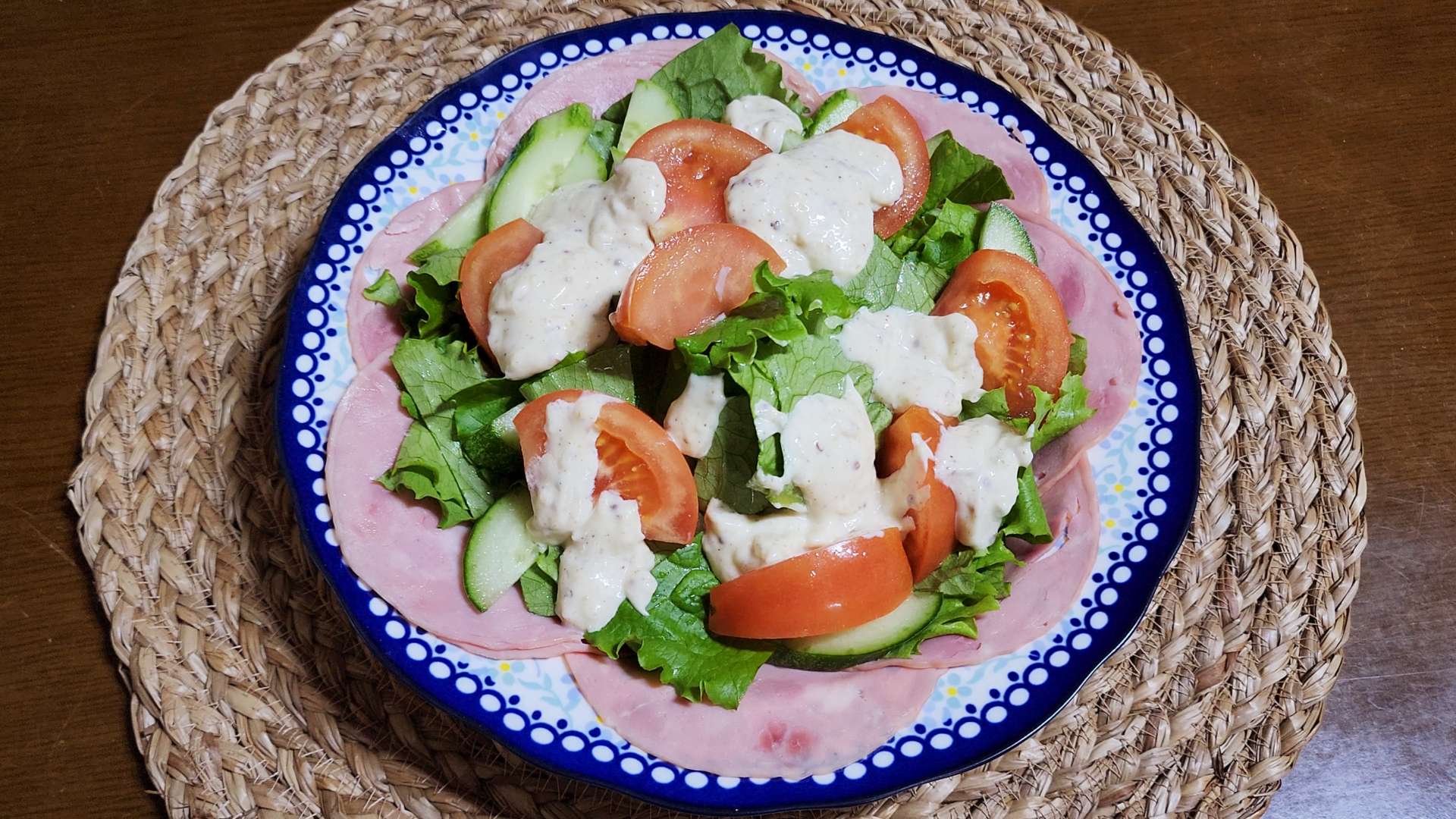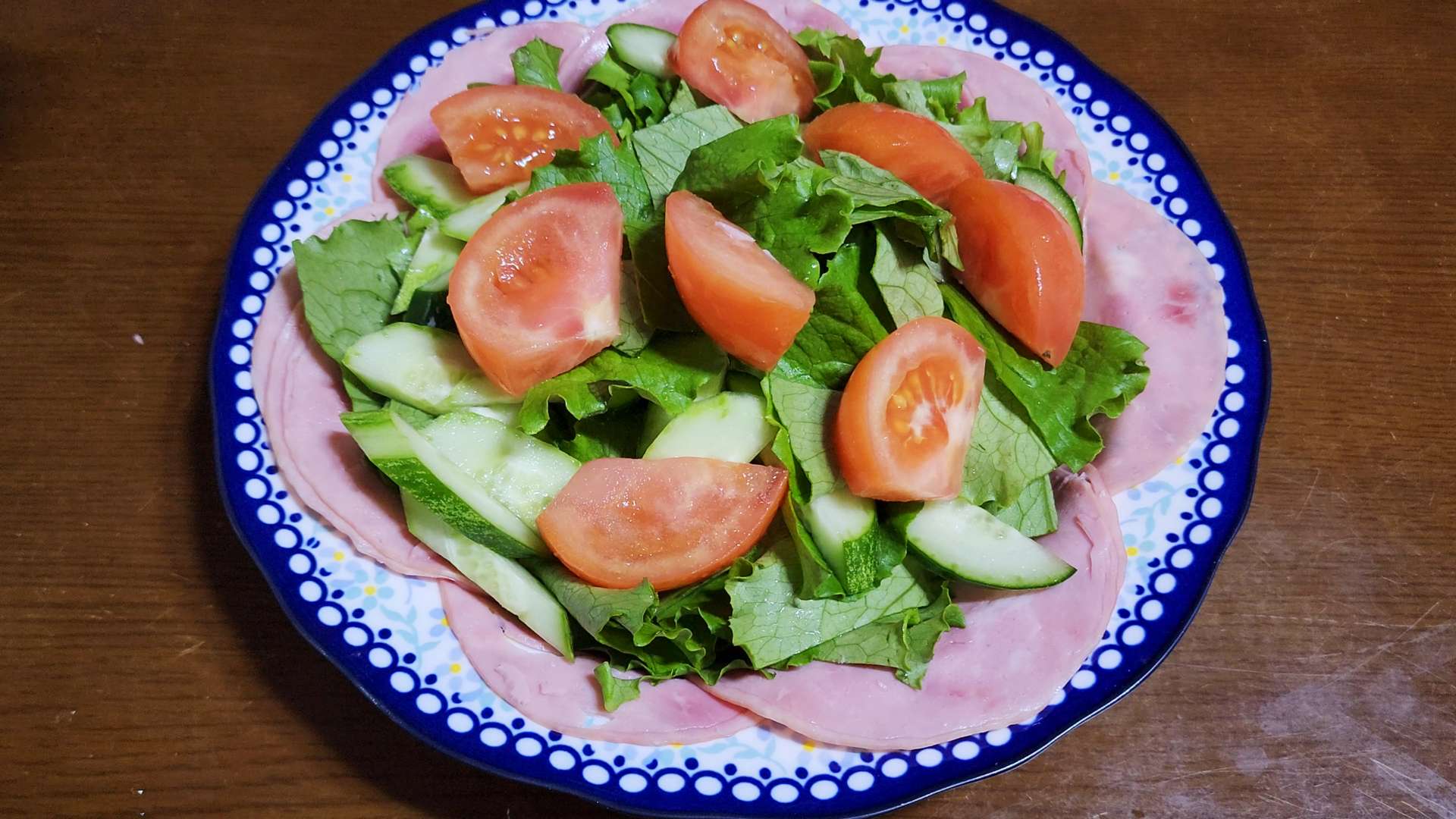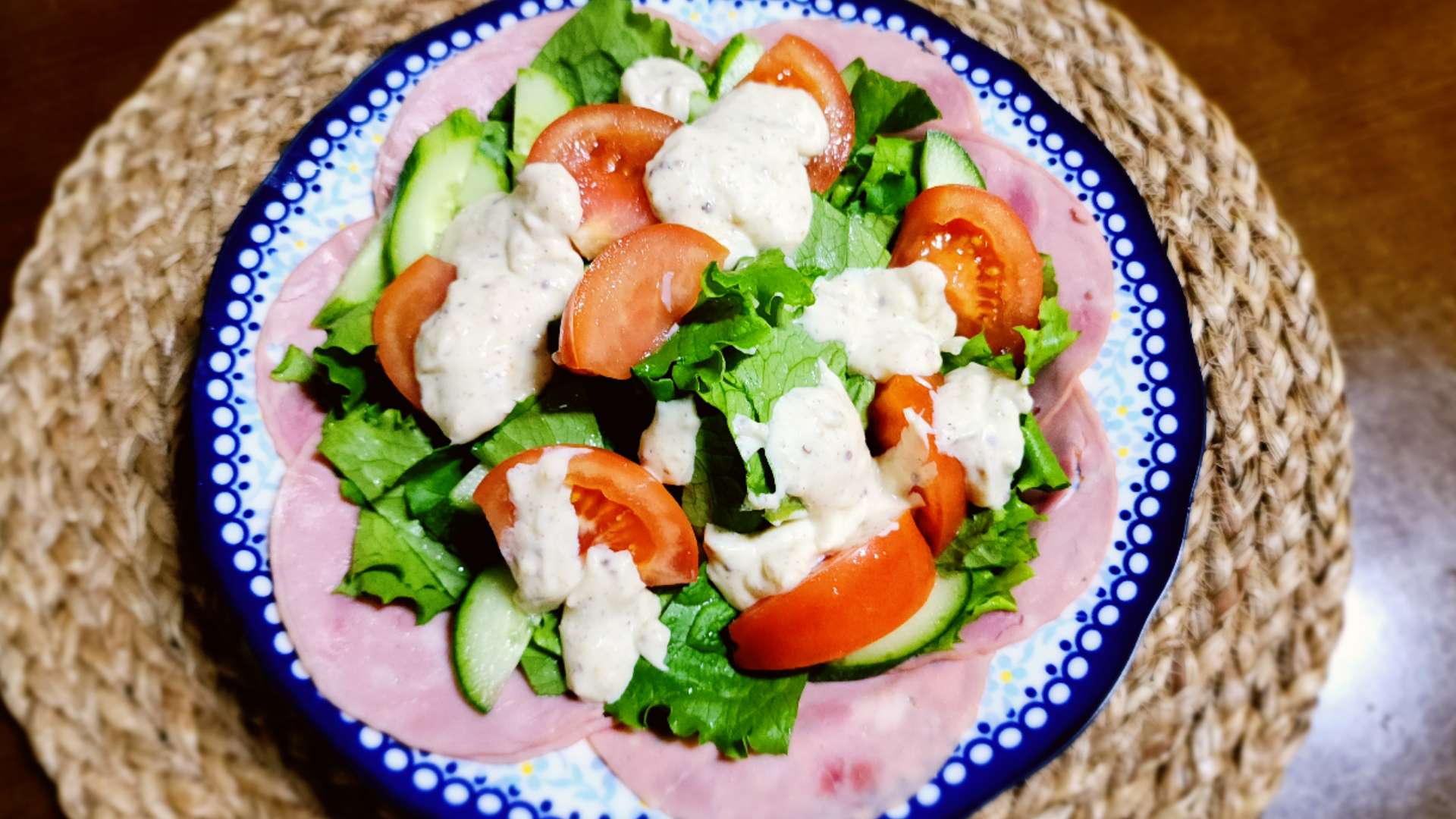 그릇 가장자리에 슬라이스햄을 담아줍니다.