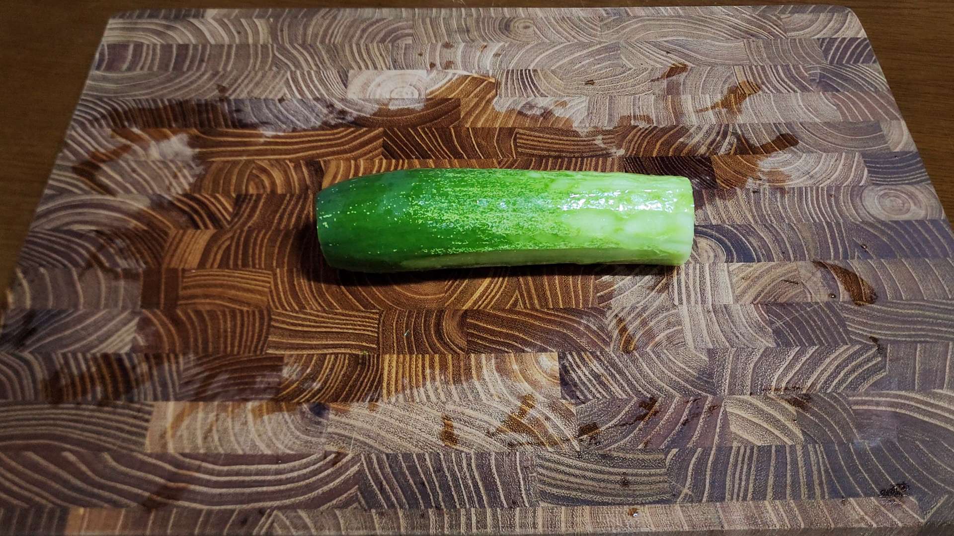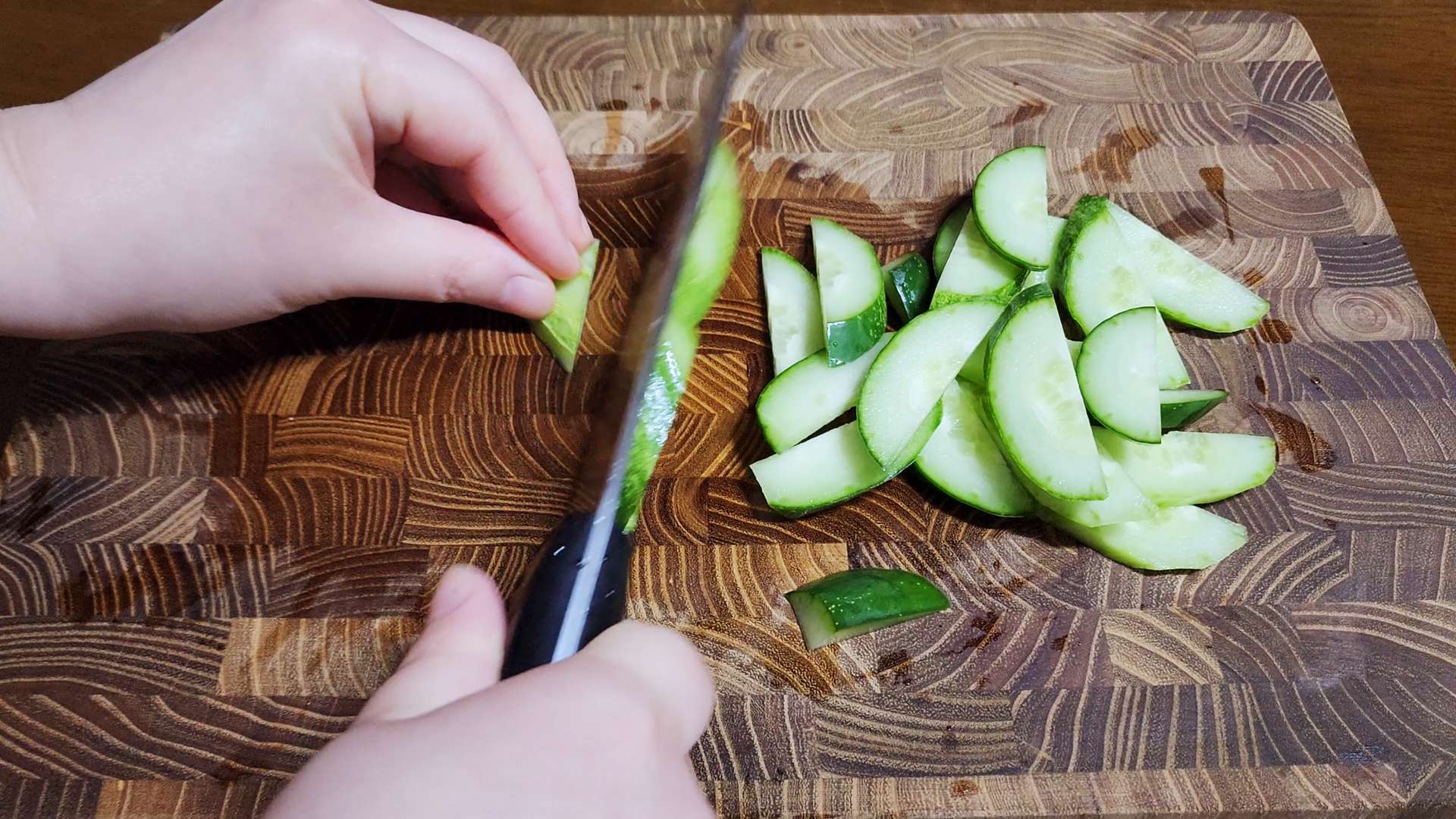 오이는 반으로 자르고 어슷 썰어줍니다.