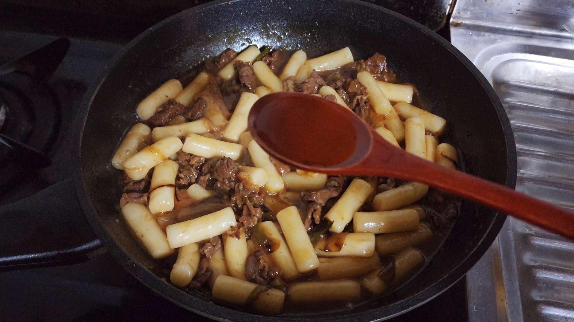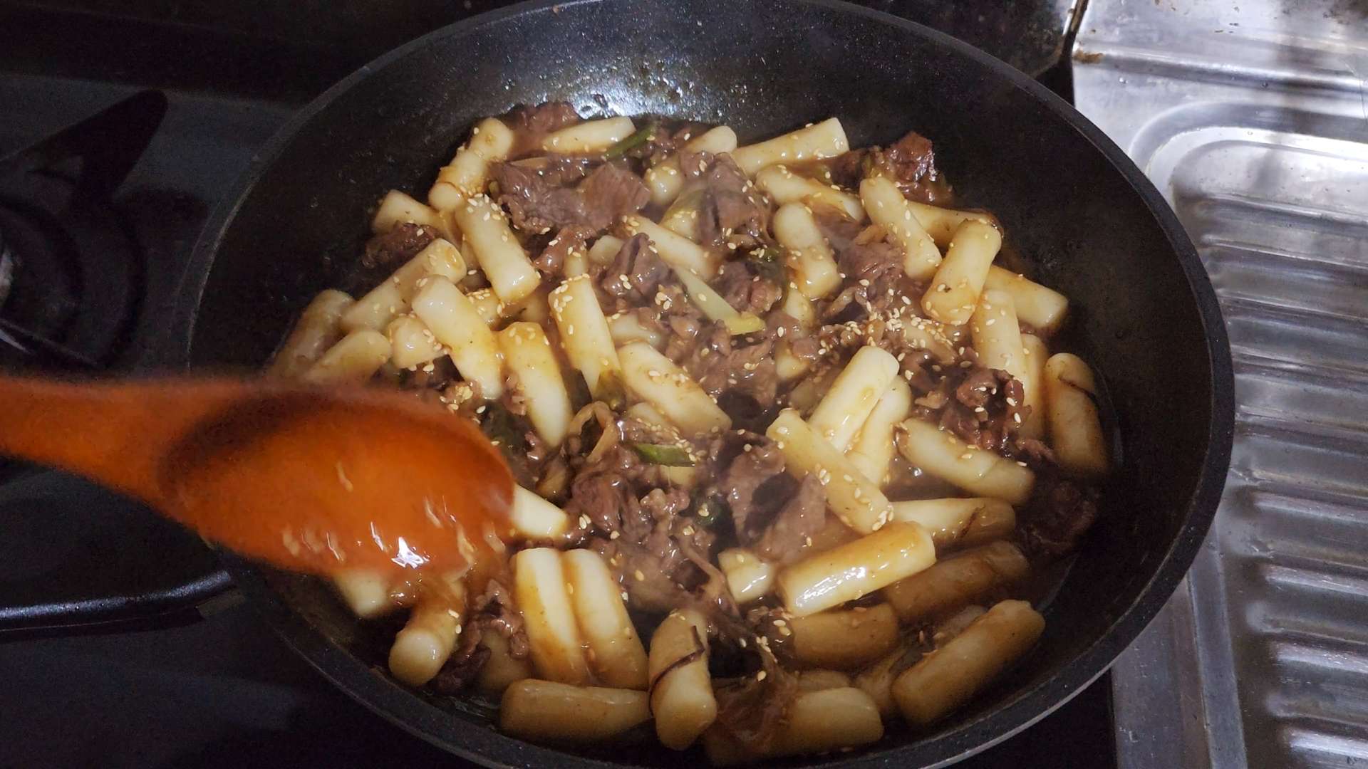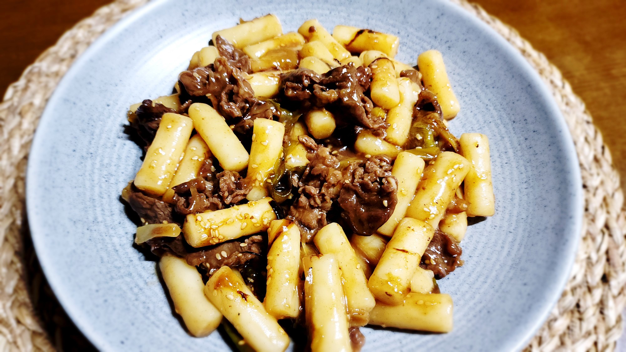 재료: 소고기 불고기용 200g, 쌀 떡볶이떡 500g, 대파 2대, 소금 2꼬집, 참기름 1T, 식용유 1바퀴, 통깨, 진간장 6T, 굴소스 2T, 설탕 2T, 다진마늘 1T,