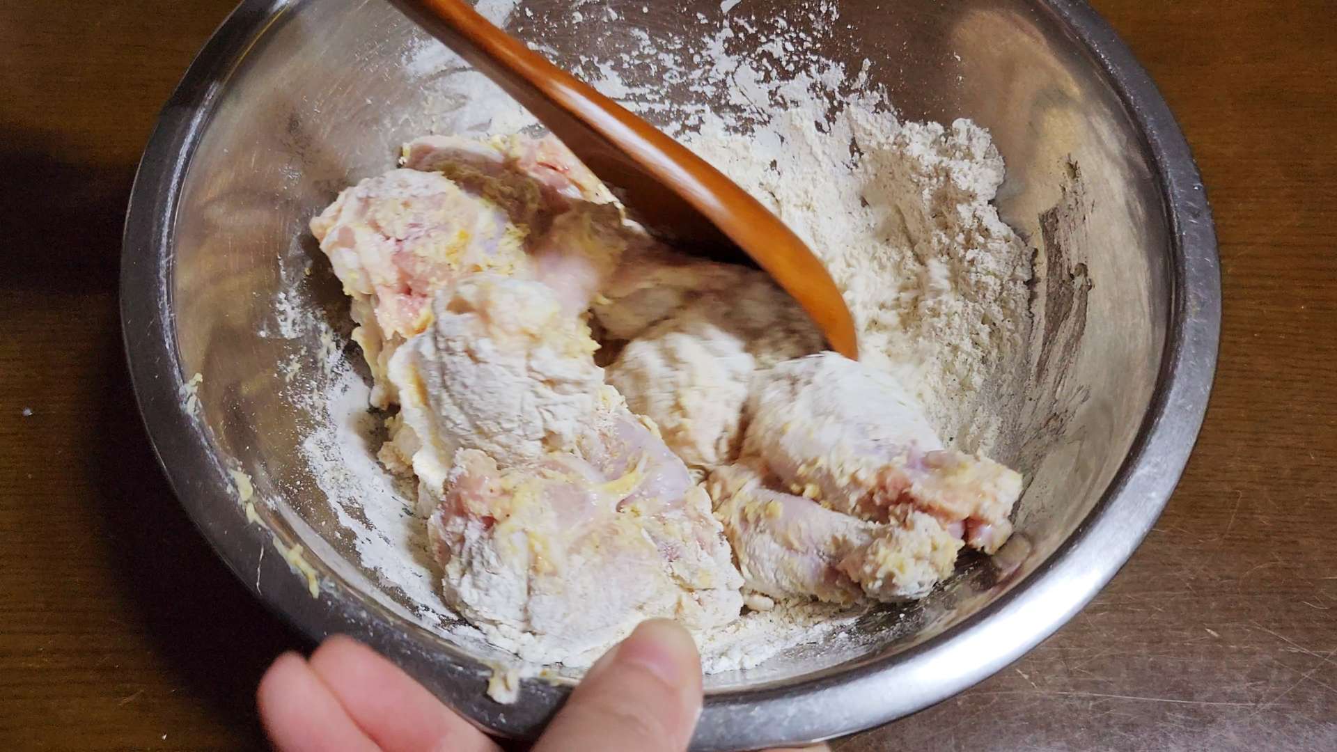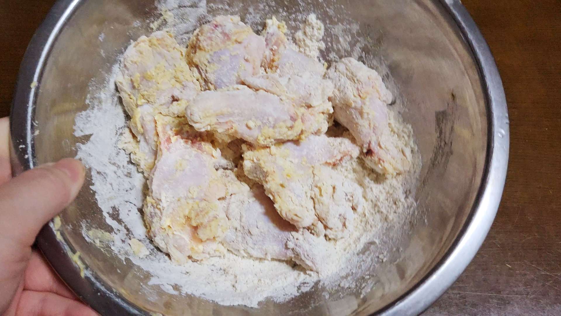 튀김가루에 닭봉을 넣고 섞어 30분간 둡니다.