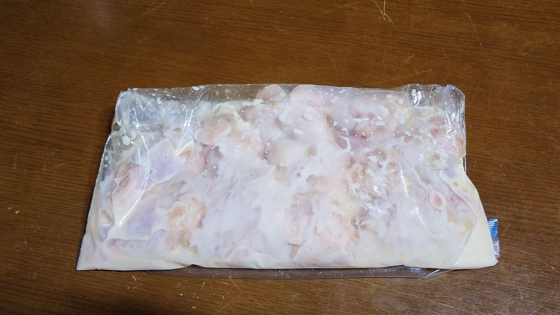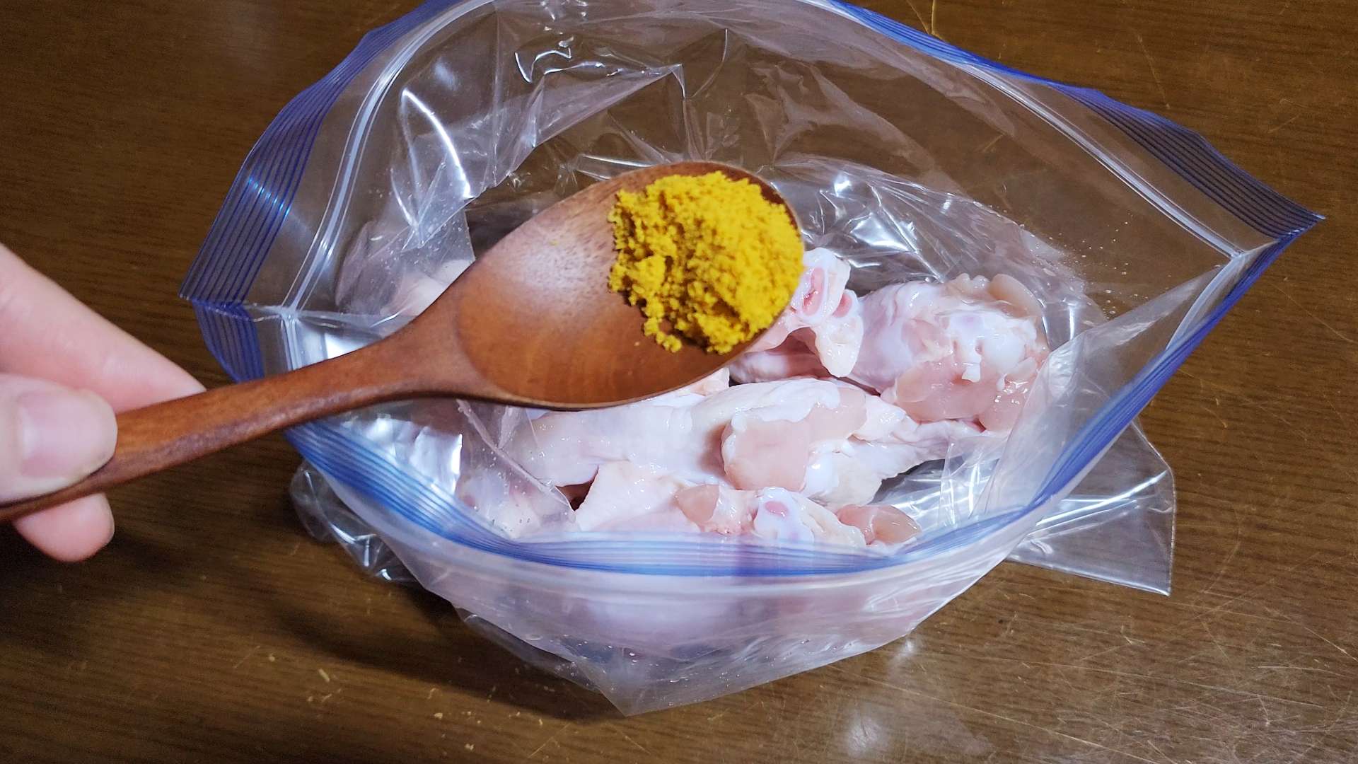 지퍼백에 닭봉, 카레가루 0.5T, 우유 50ml를 넣고 섞어줍니다.