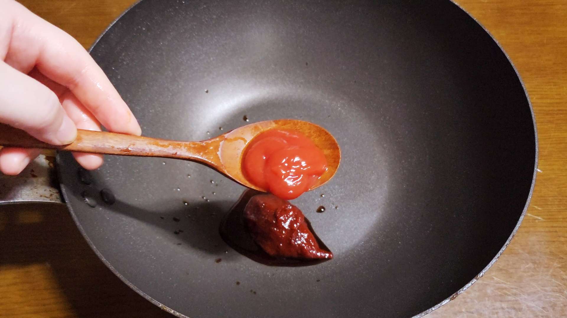 팬에 진간장 0.5T, 고추장 0.5T, 케첩 1T, 설탕 2T, 다진마늘 0.5T, 다진생강 1t, 통깨 0.5T, 전분물,