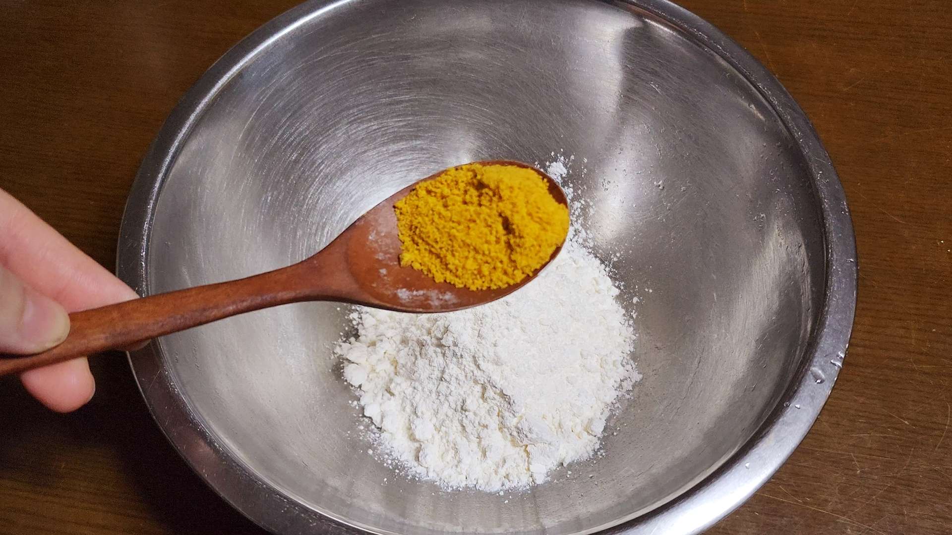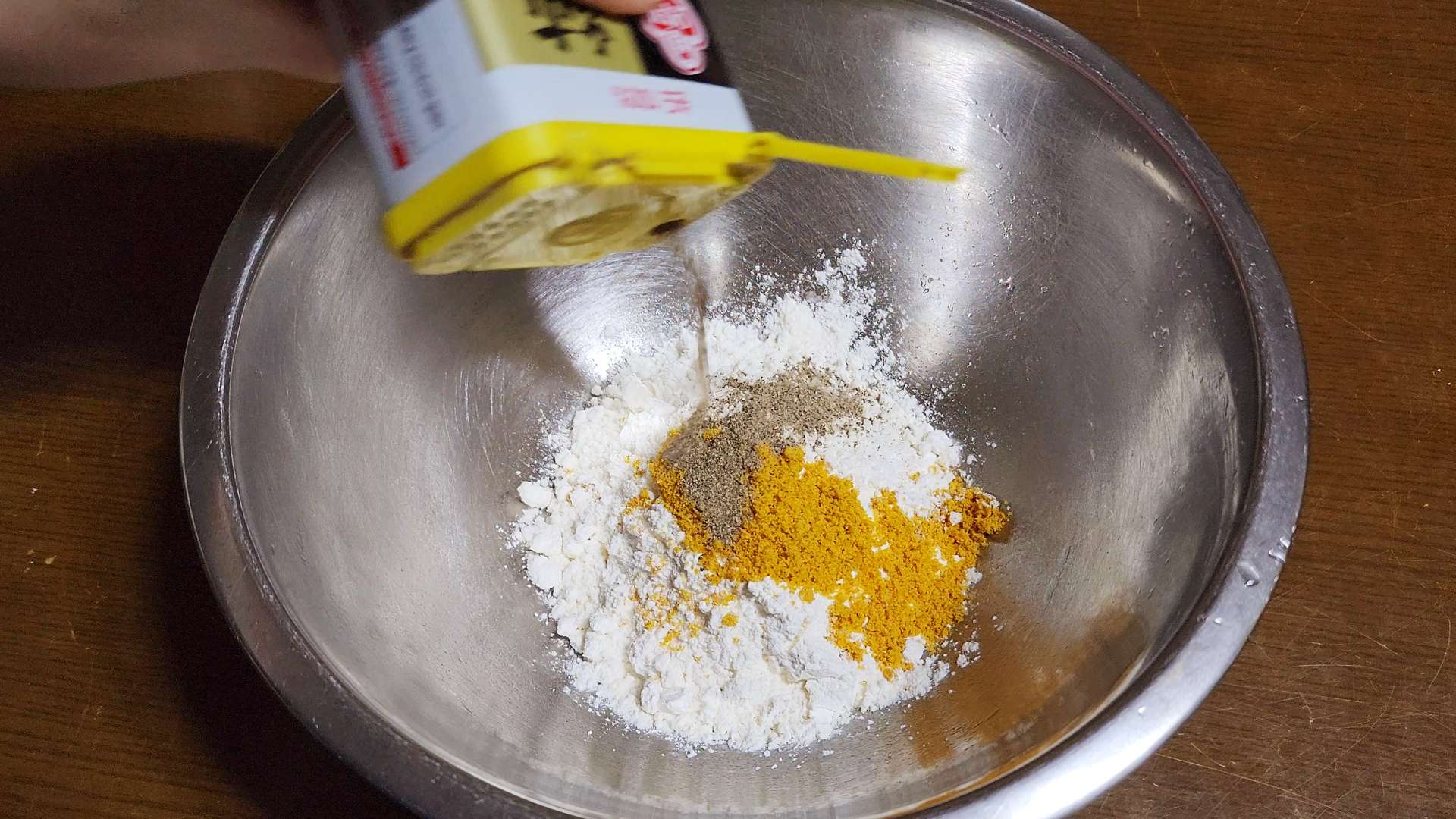 볼에 튀김가루 100g, 카레가루 1T, 후추 1T를 섞어줍니다.
