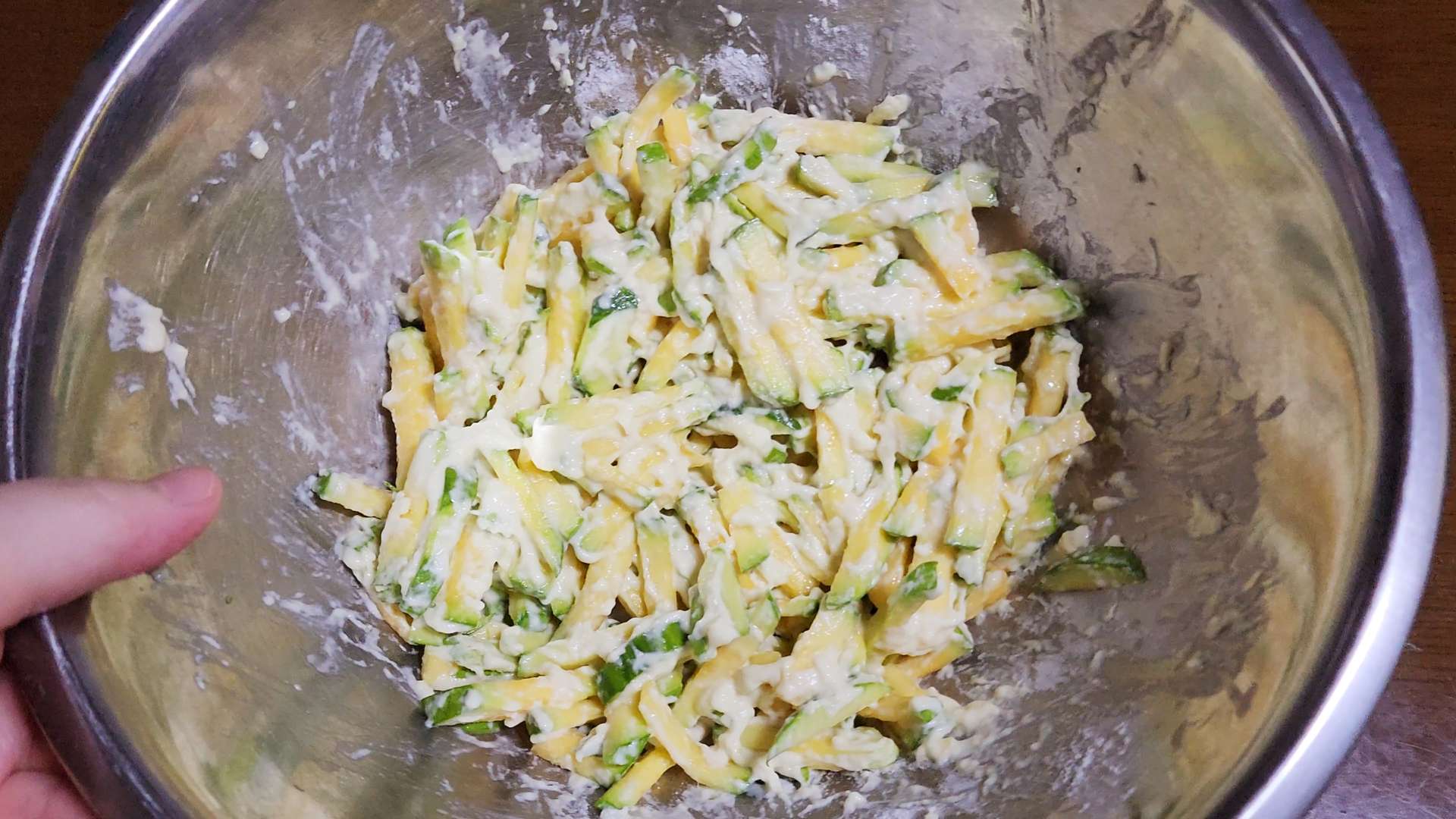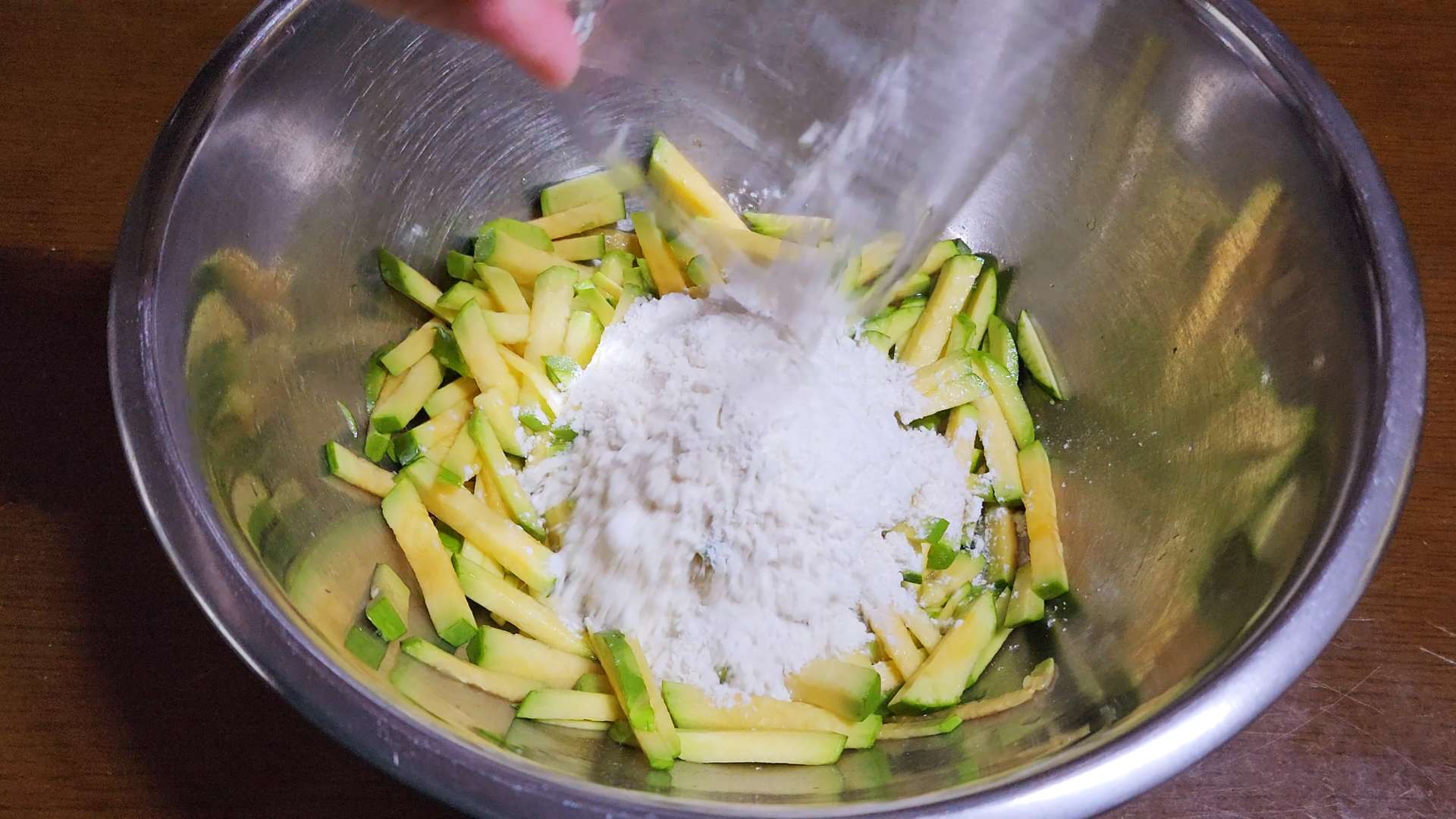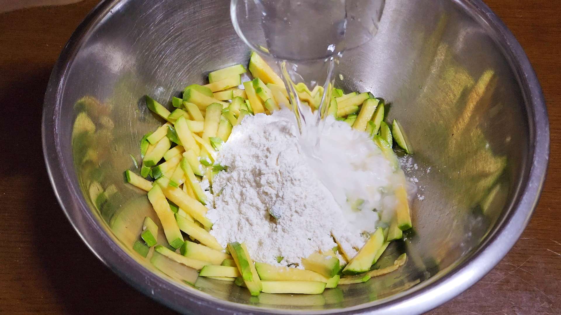 재료: 애호박 1개, 홍고추 1개, 부침가루 100g,