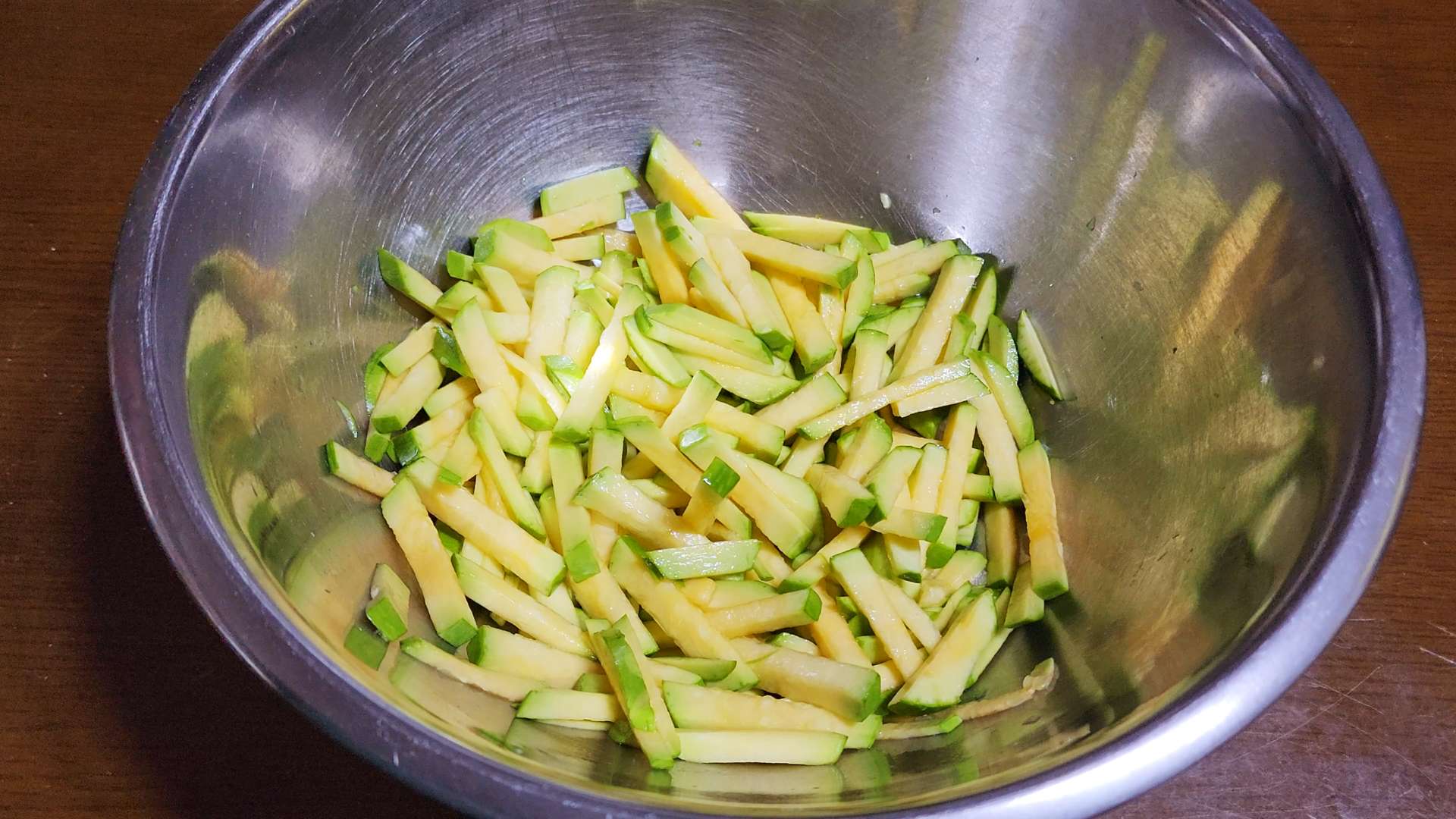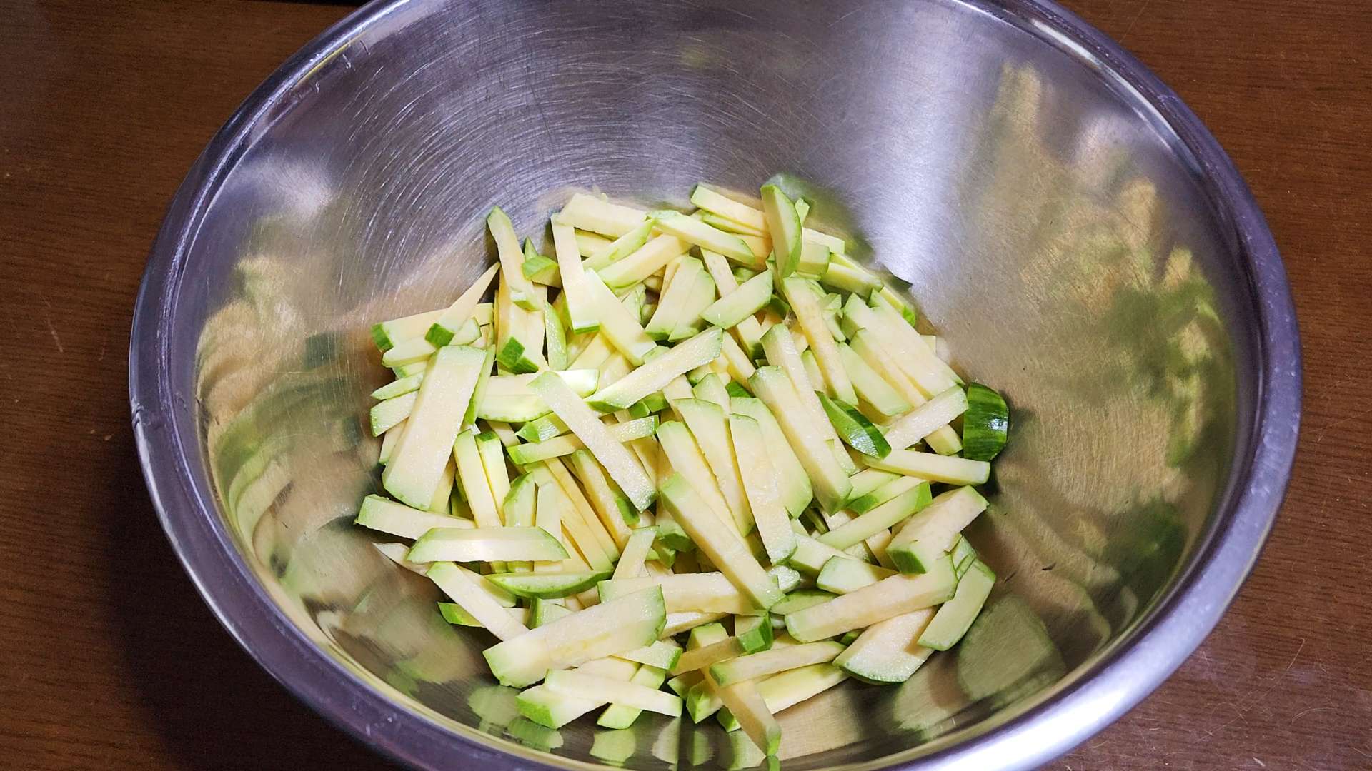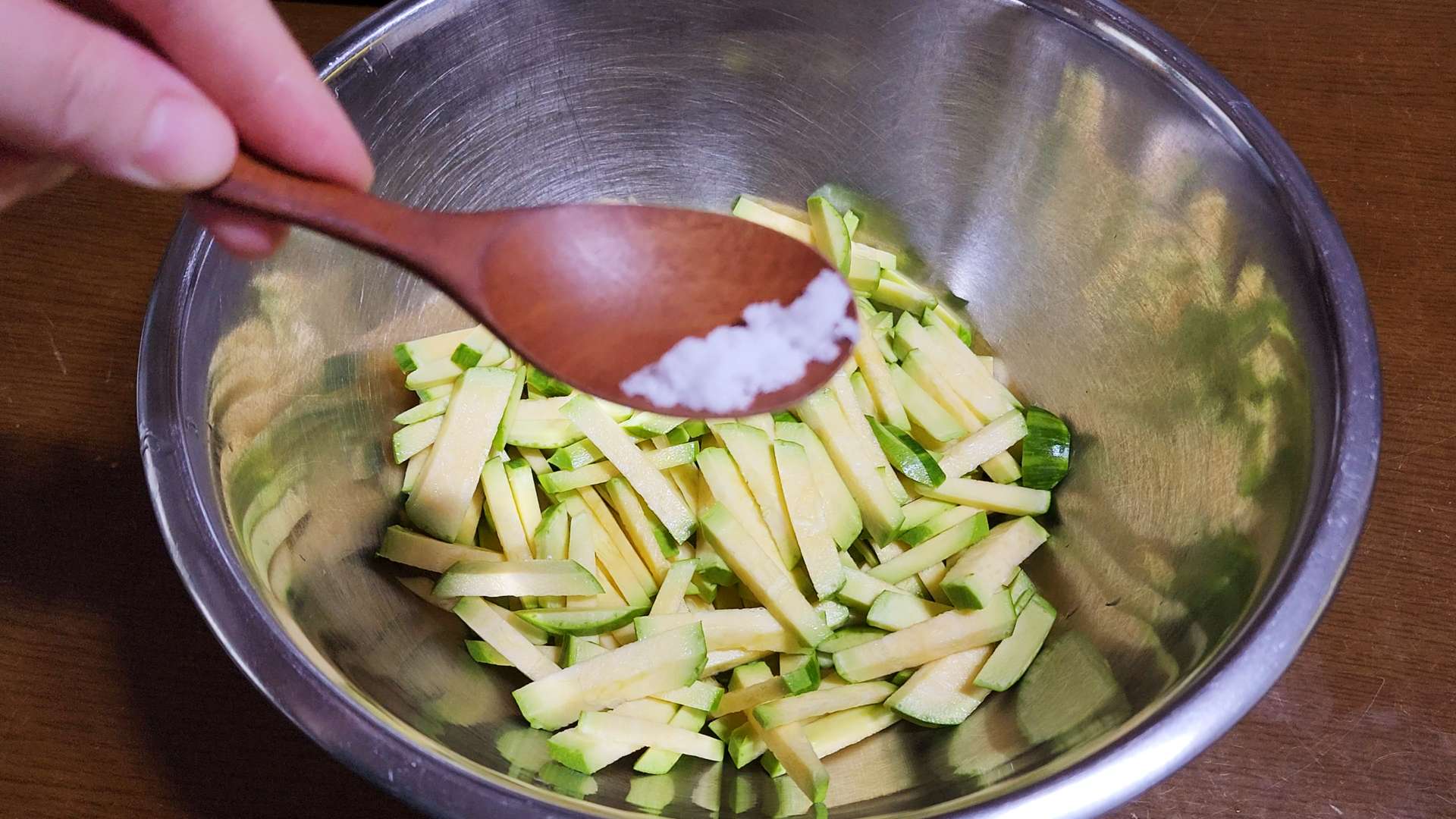 애호박, 소금 1t 넣고 섞어 촉촉해 질때까지 절여줍니다.