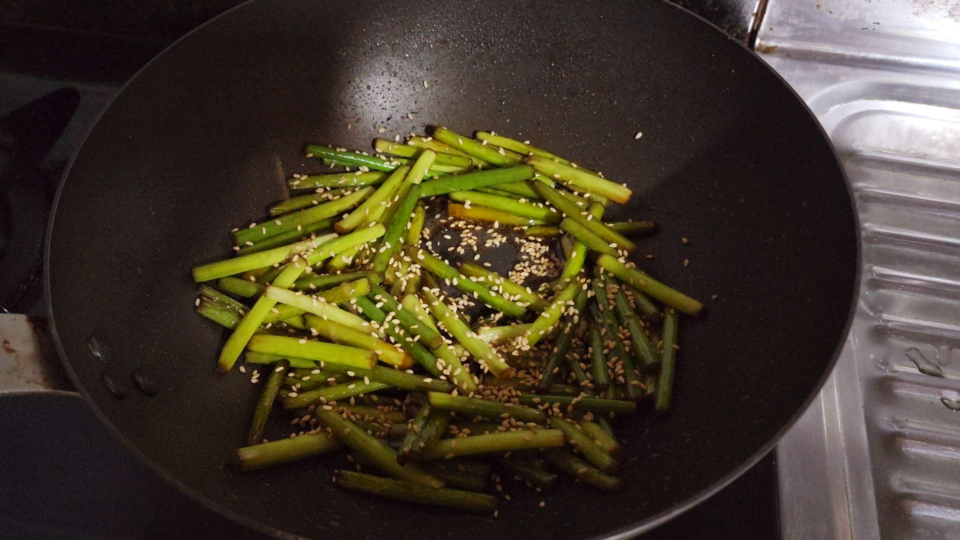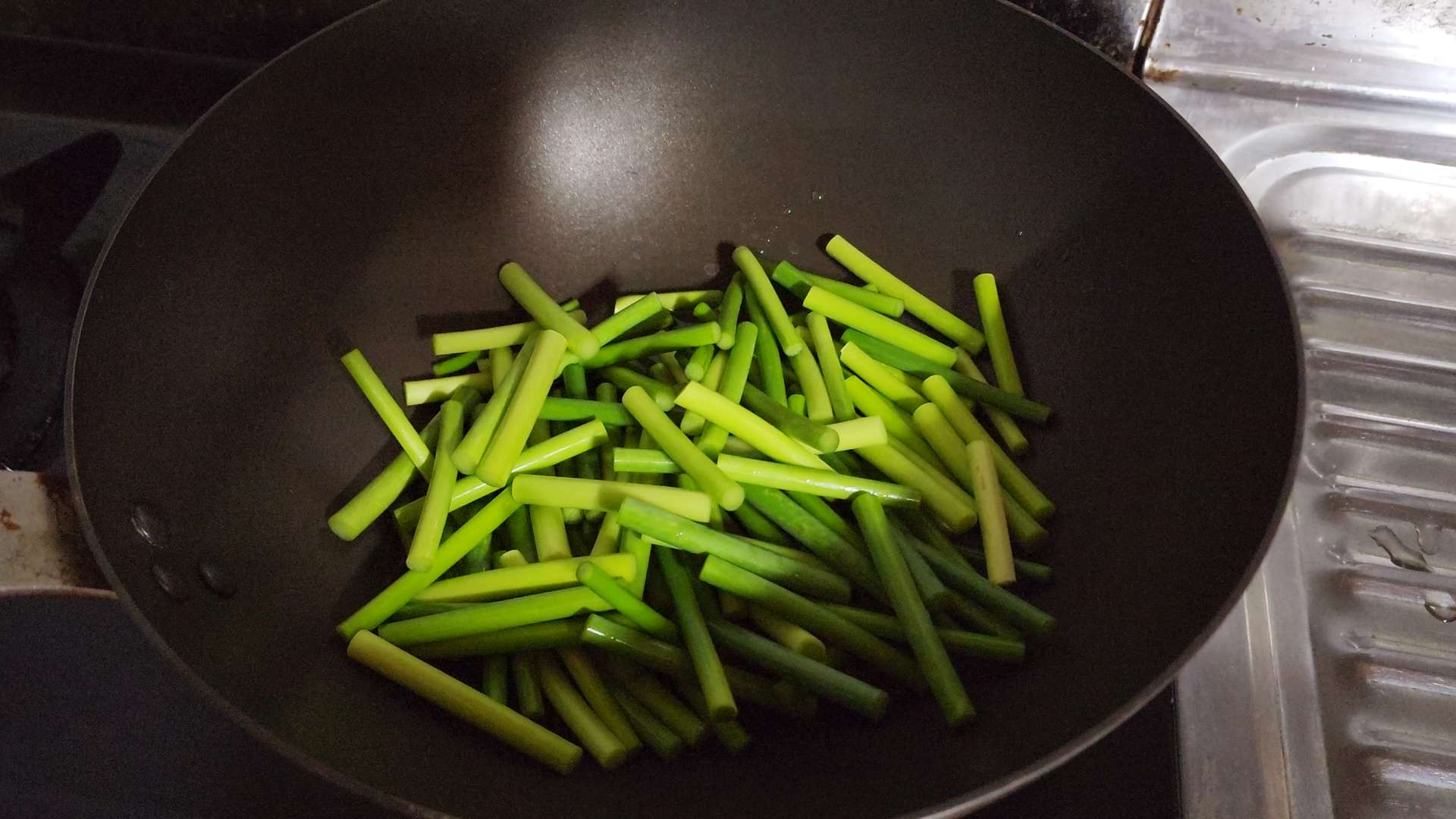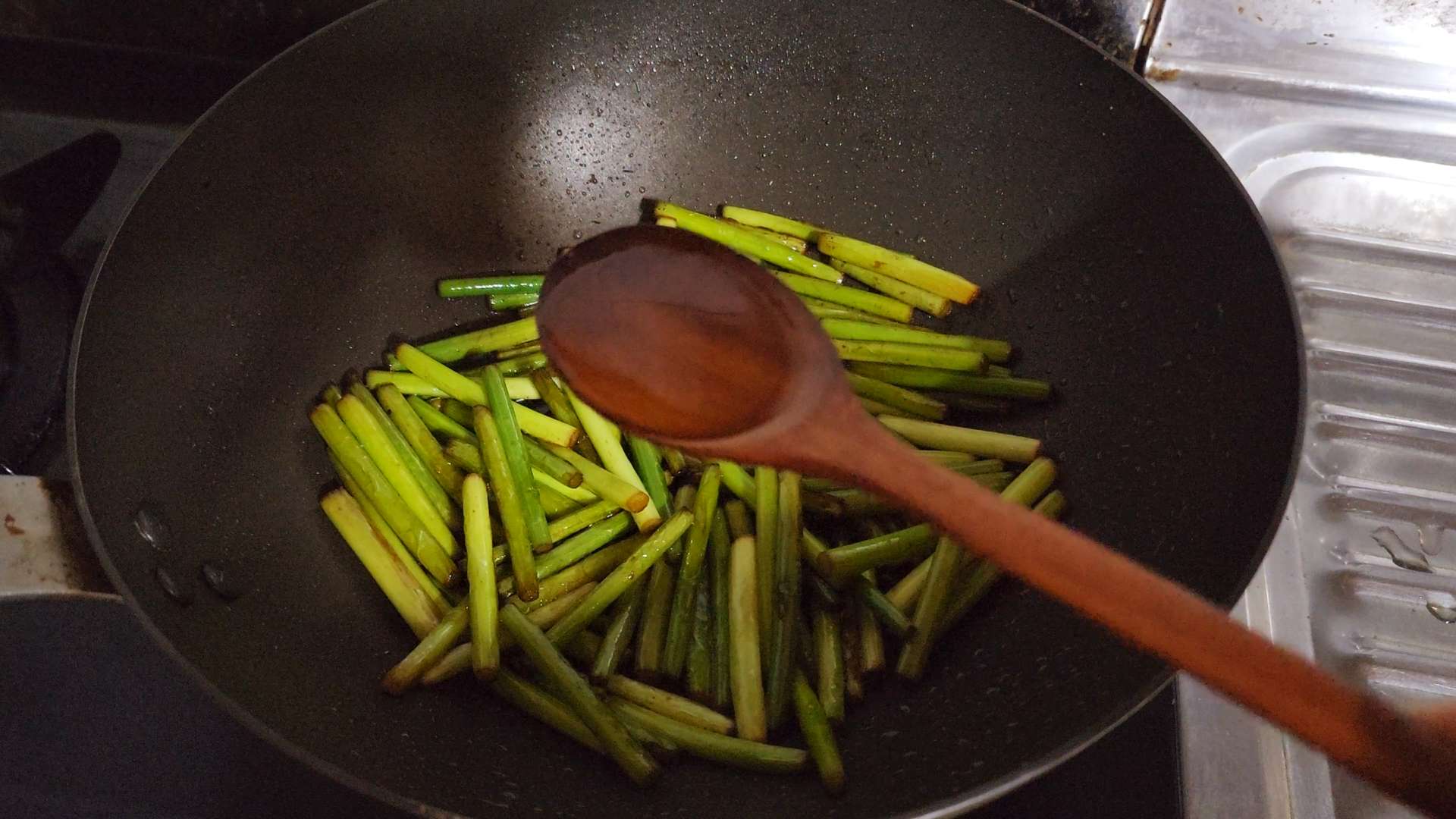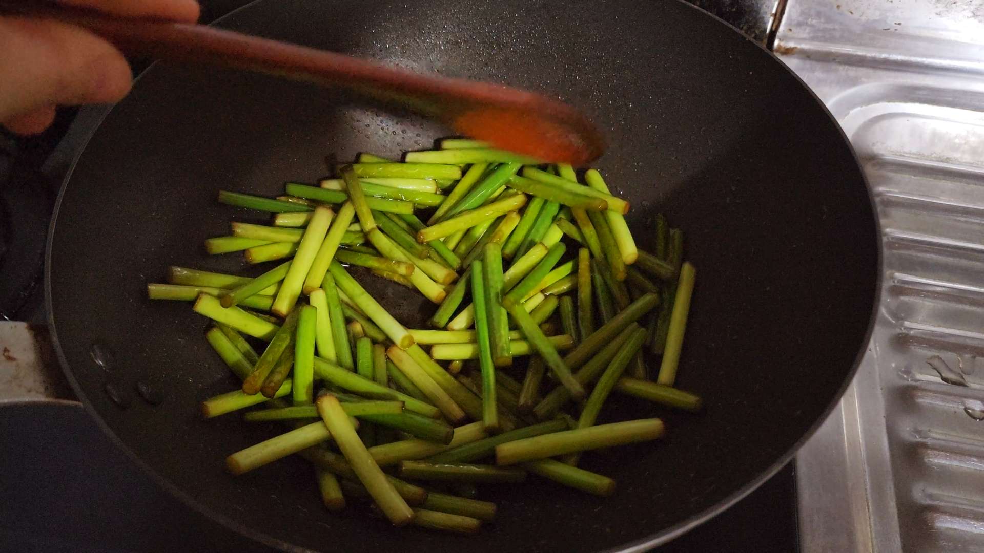 강불로 달군팬에 식용유, 마늘쫑을 넣고 볶아줍니다.