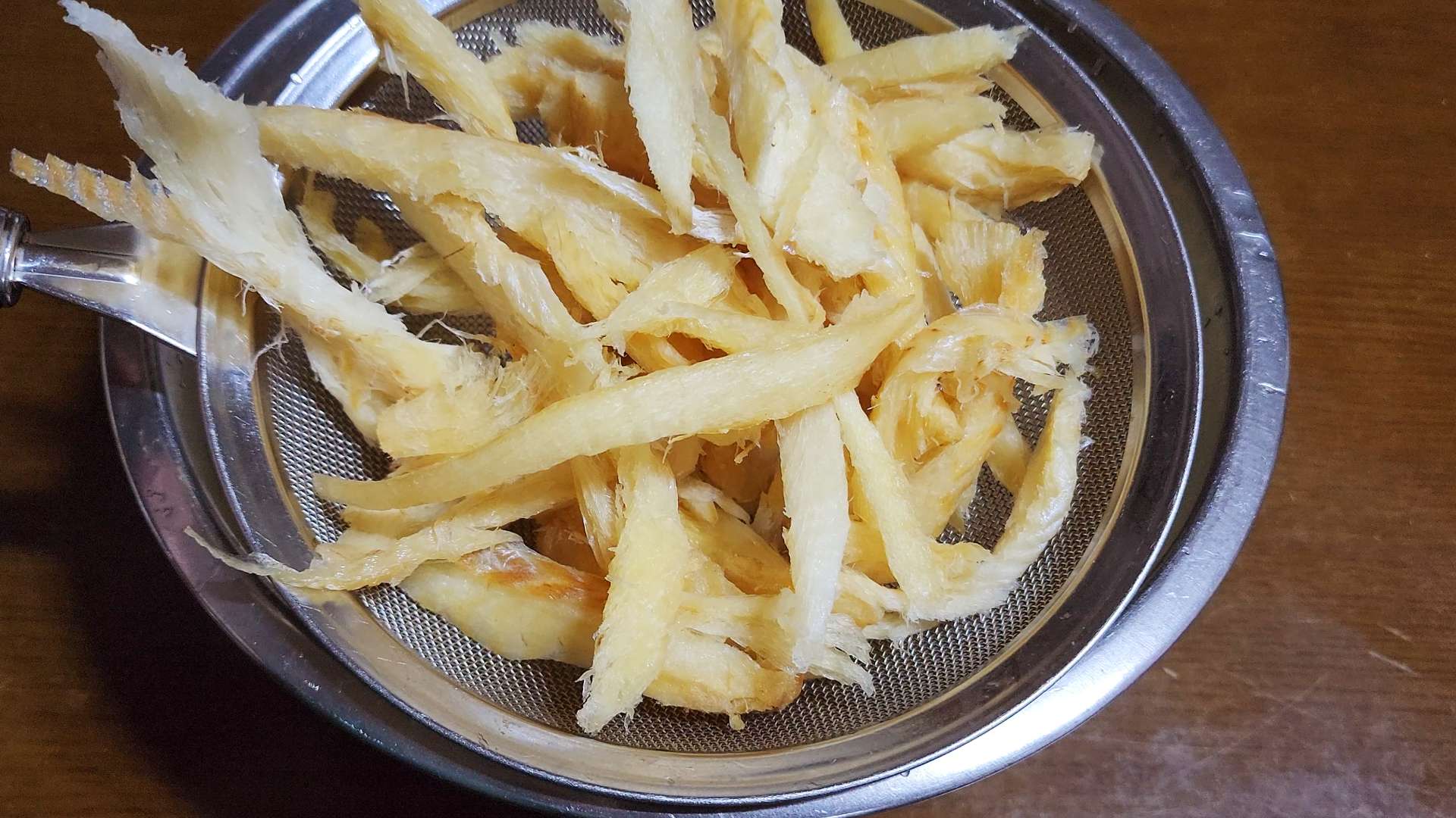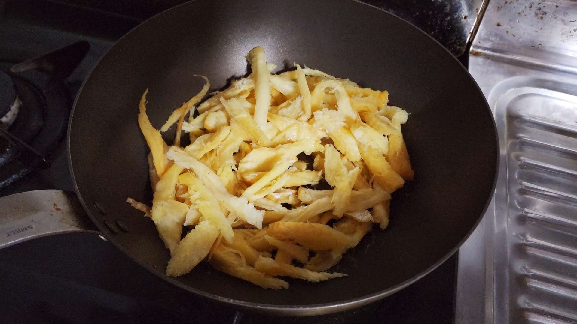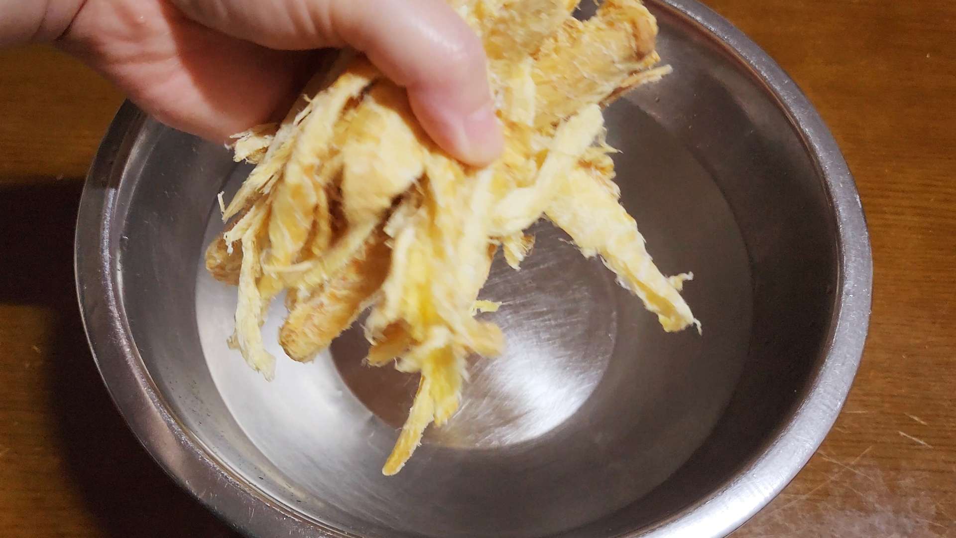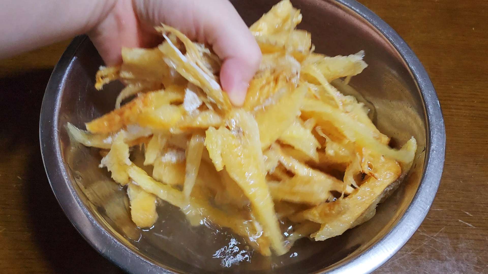 황태채는 먹기 좋은 크기로 자르고 물에 헹구고 물기를 짜줍니다.