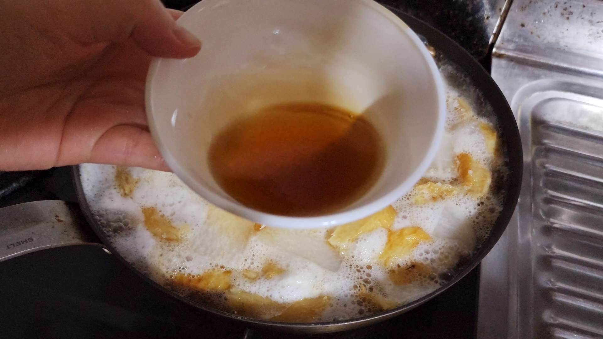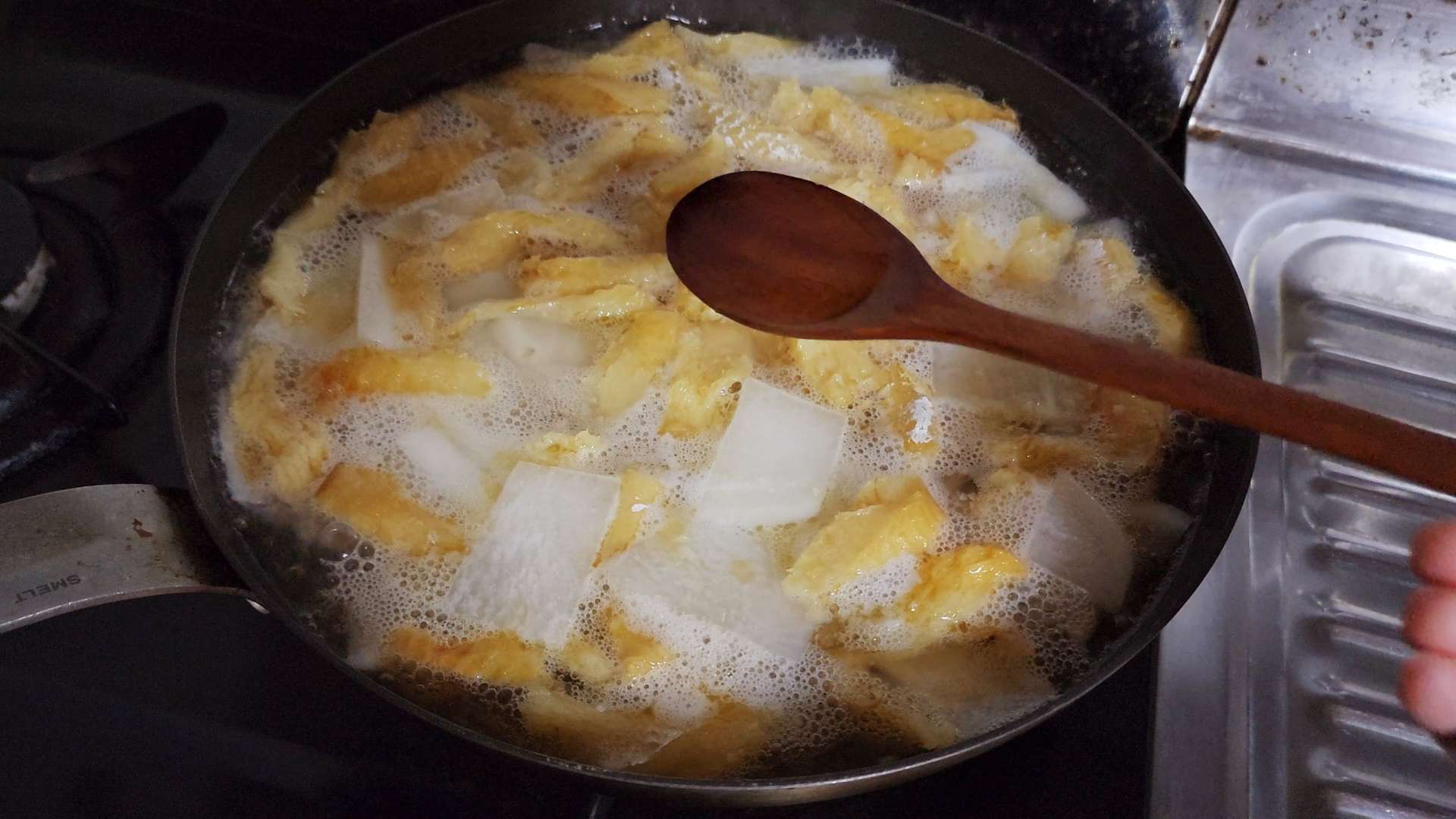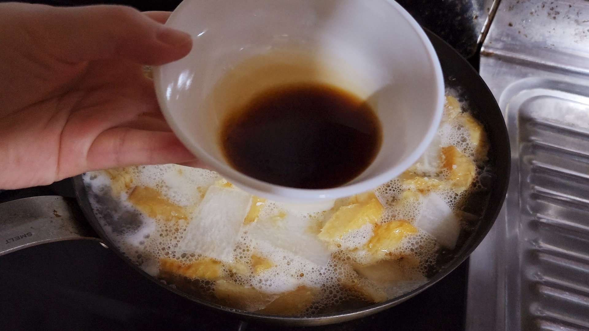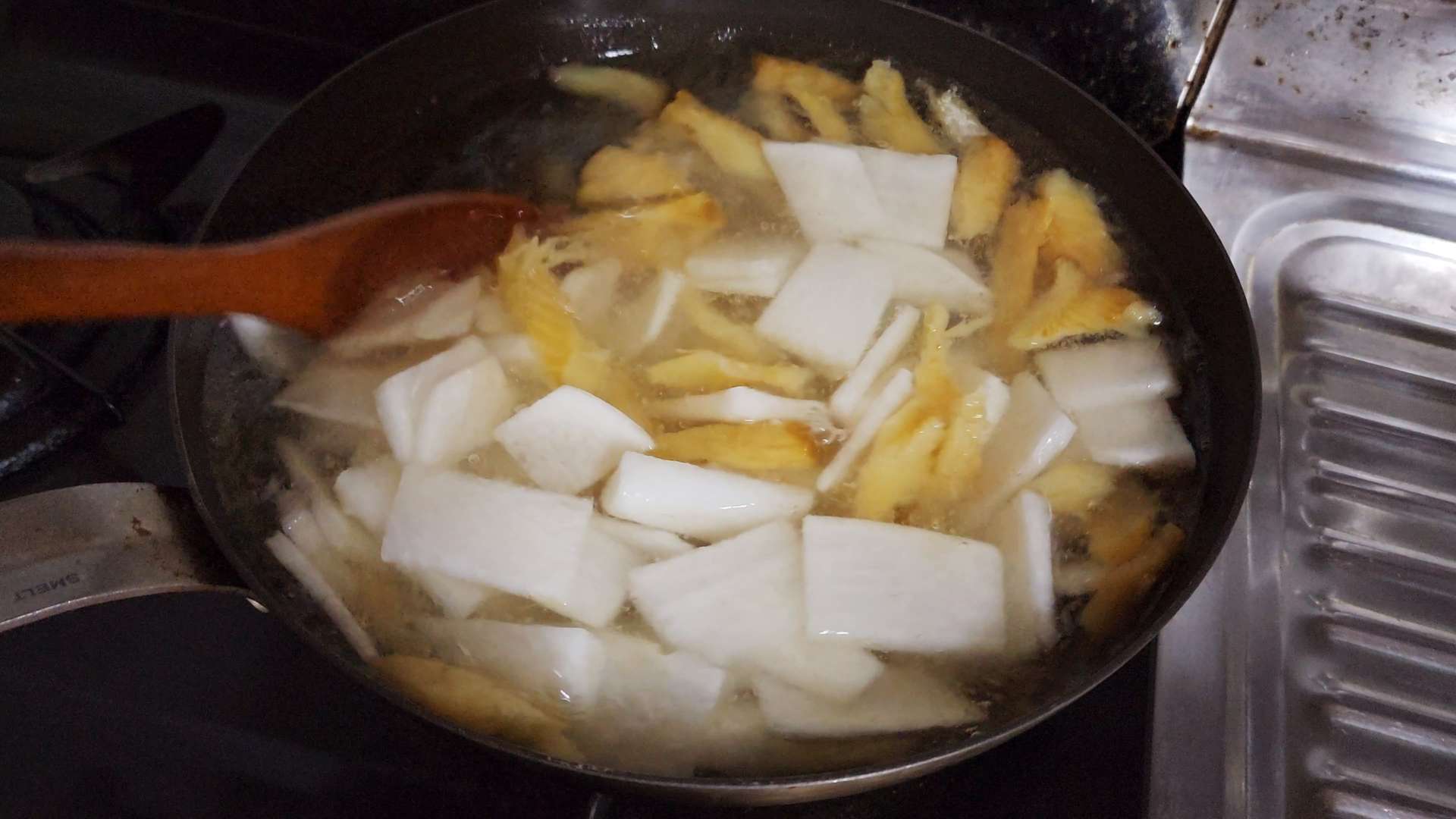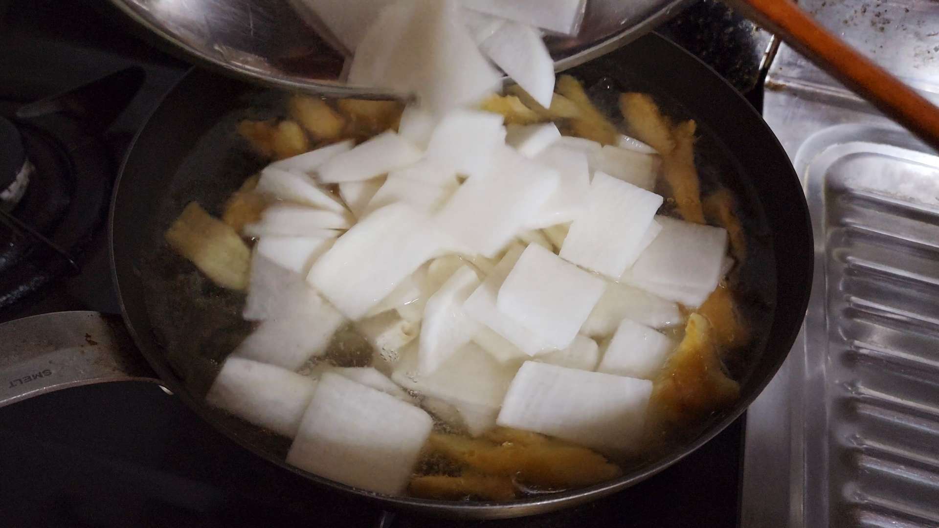 마늘이 노릇해지면 물 2L, 무를 넣고 강불에서 끓여줍니다.