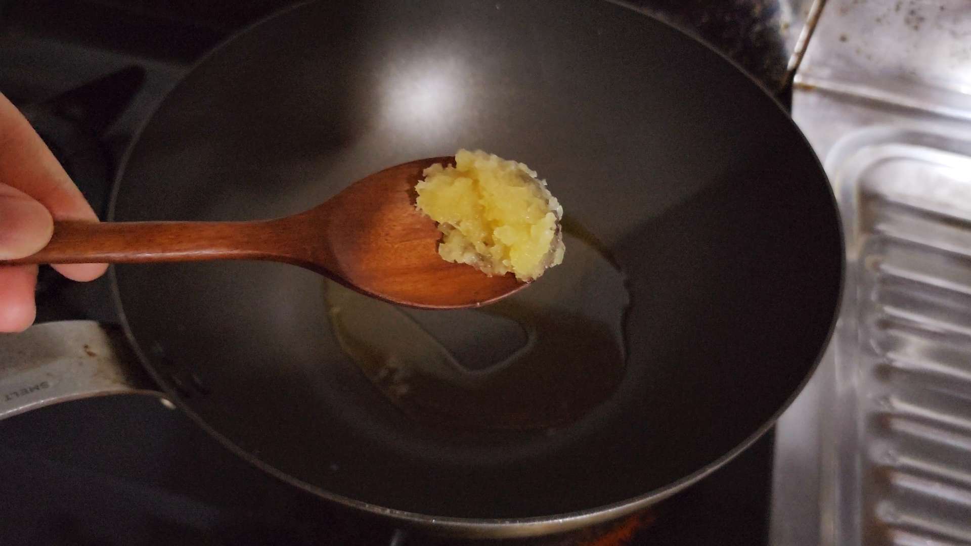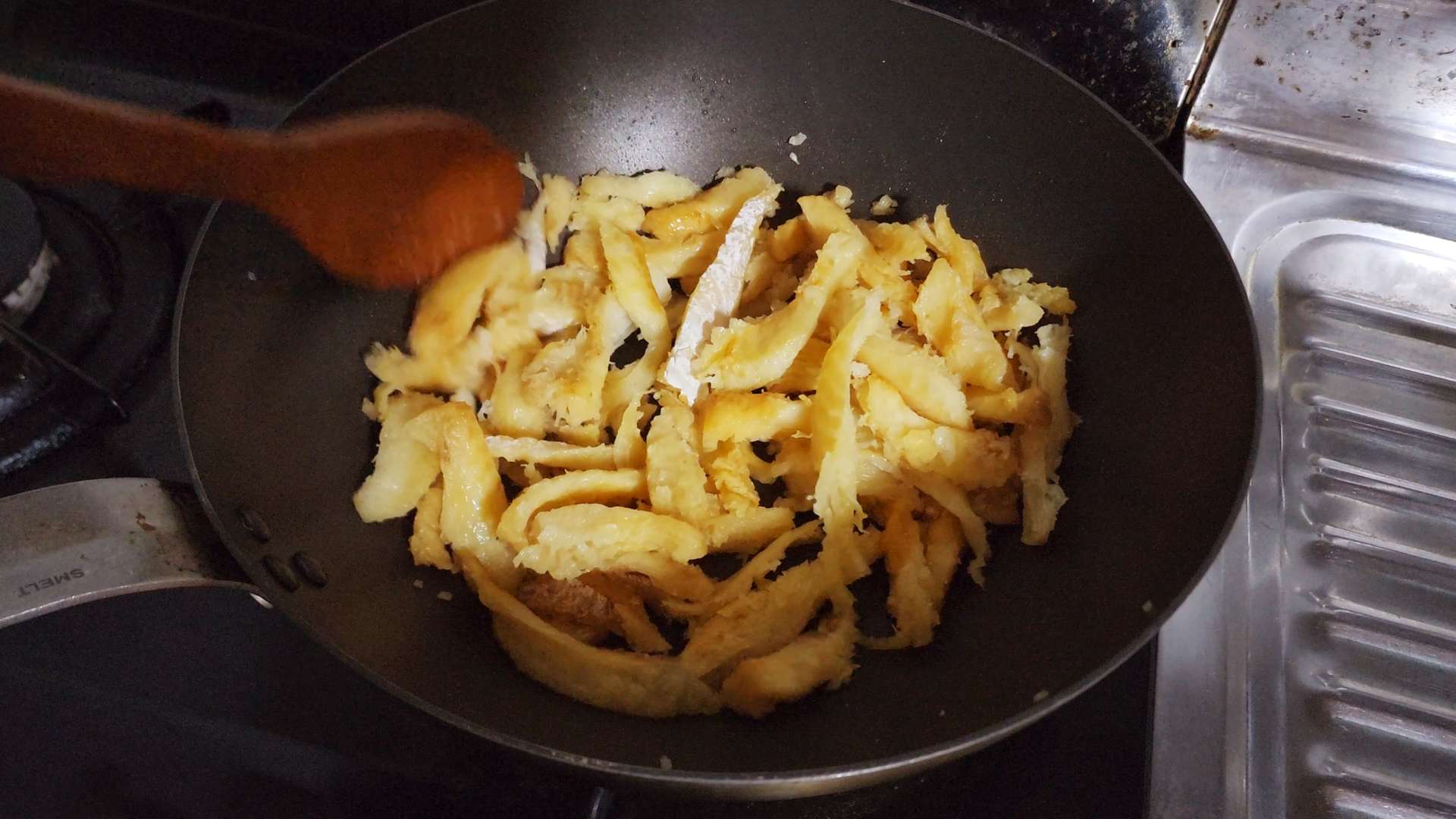 중불로 달군팬에 참기름 3T, 다진마늘 1/2T, 황태채를 넣고 약불에서 볶아줍니다.