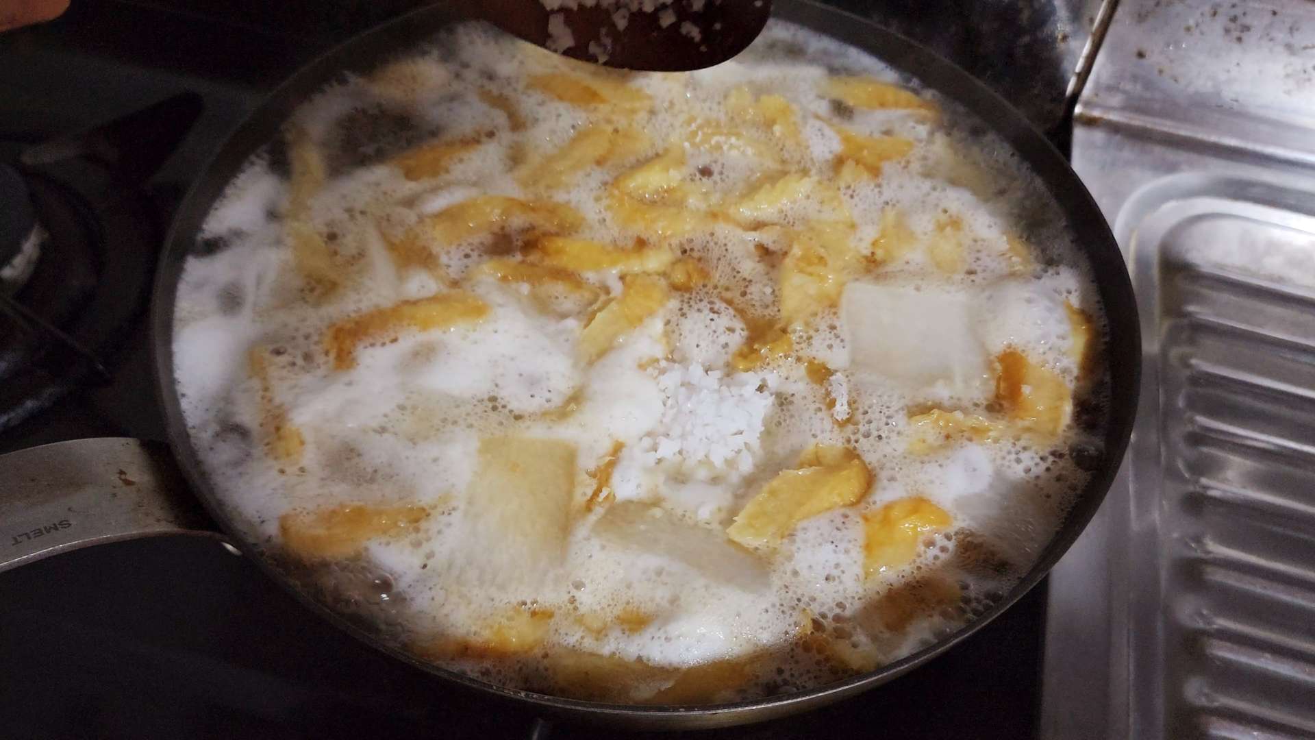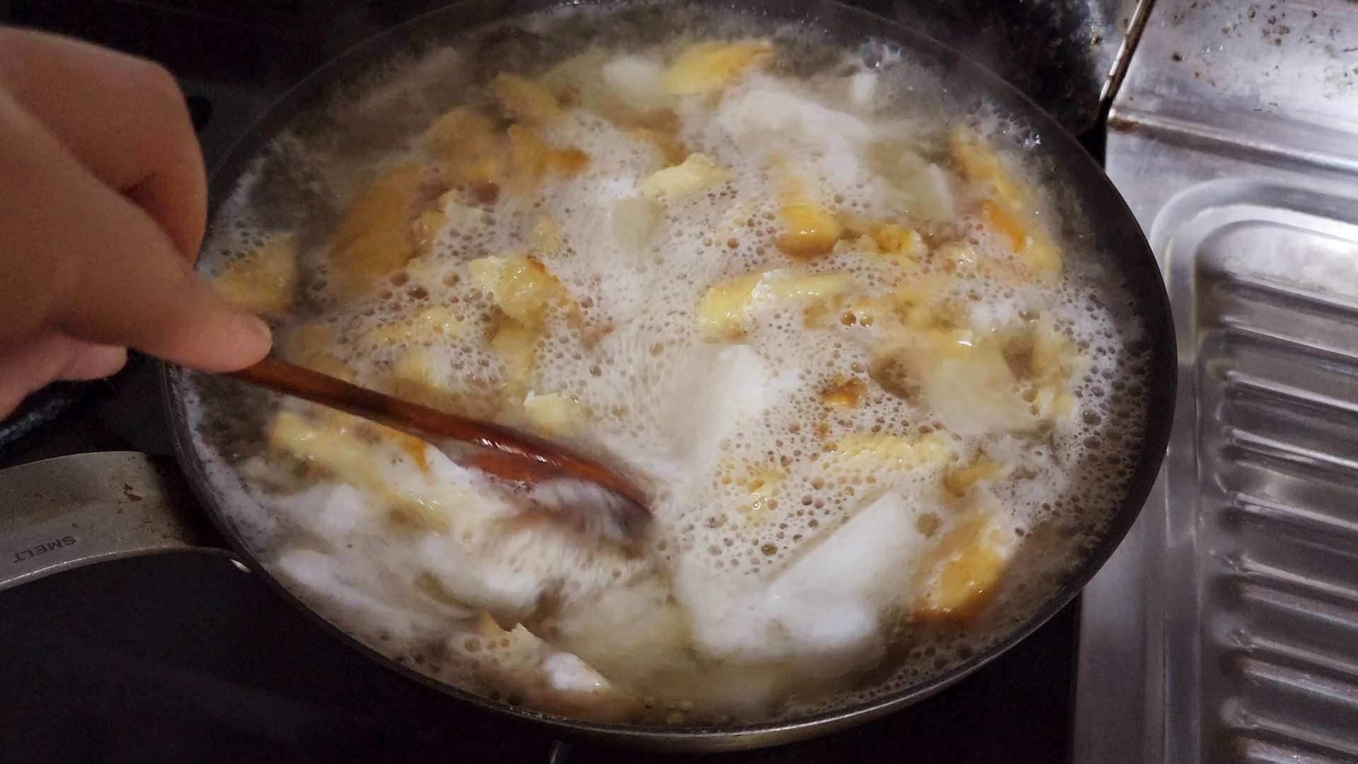 두부, 달걀물을 붓고 불을 끄고 잔열로 3분 익혀줍니다.