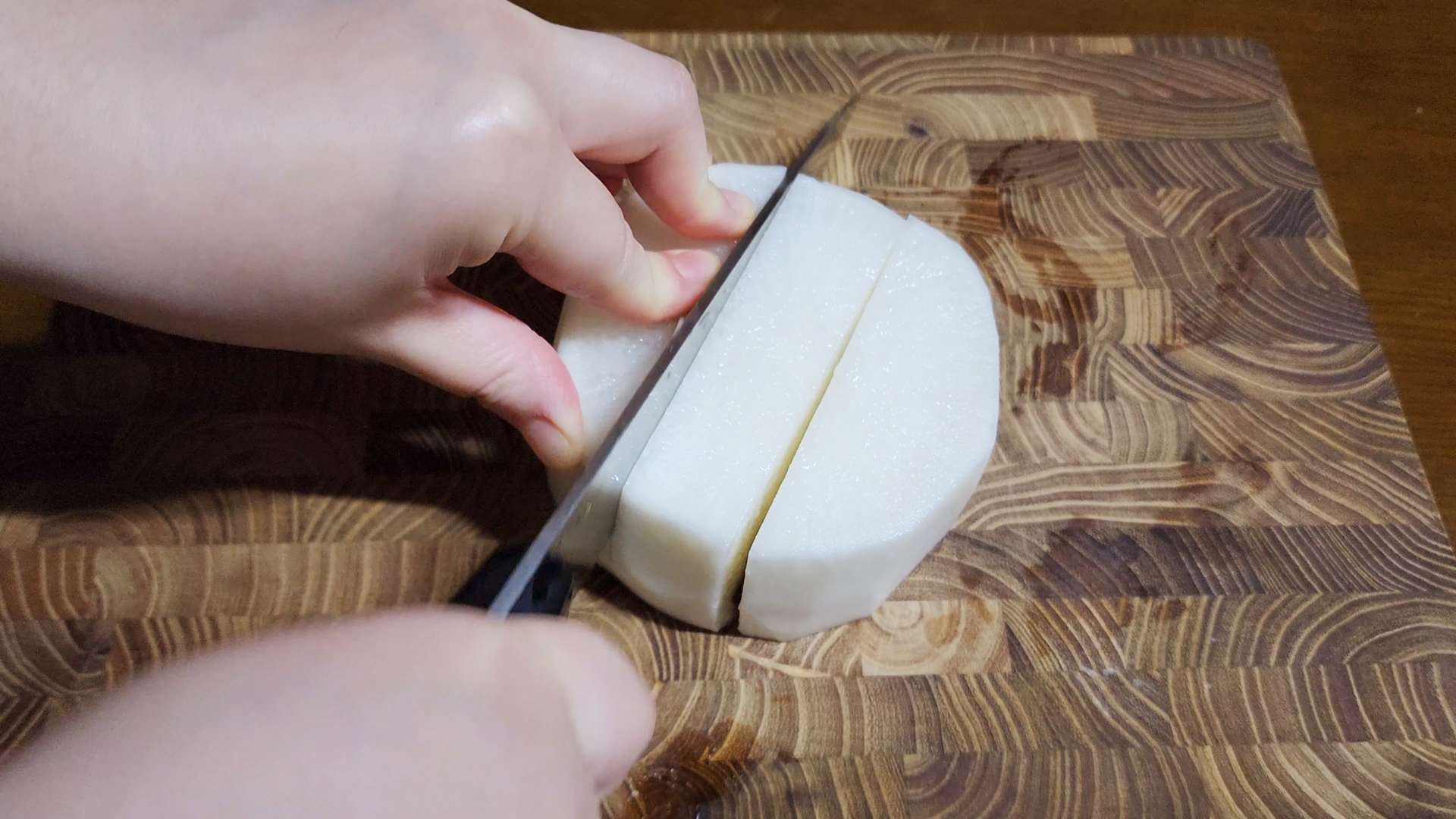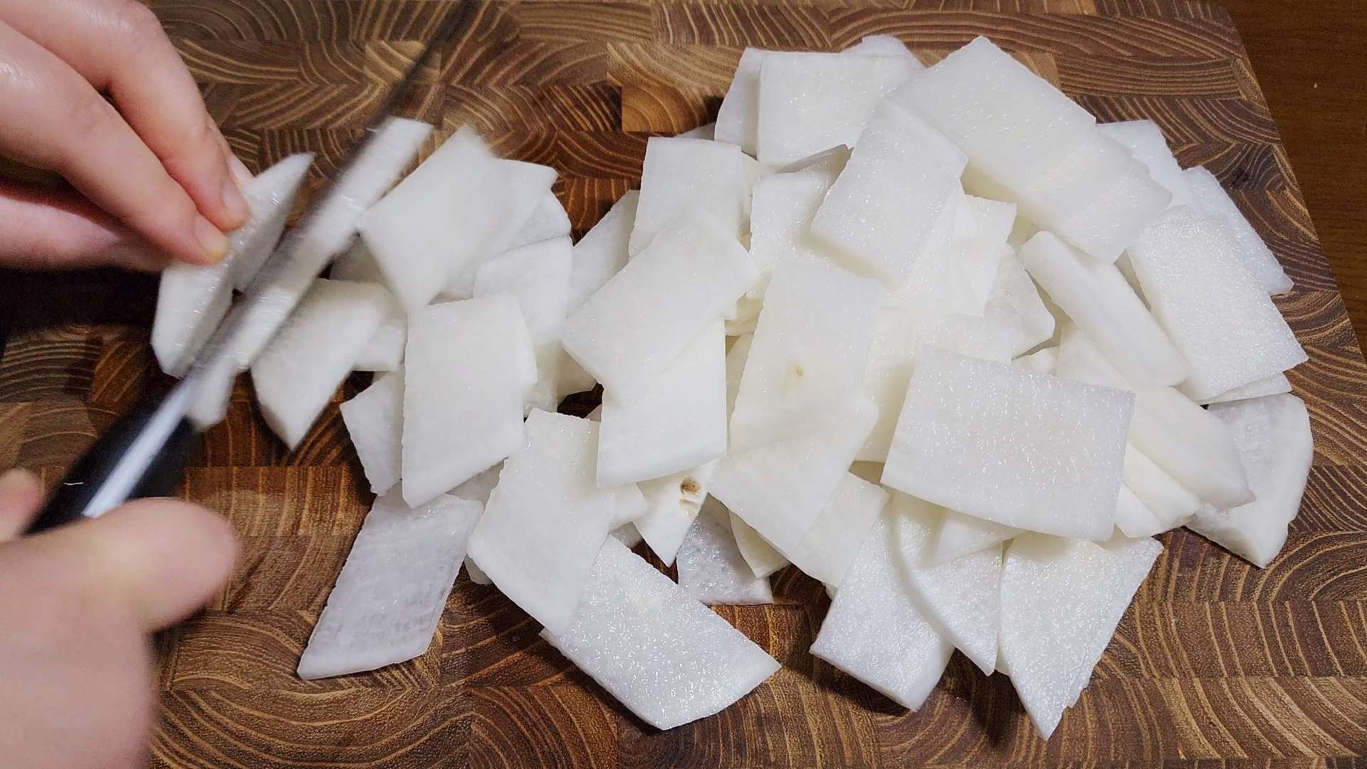 무는 껍질을 벗기고 나박하게 썰어줍니다.