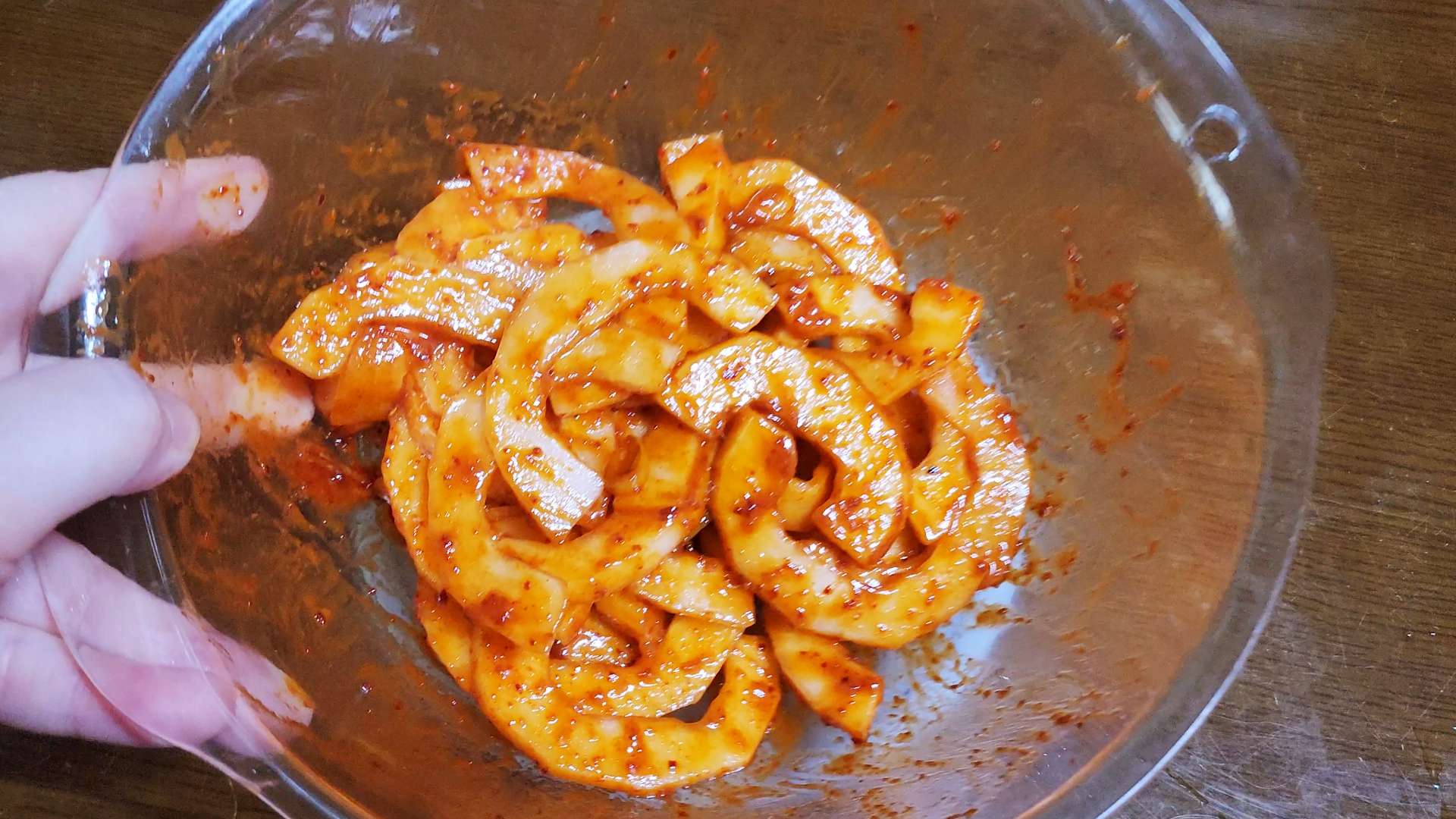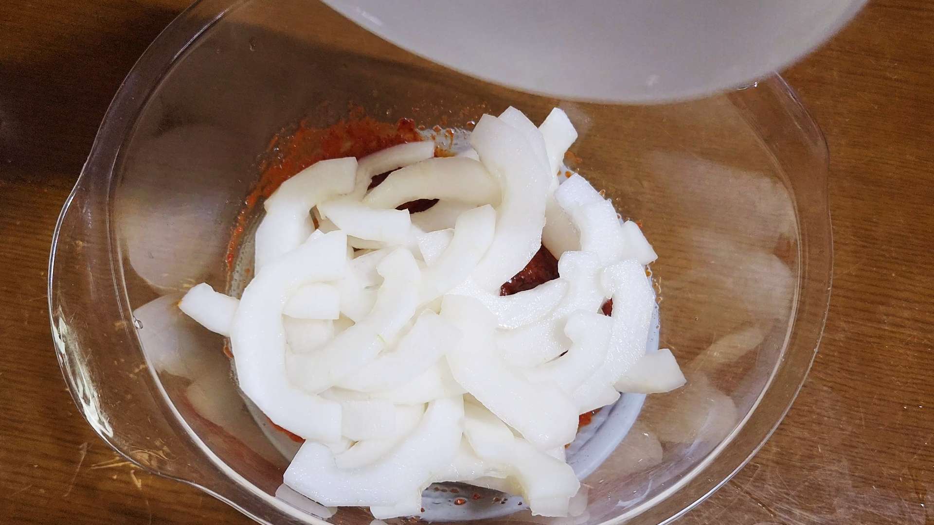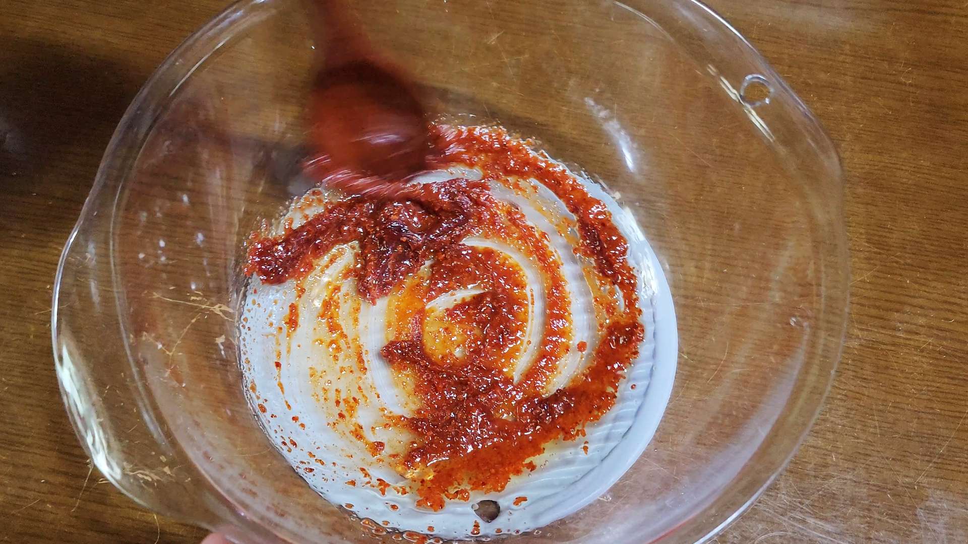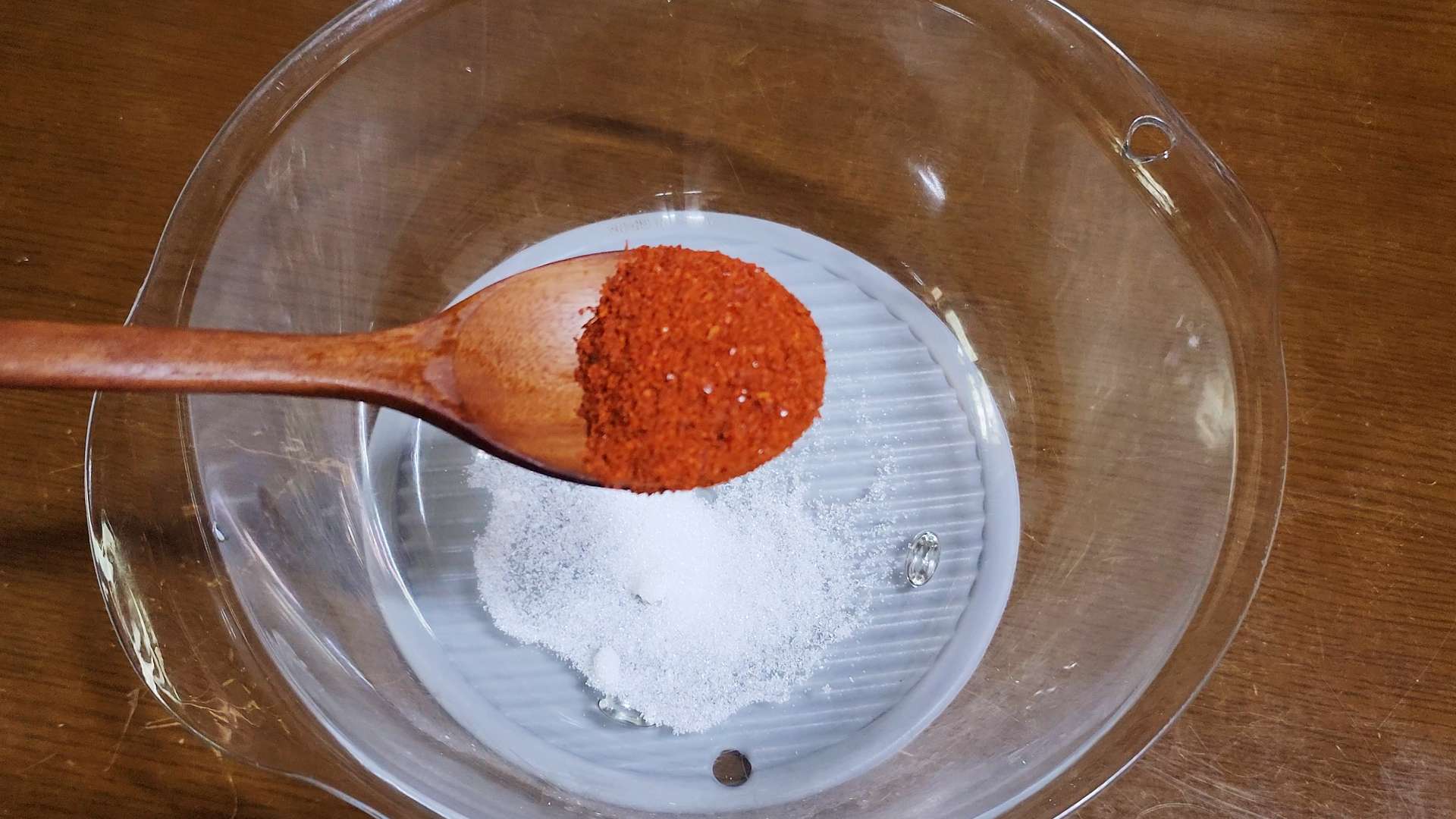 양념: 설탕 0.5T, 고춧가루 0.5T, 식초 1T,