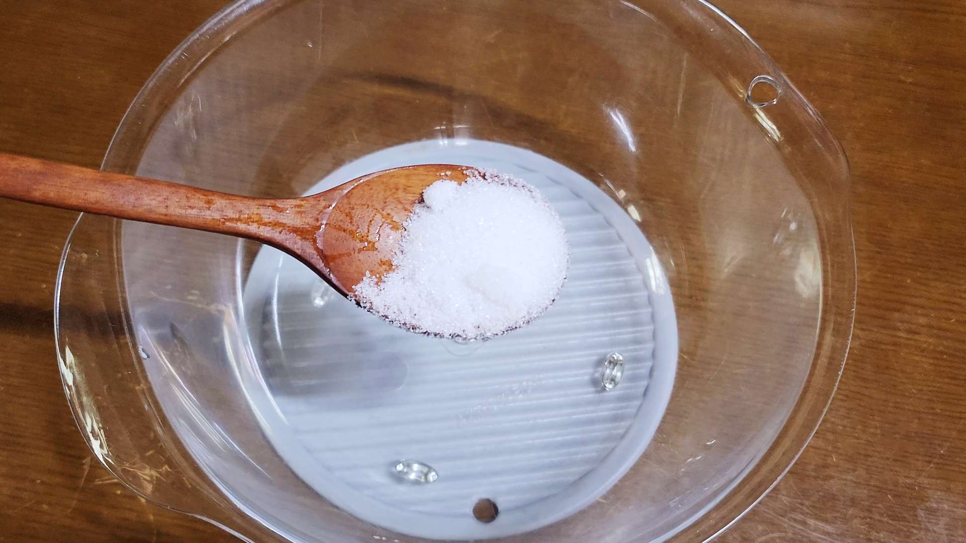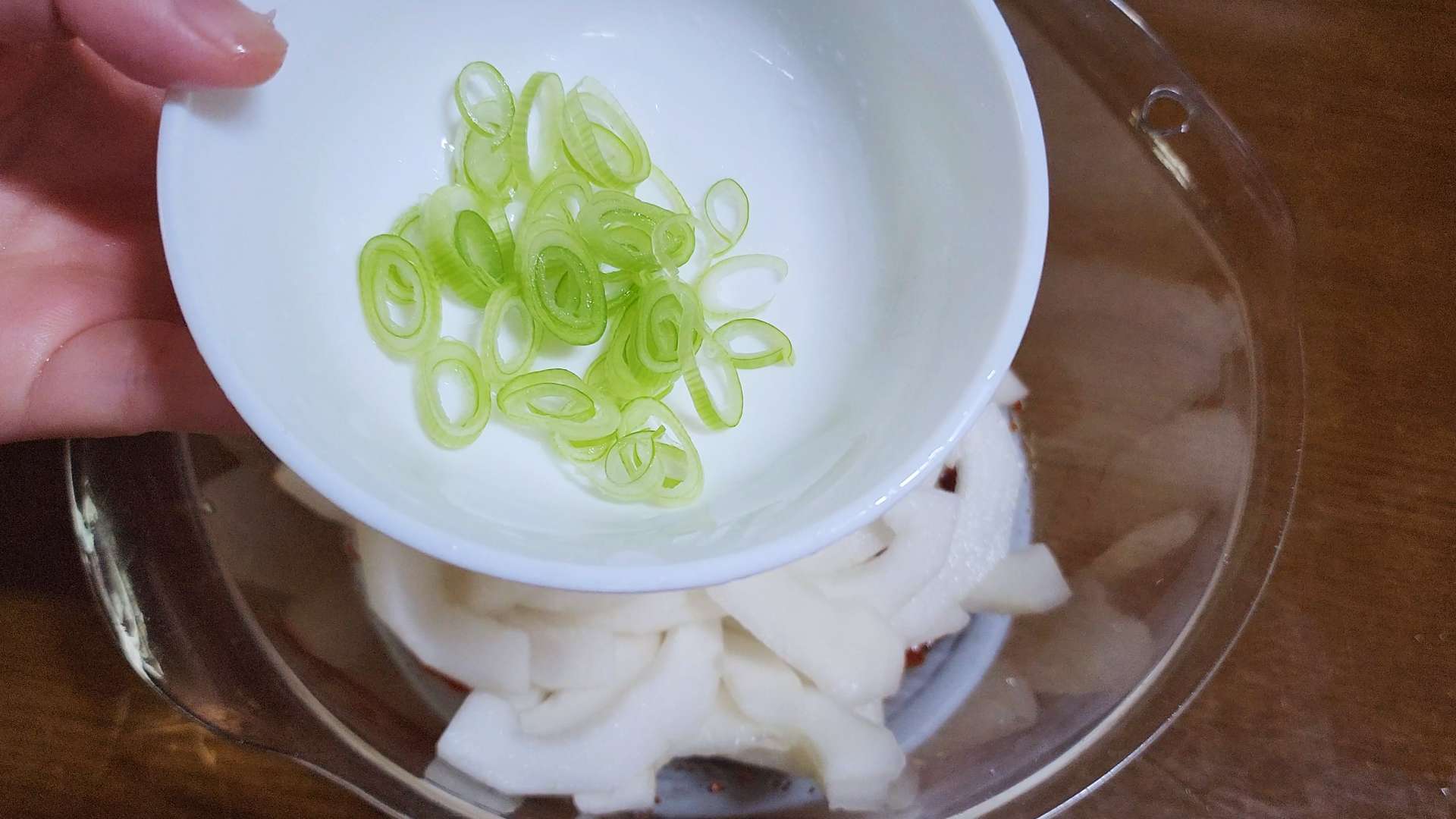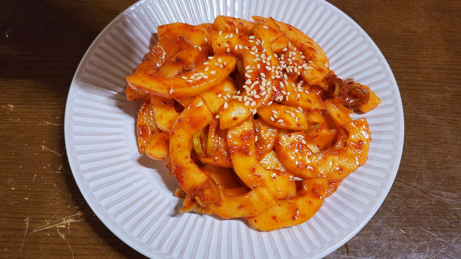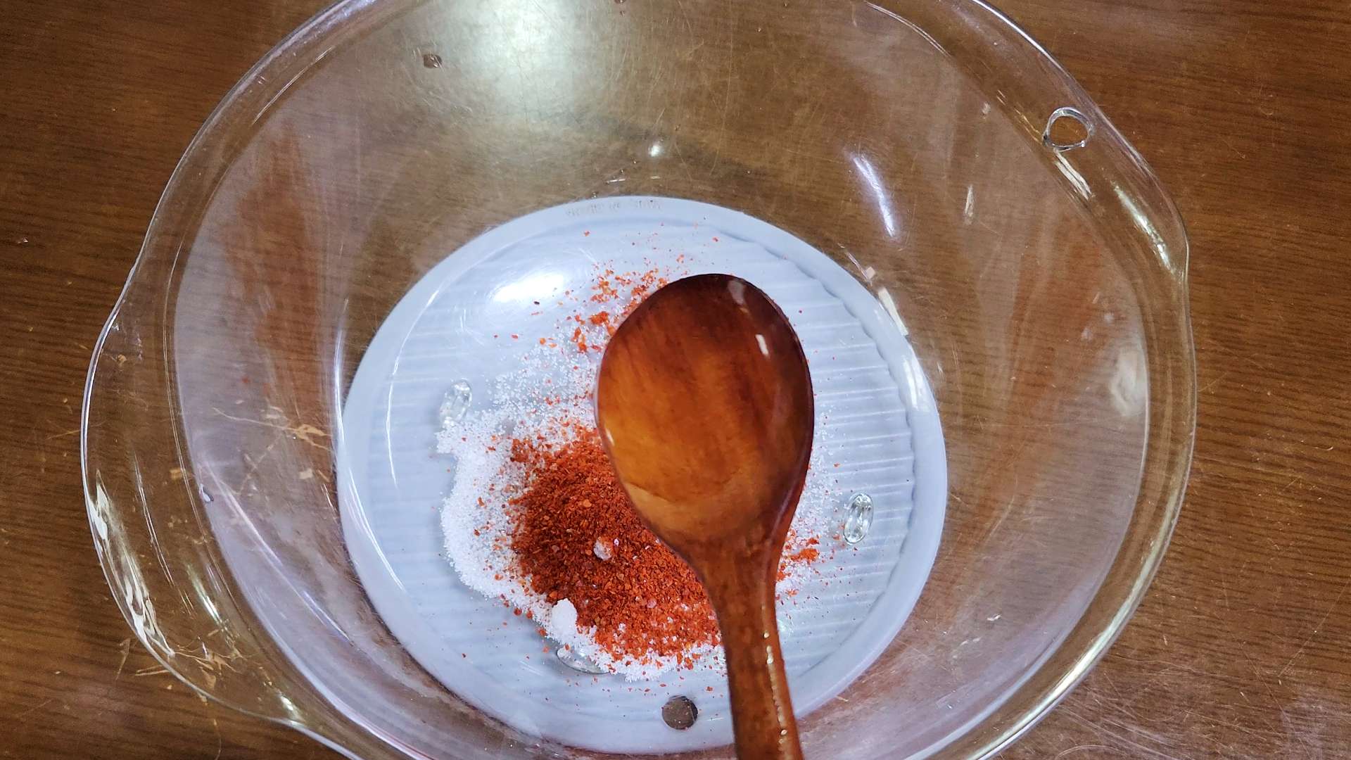 양념: 설탕 0.5T, 고춧가루 0.5T, 식초 1T,