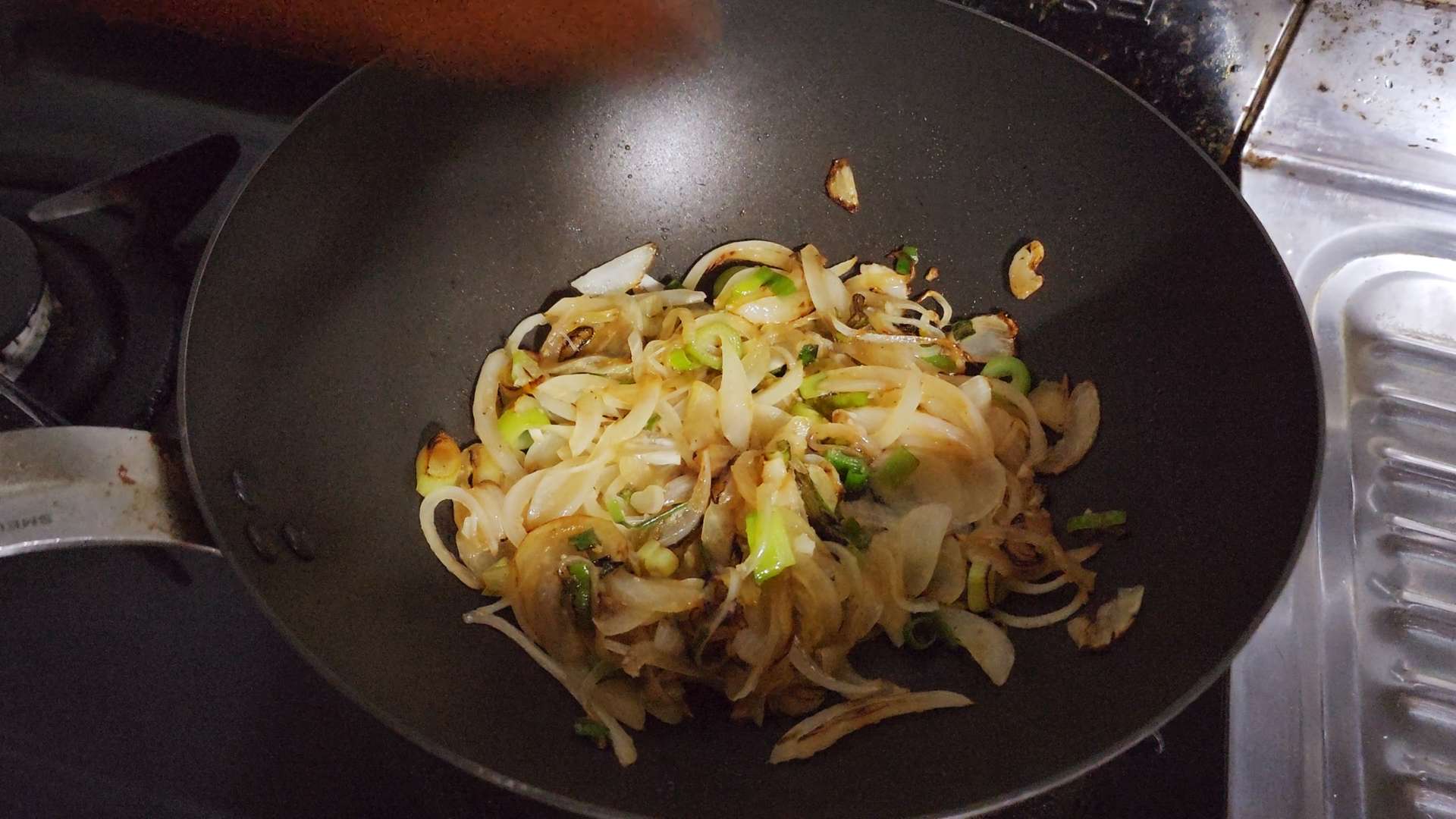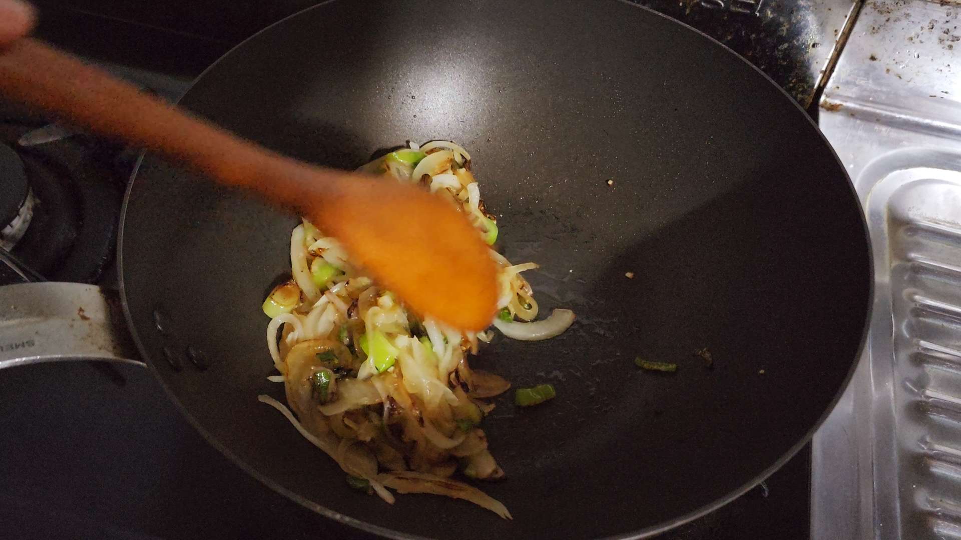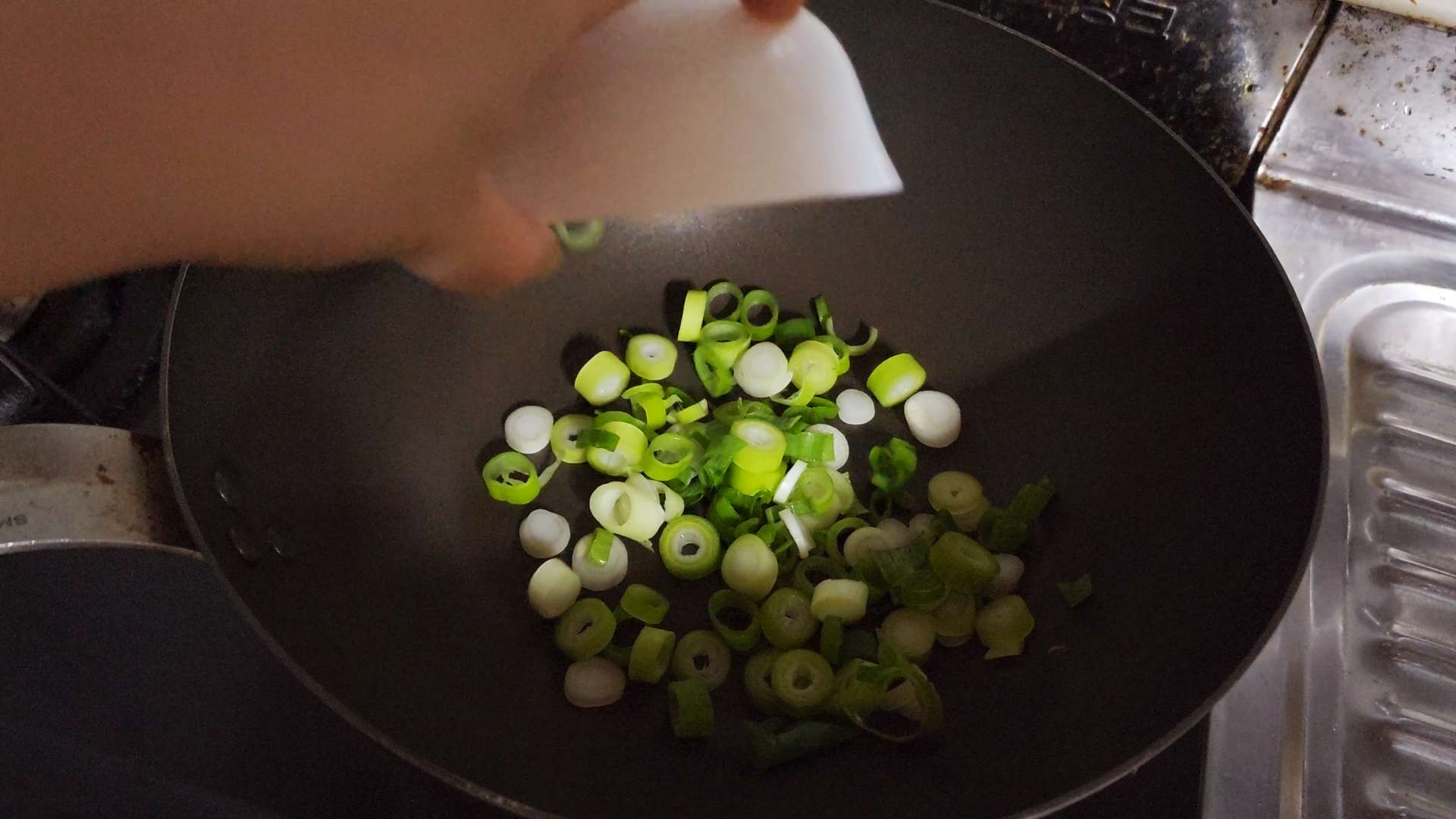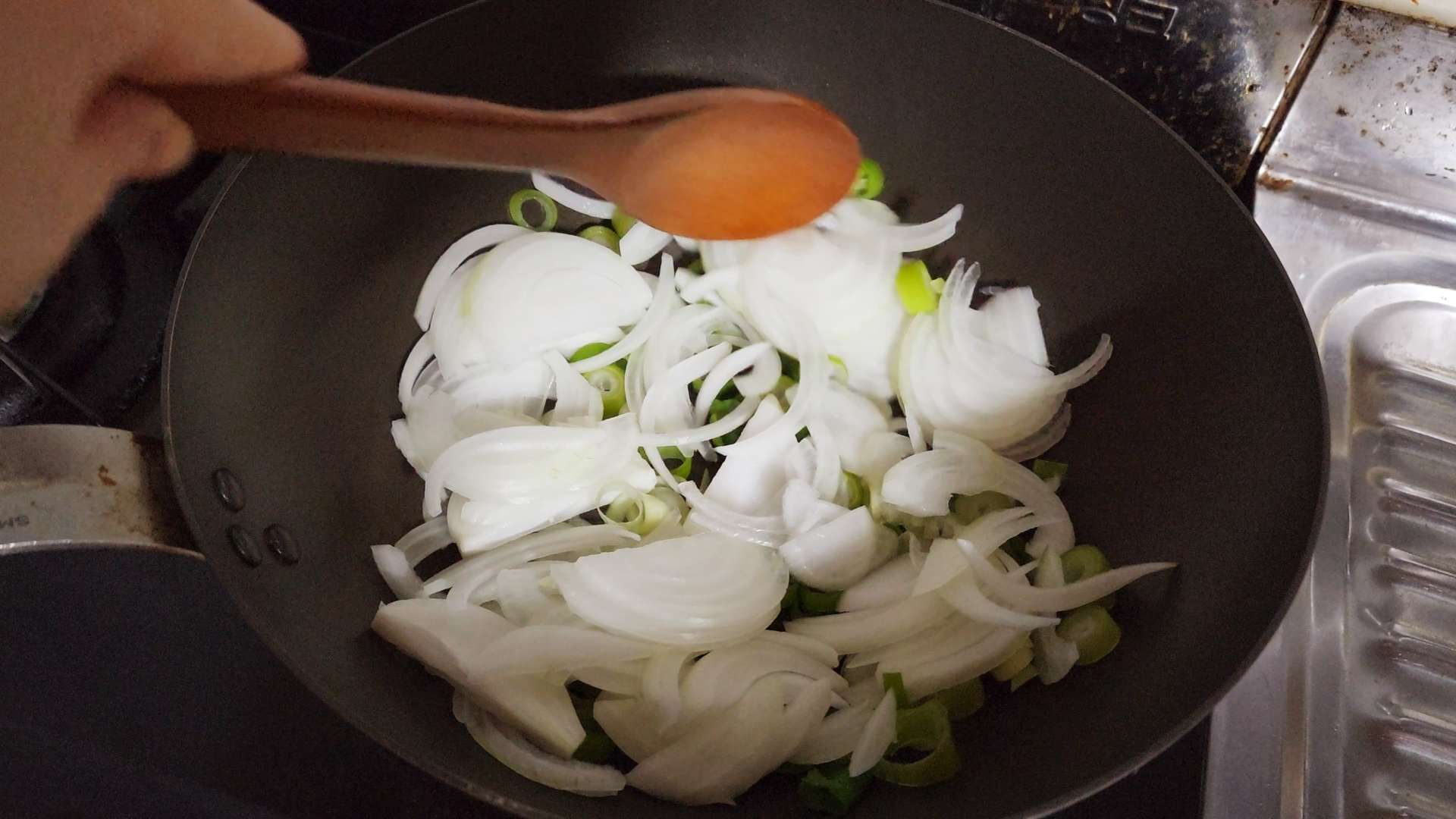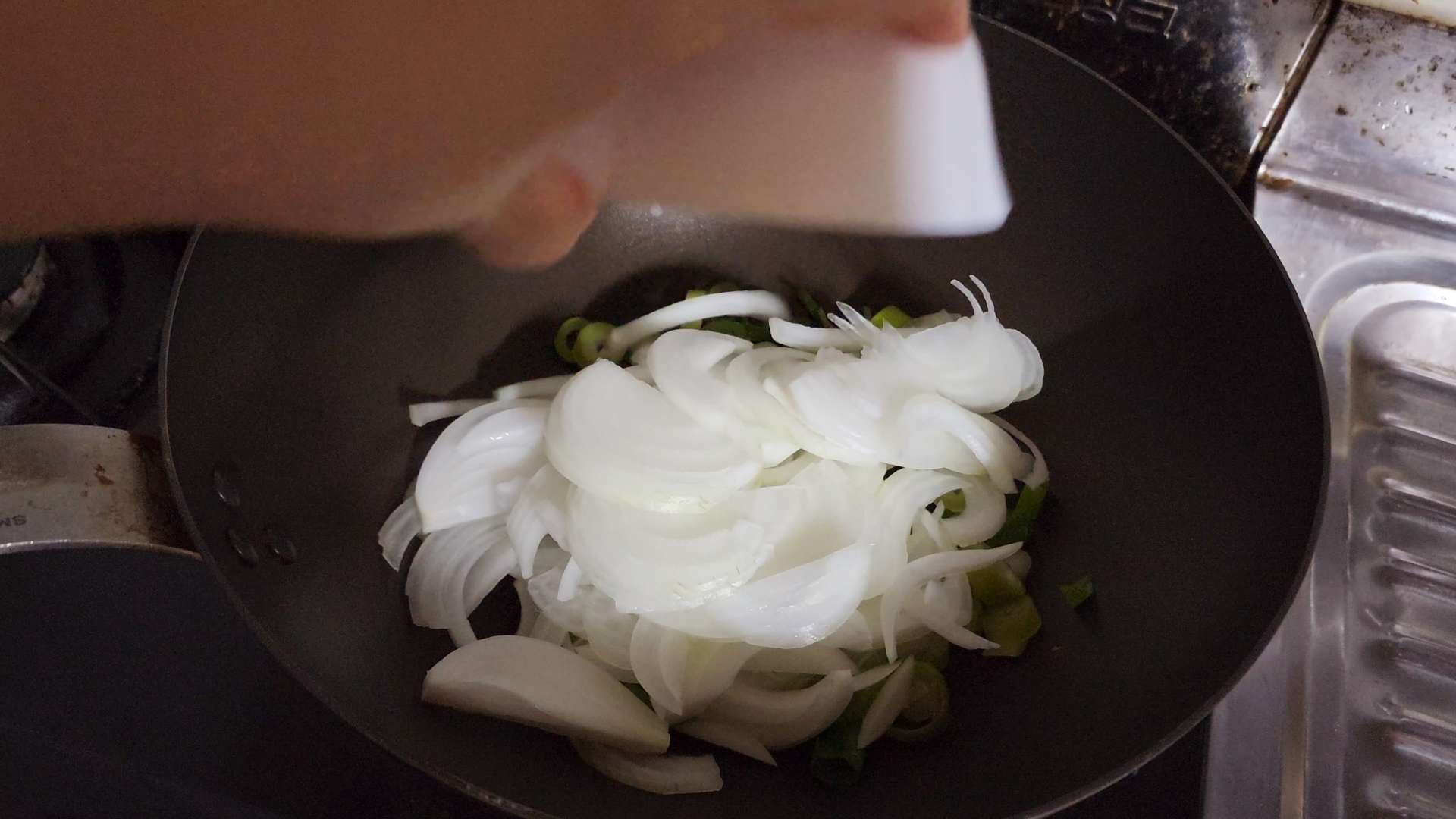 강불로 달군팬에 대파, 양파를 넣어줍니다.