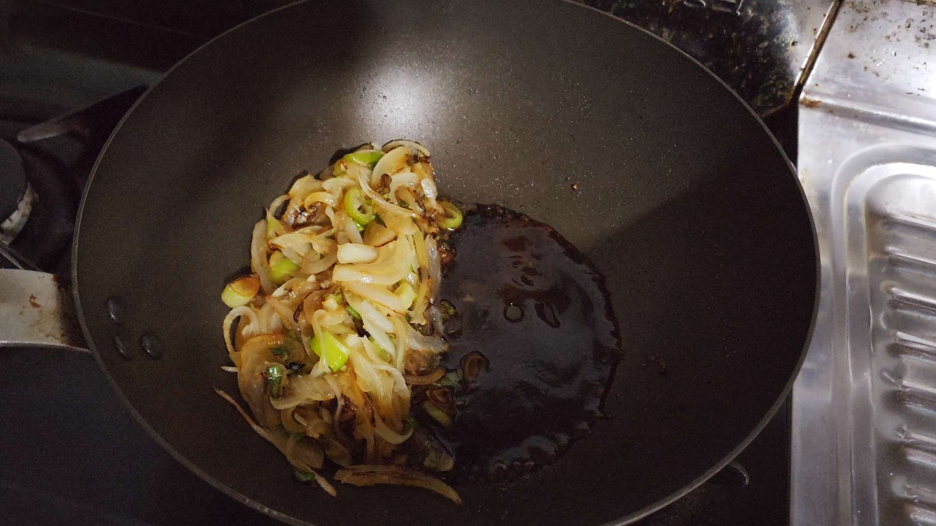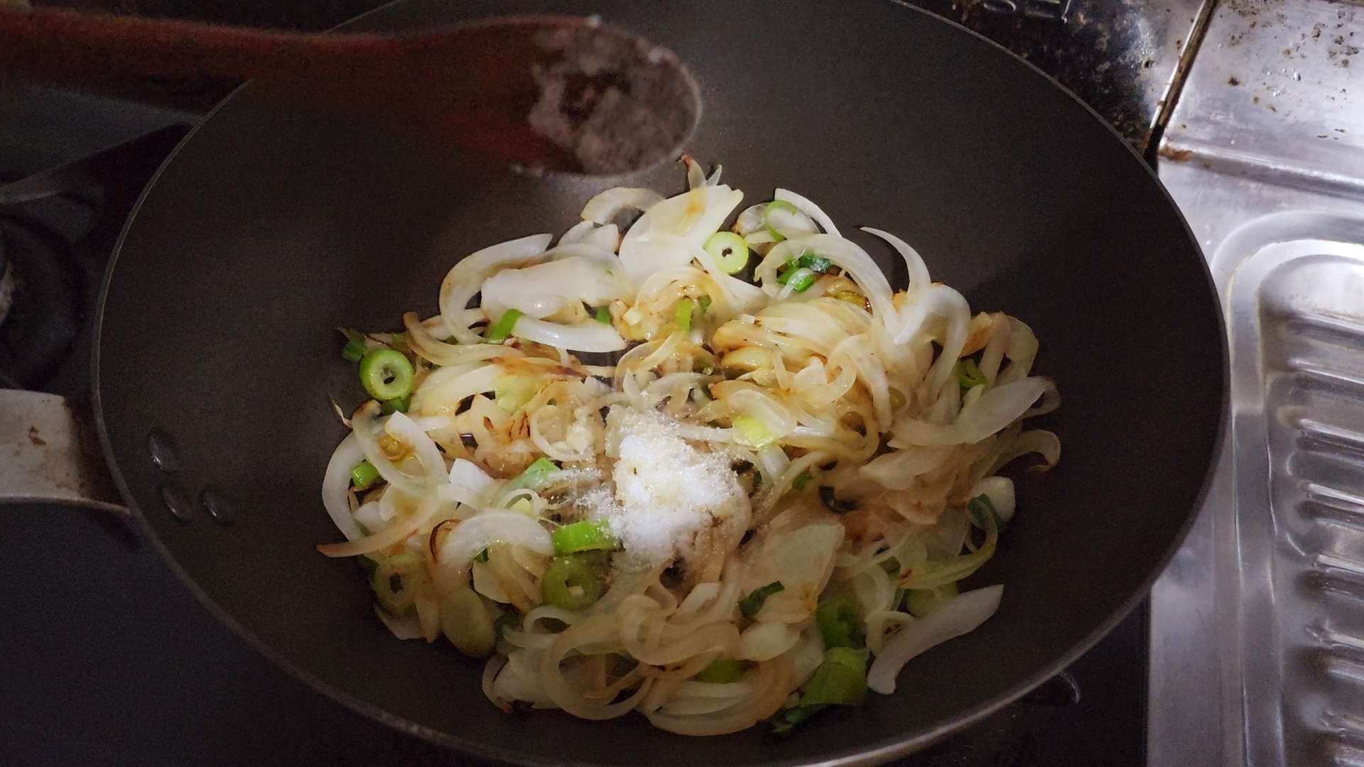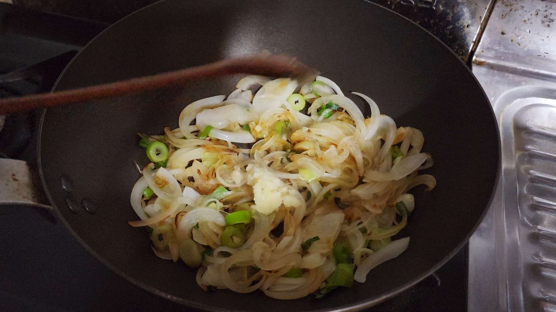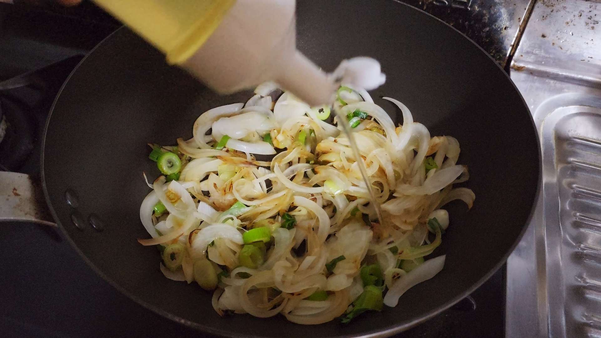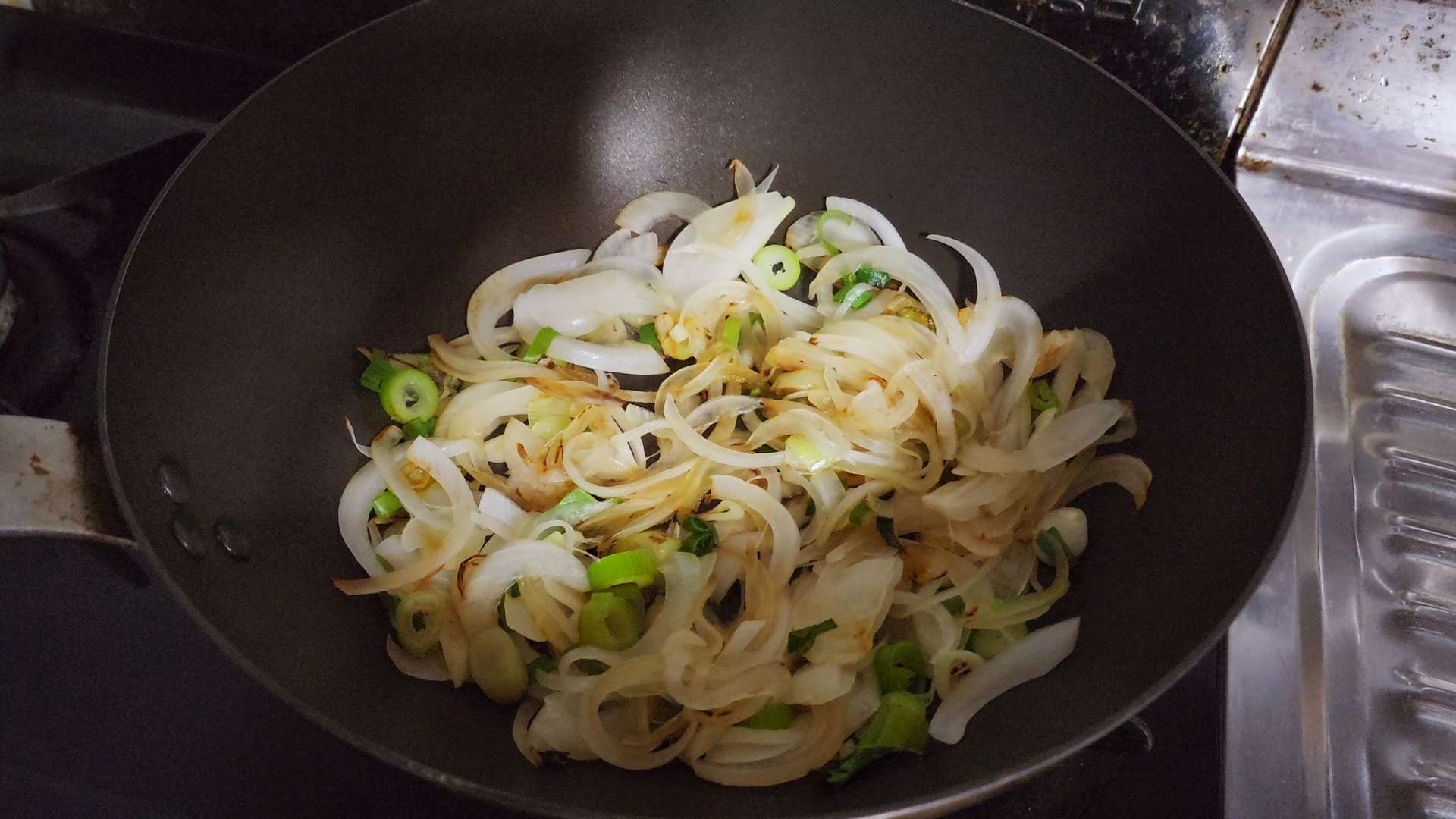 강불로 달군팬에 대파, 양파를 넣어줍니다.