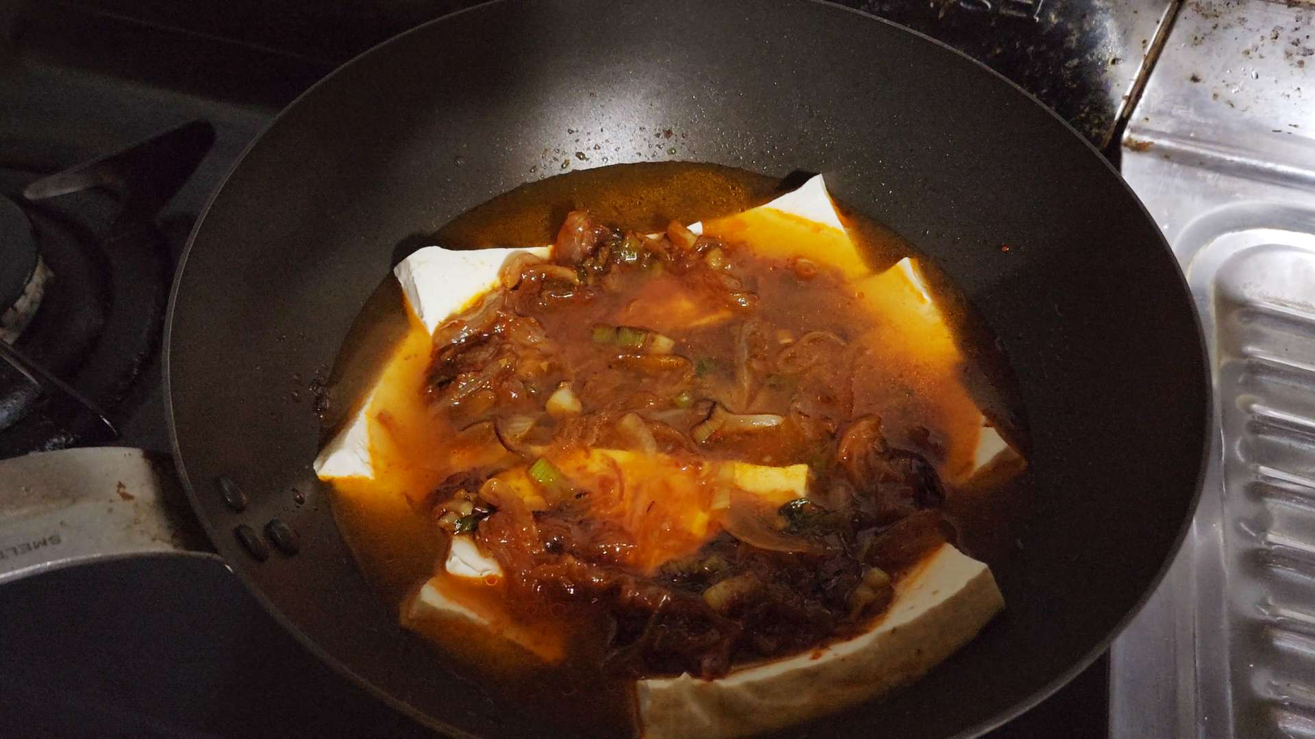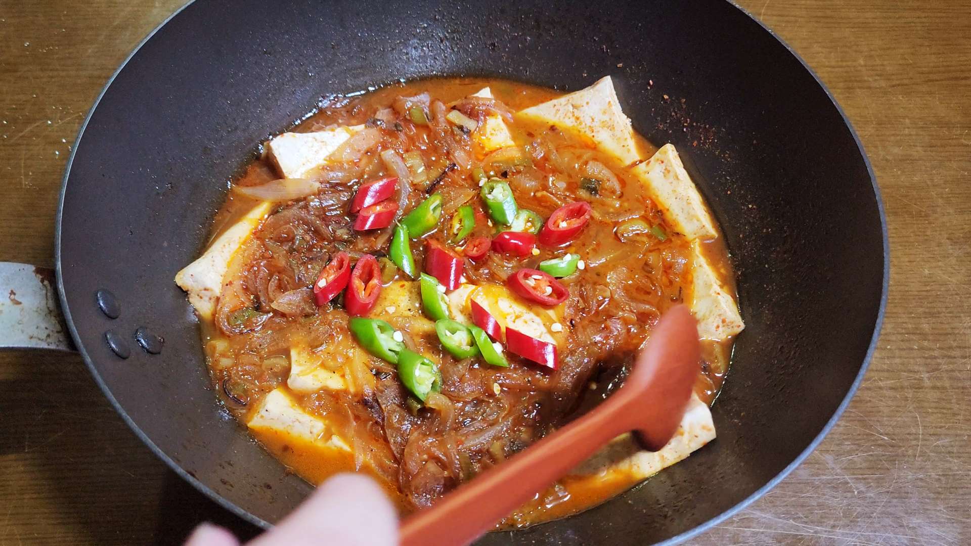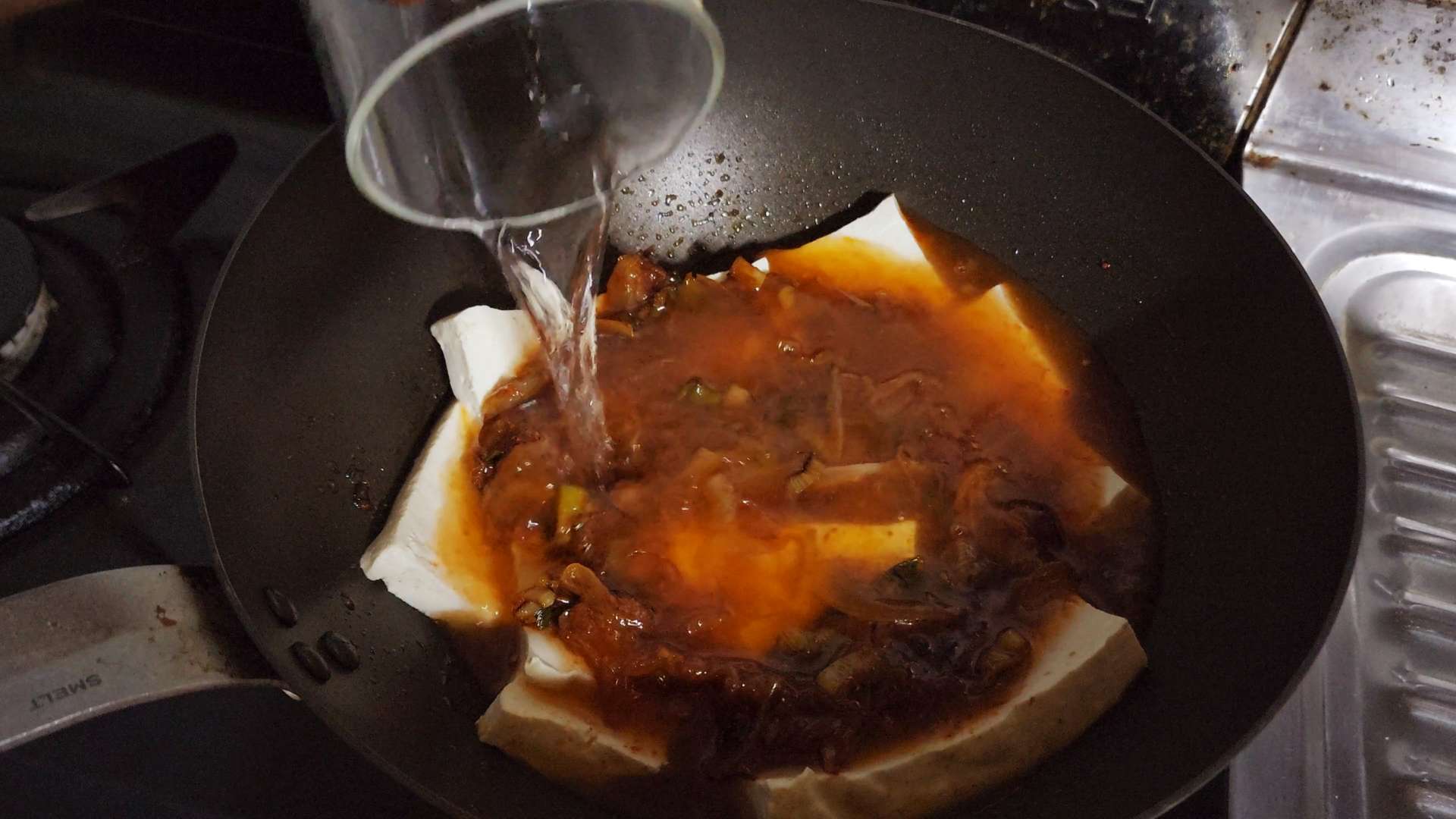 두부, 볶은 채소, 물 200ml 넣고 강불에서 끓여줍니다.
