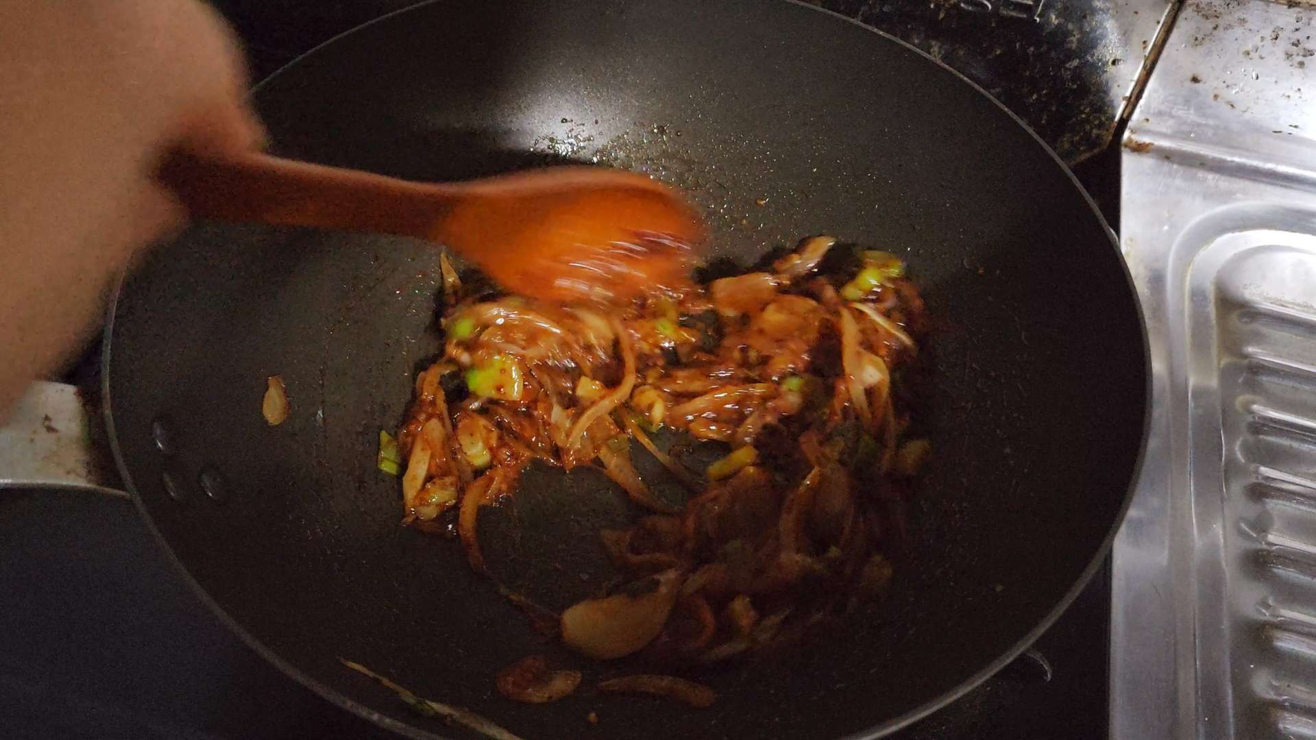 고춧가루 1T를 채소 위에 뿌리고 불을 켜 강불에서 1분 볶아줍니다. 그릇에 볶은 채소는 덜어둡니다.