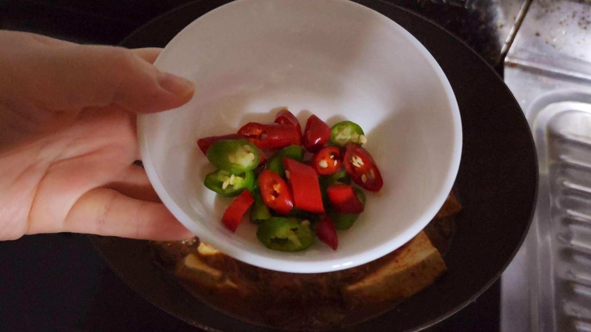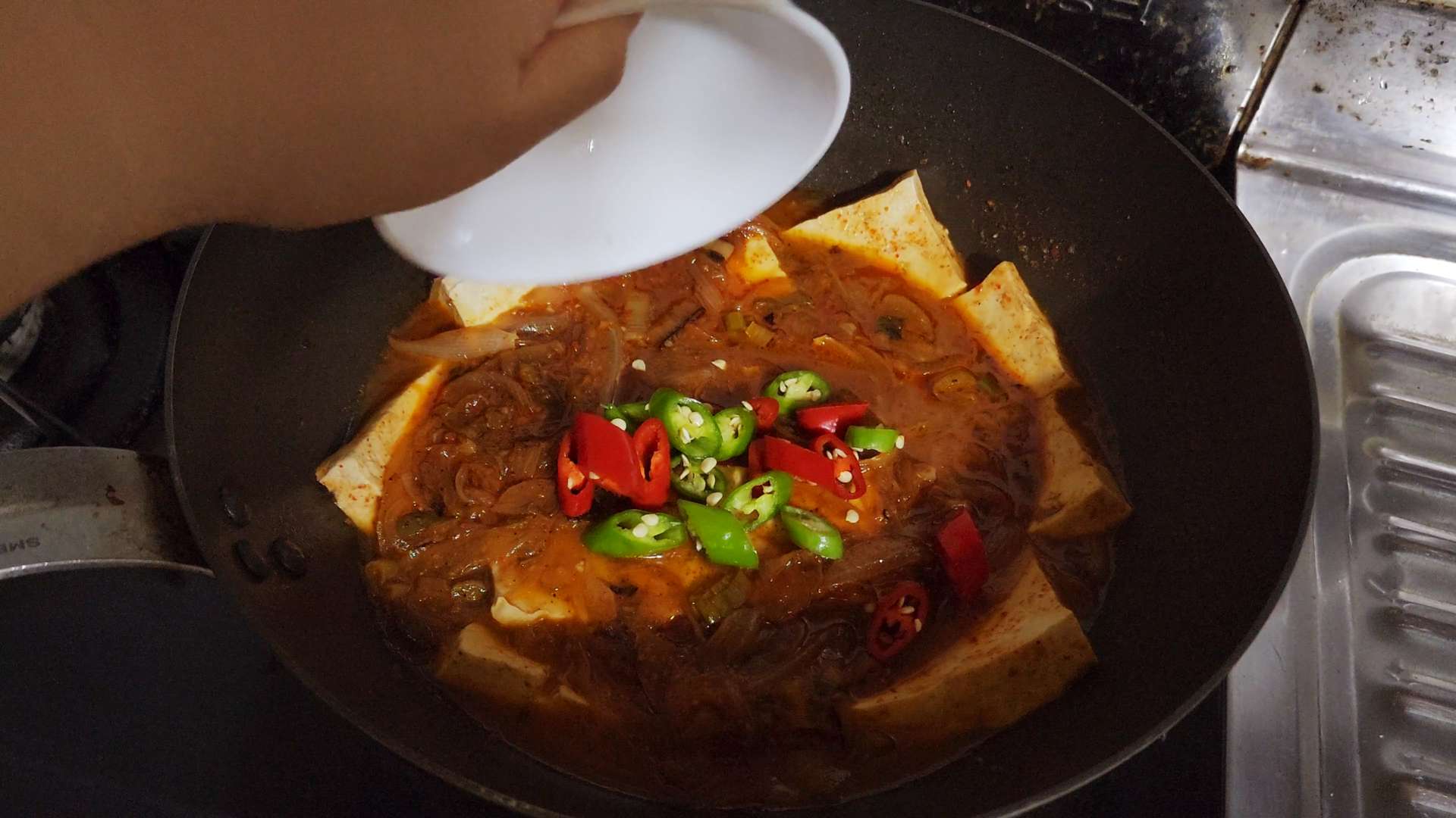불을 끄고 청양고추, 홍고추를 올려줍니다.
