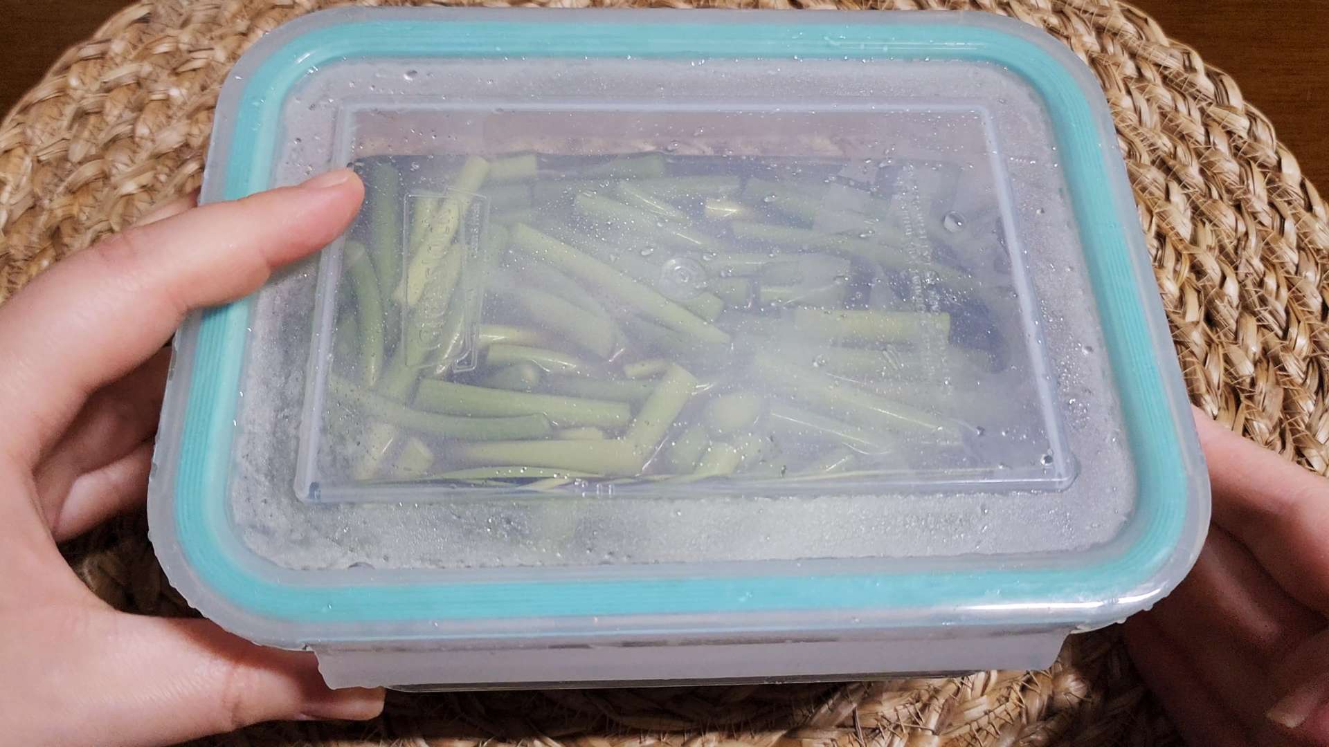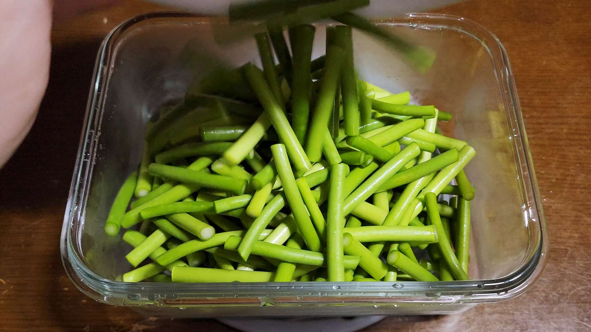 밀폐 용기에 마늘쫑을 담아줍니다.