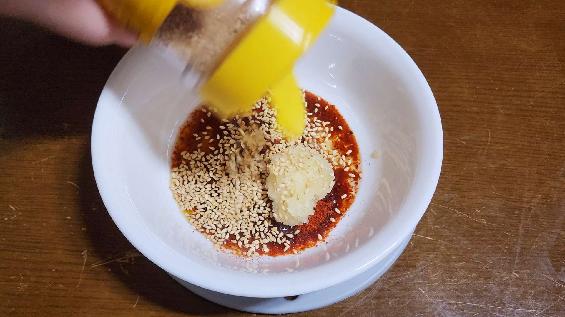 멸치액젓 2T, 고춧가루 1T, 매실액 1T, 참기름 1T, 식초 1/2T, 올리고당 1T, 다진마늘 1/2T, 통깨 넣고 섞어줍니다.