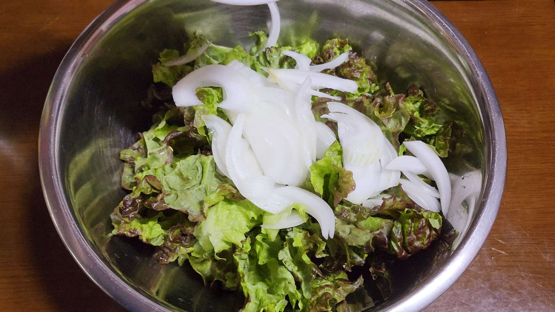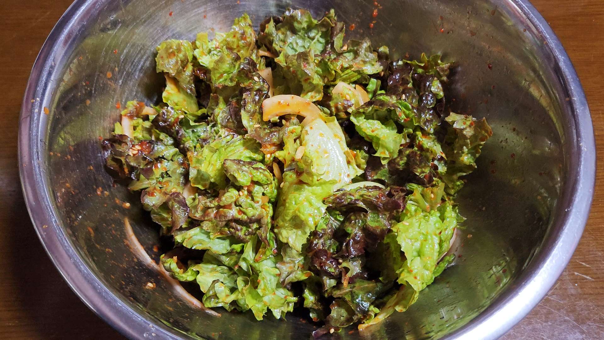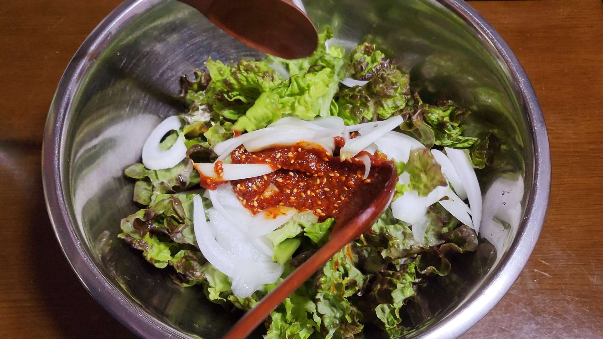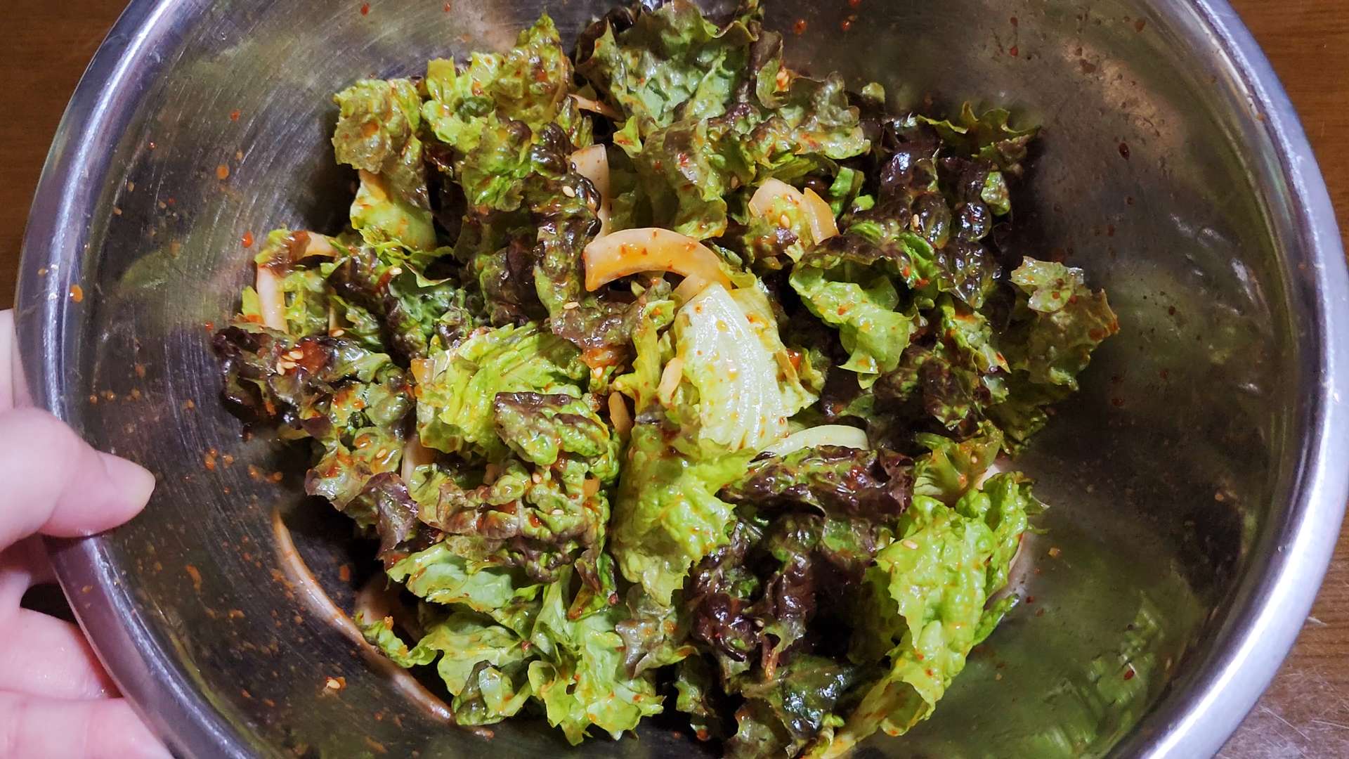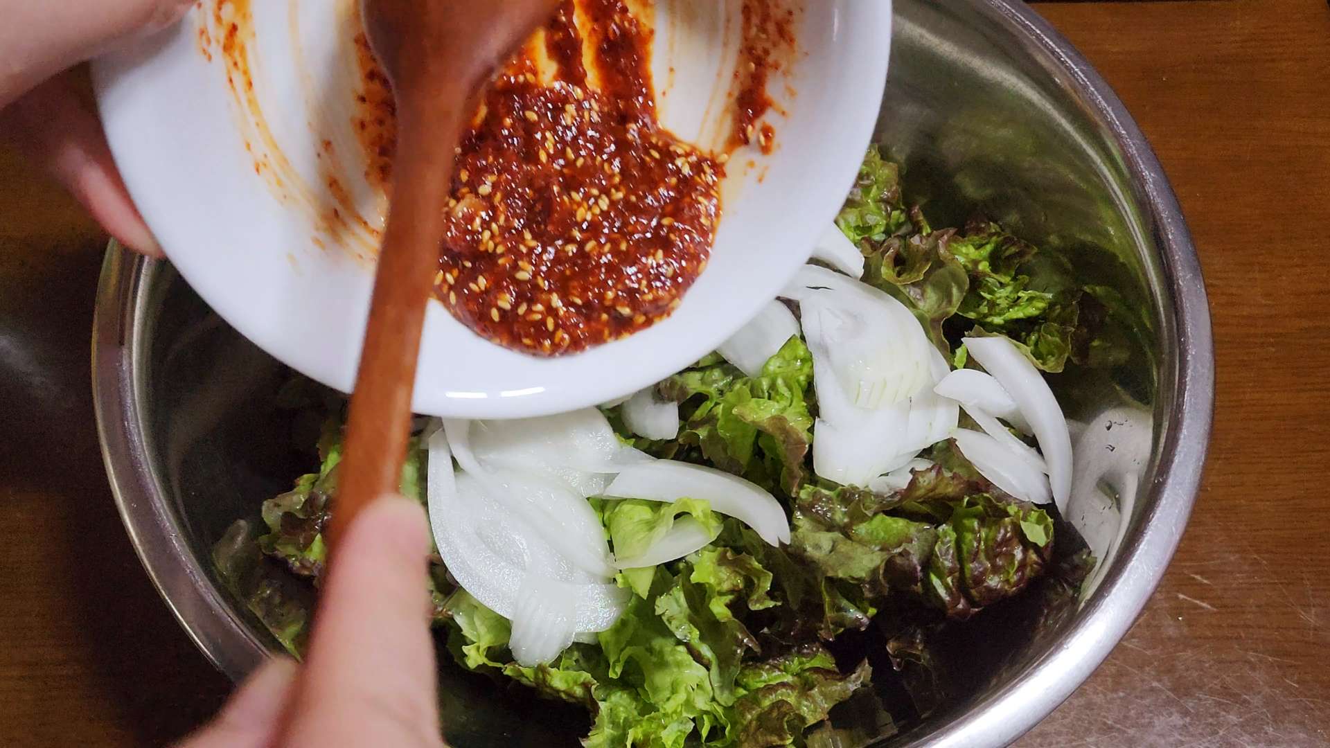 볼에 상추, 양파, 양념을 넣고 무쳐줍니다.