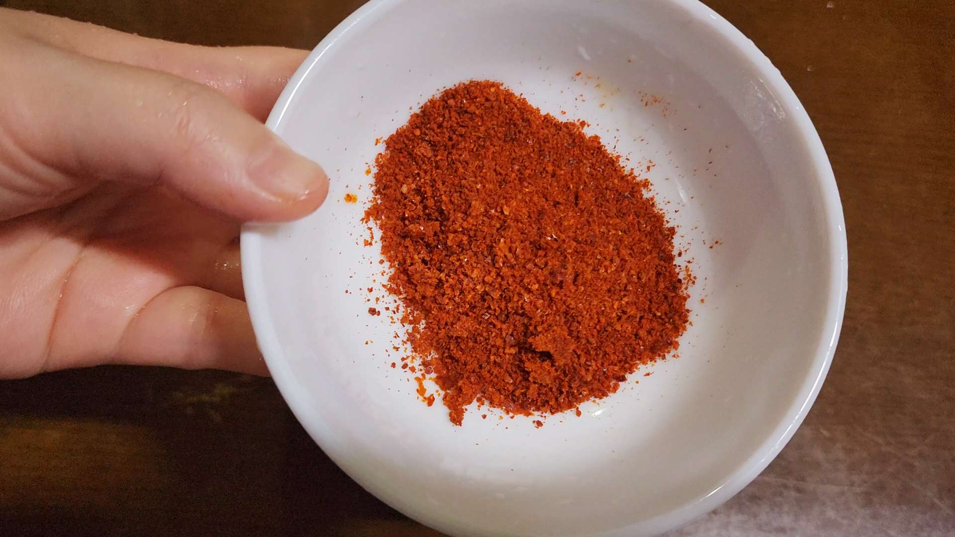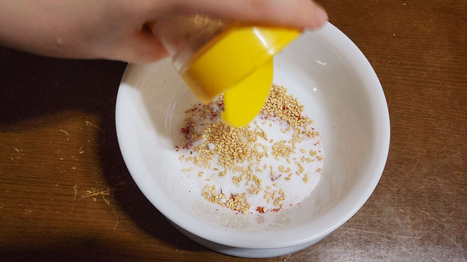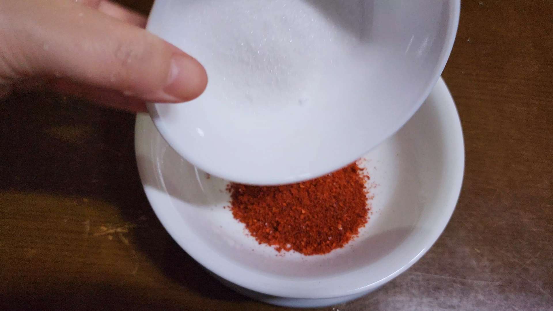 고춧가루 2T, 설탕 4T, 통깨 2T, 참기름 4T,