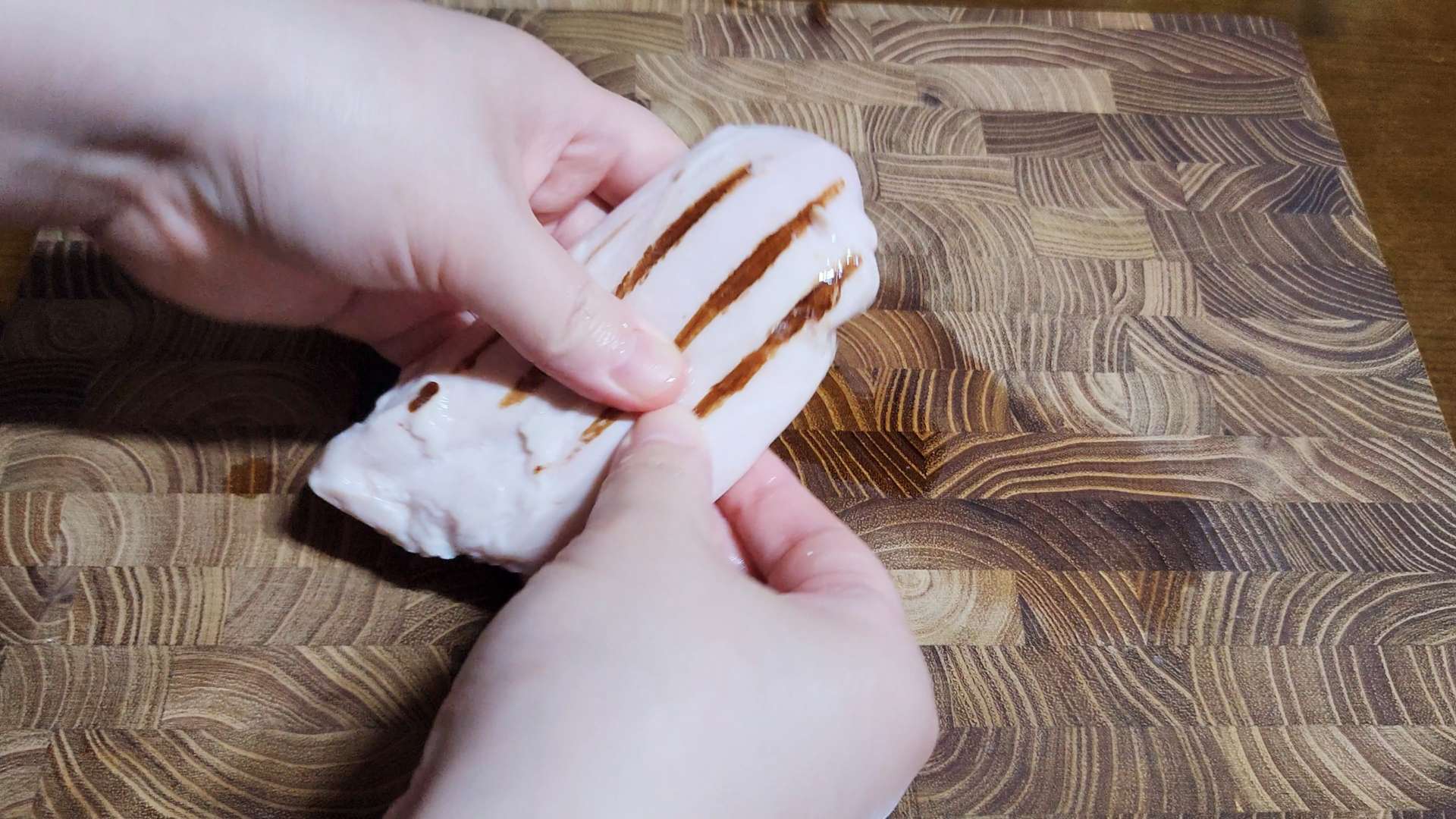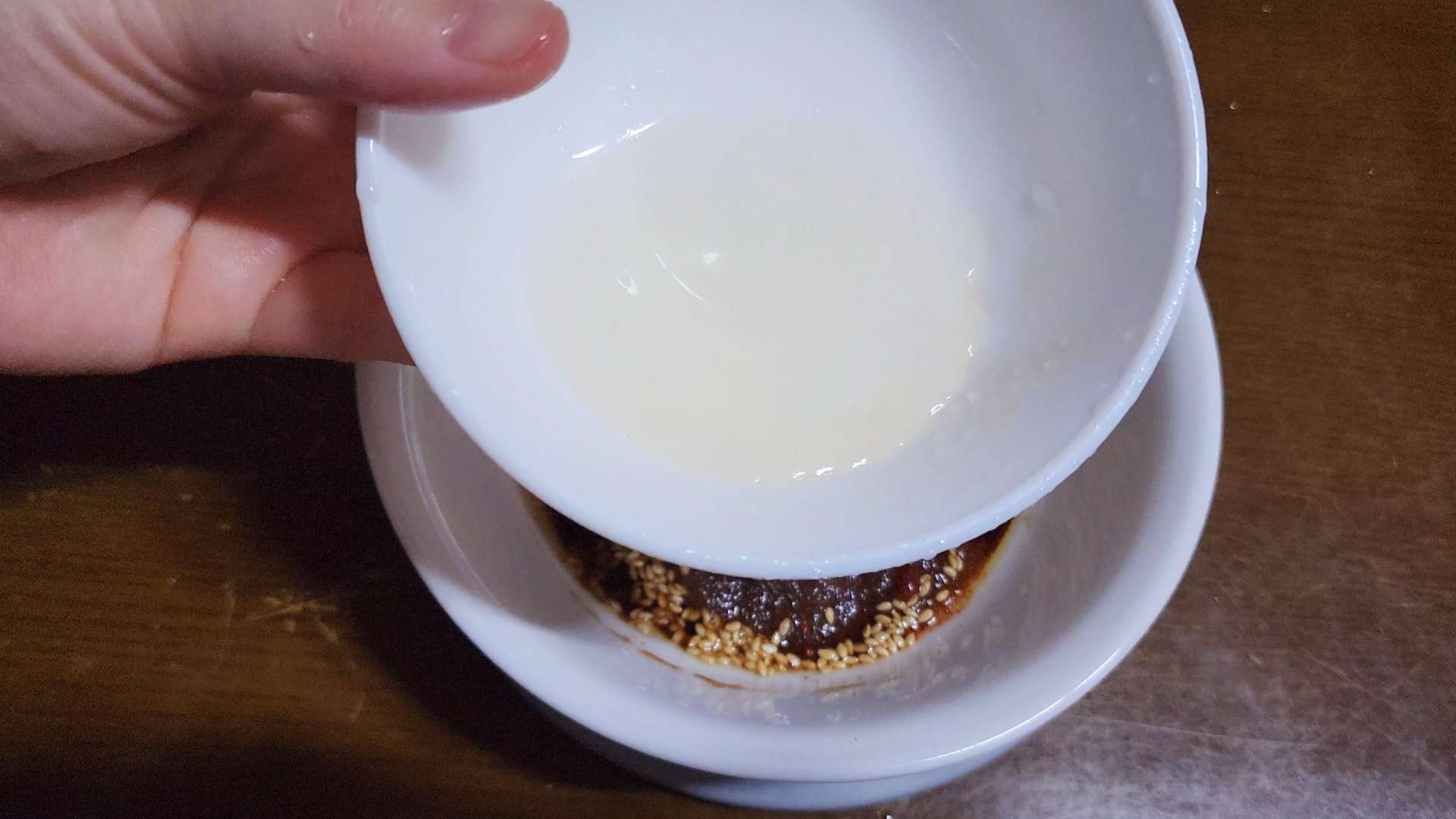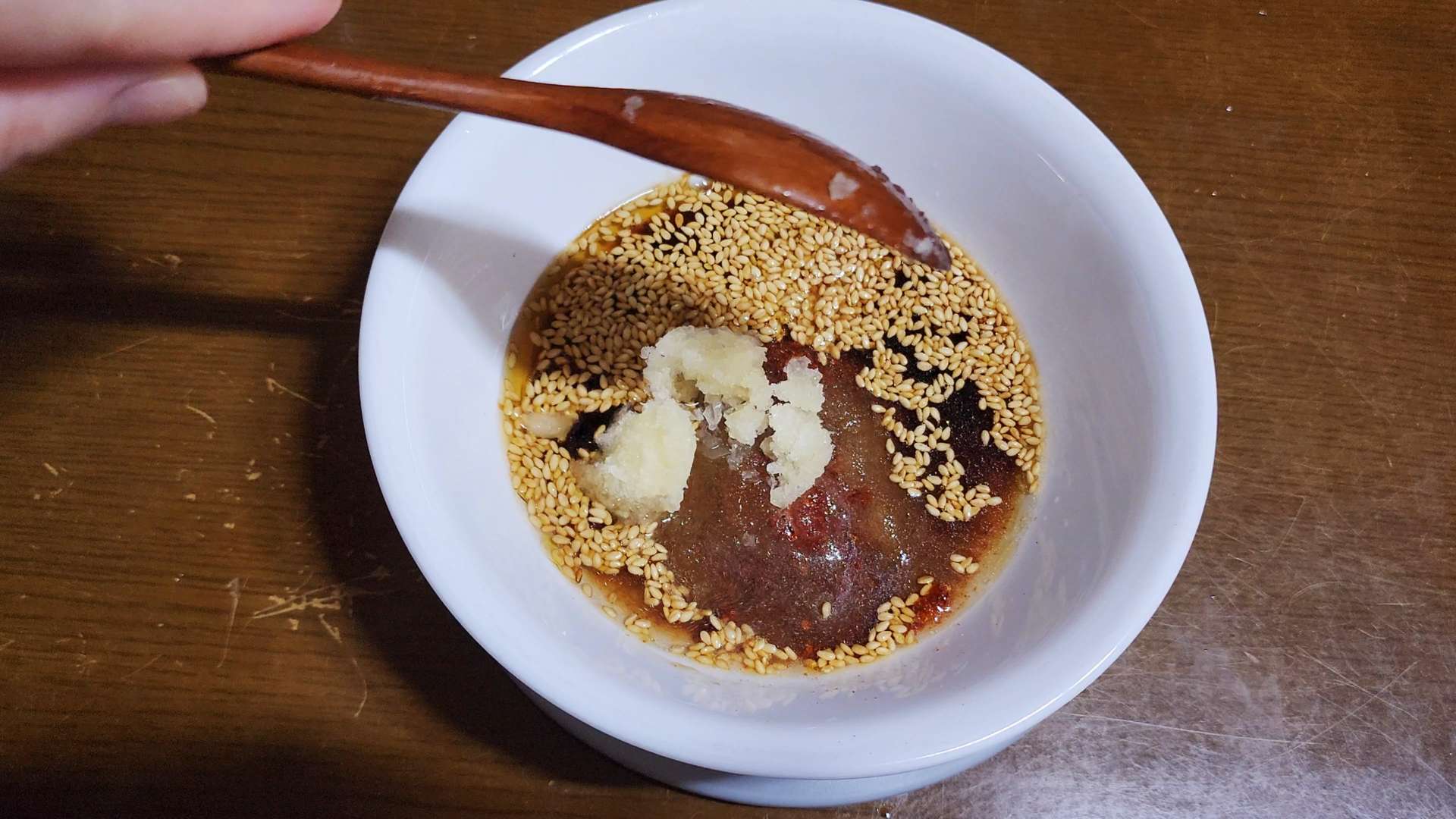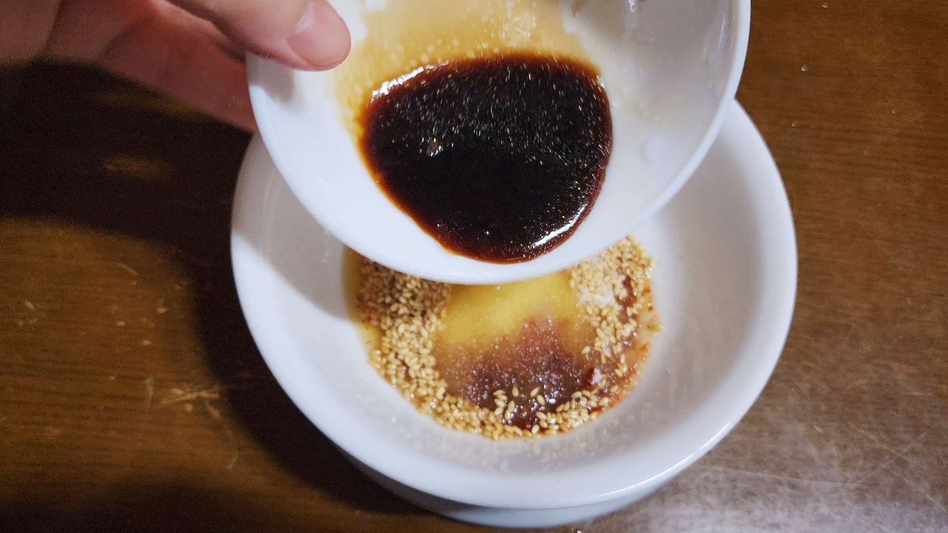 참기름 4T, 양조간장 6T, 식초 4T, 다진마늘 0.5T, 케첩 1T, 고추장 1T, 후추 1T, 오이절임물 4T