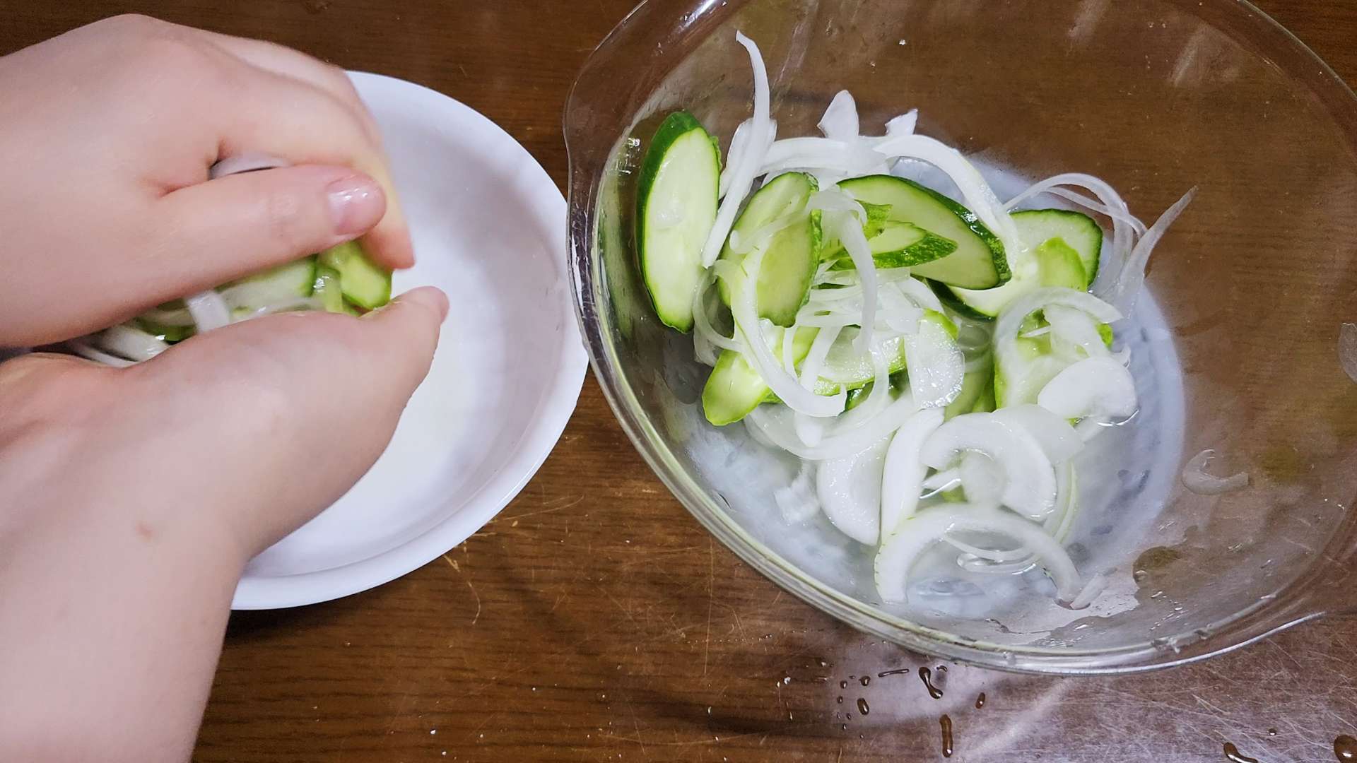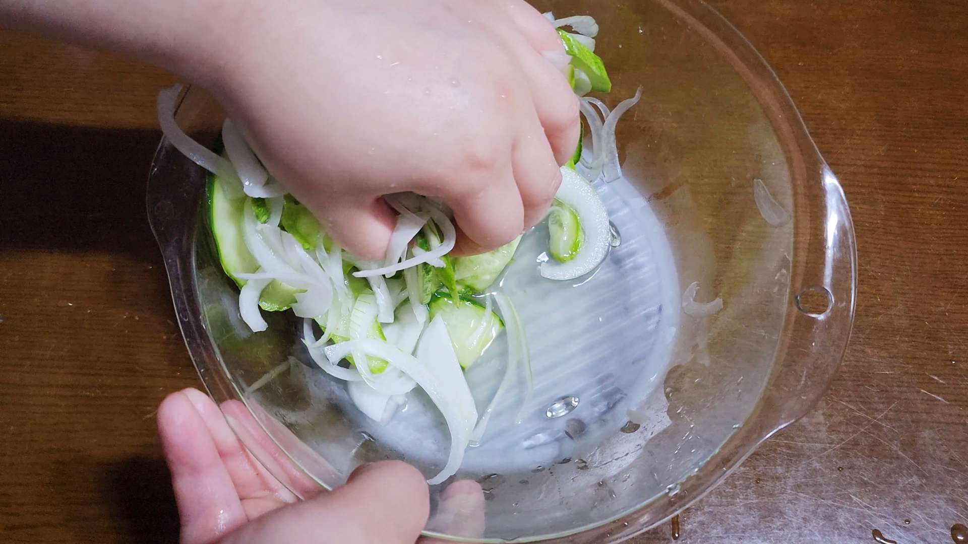절인 오이, 양파는 물기를 꼭 짜줍니다.