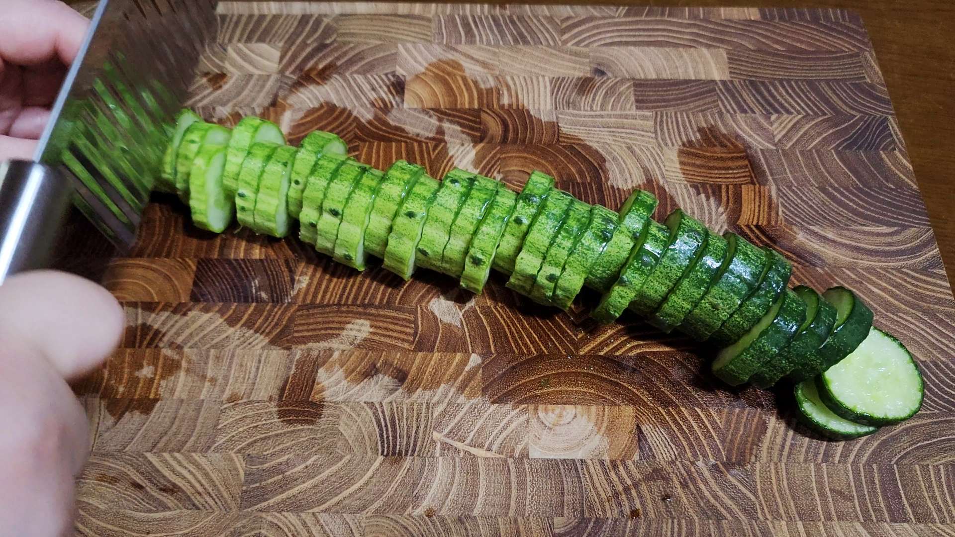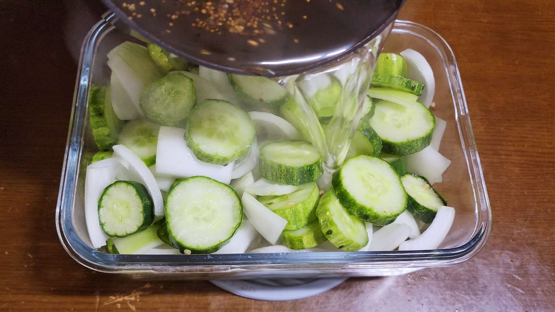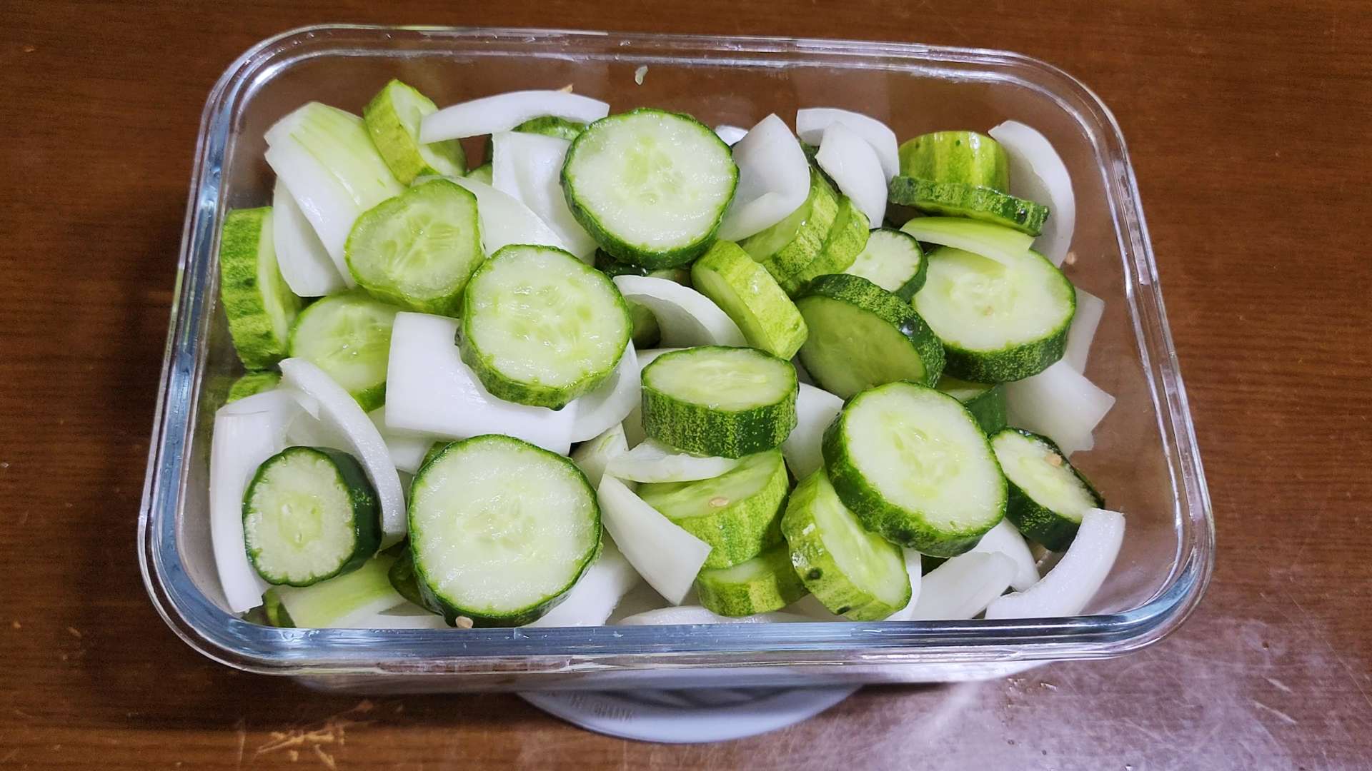 밀폐용기에 오이, 양파, 청양고추를 담아줍니다.