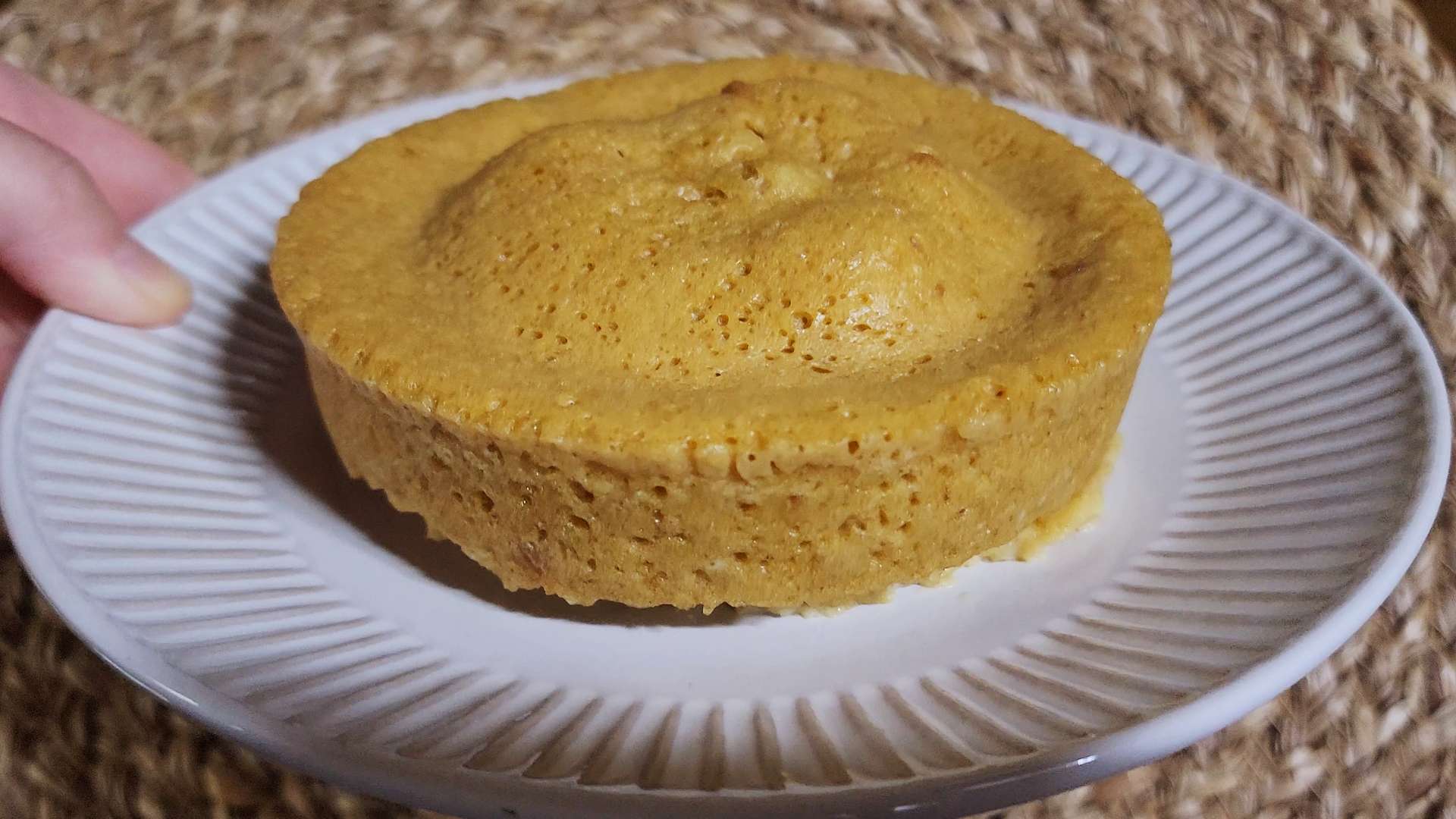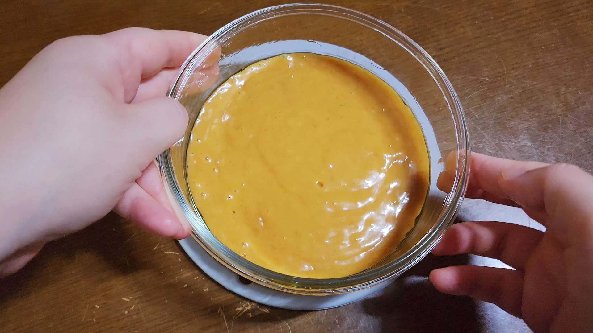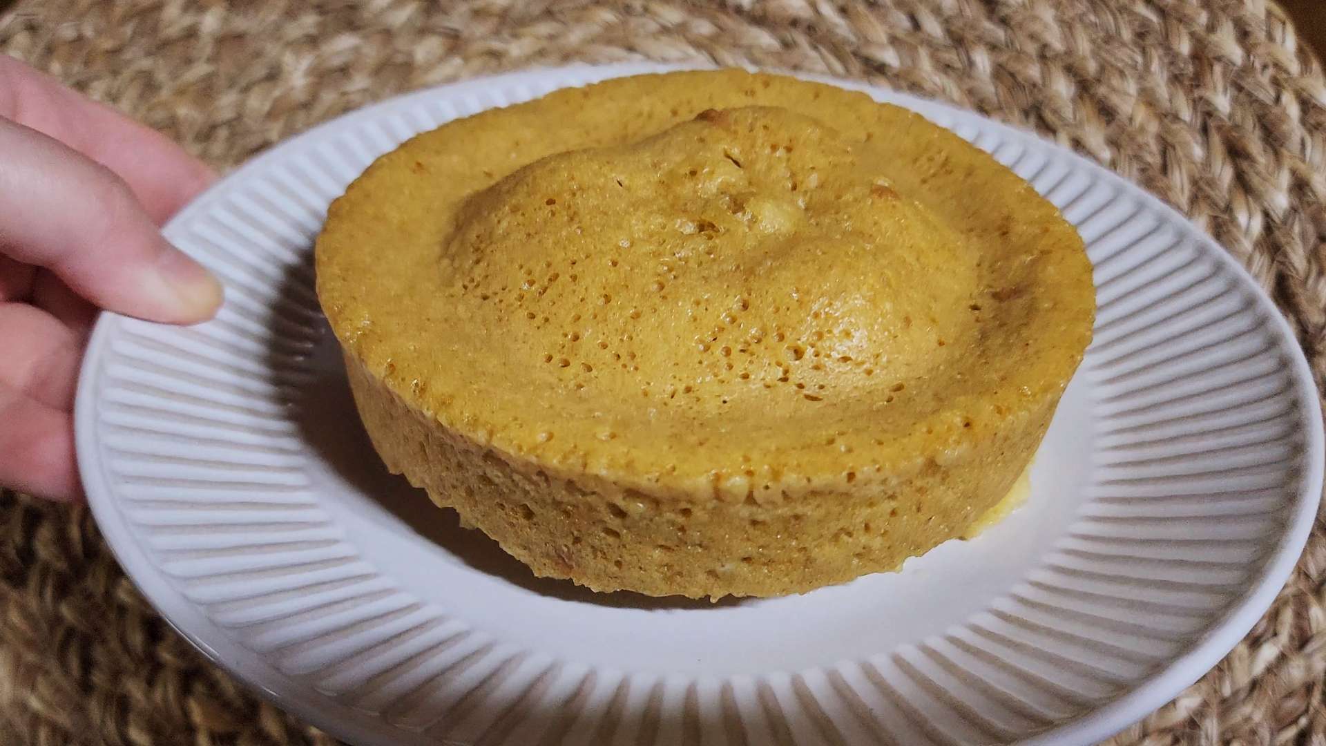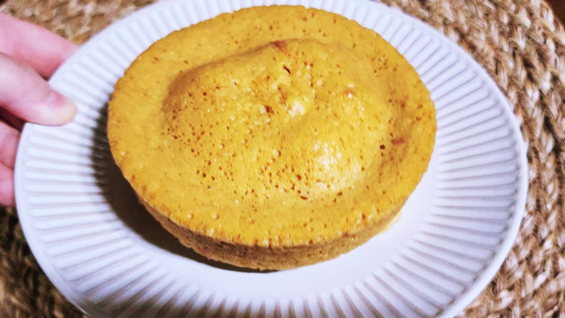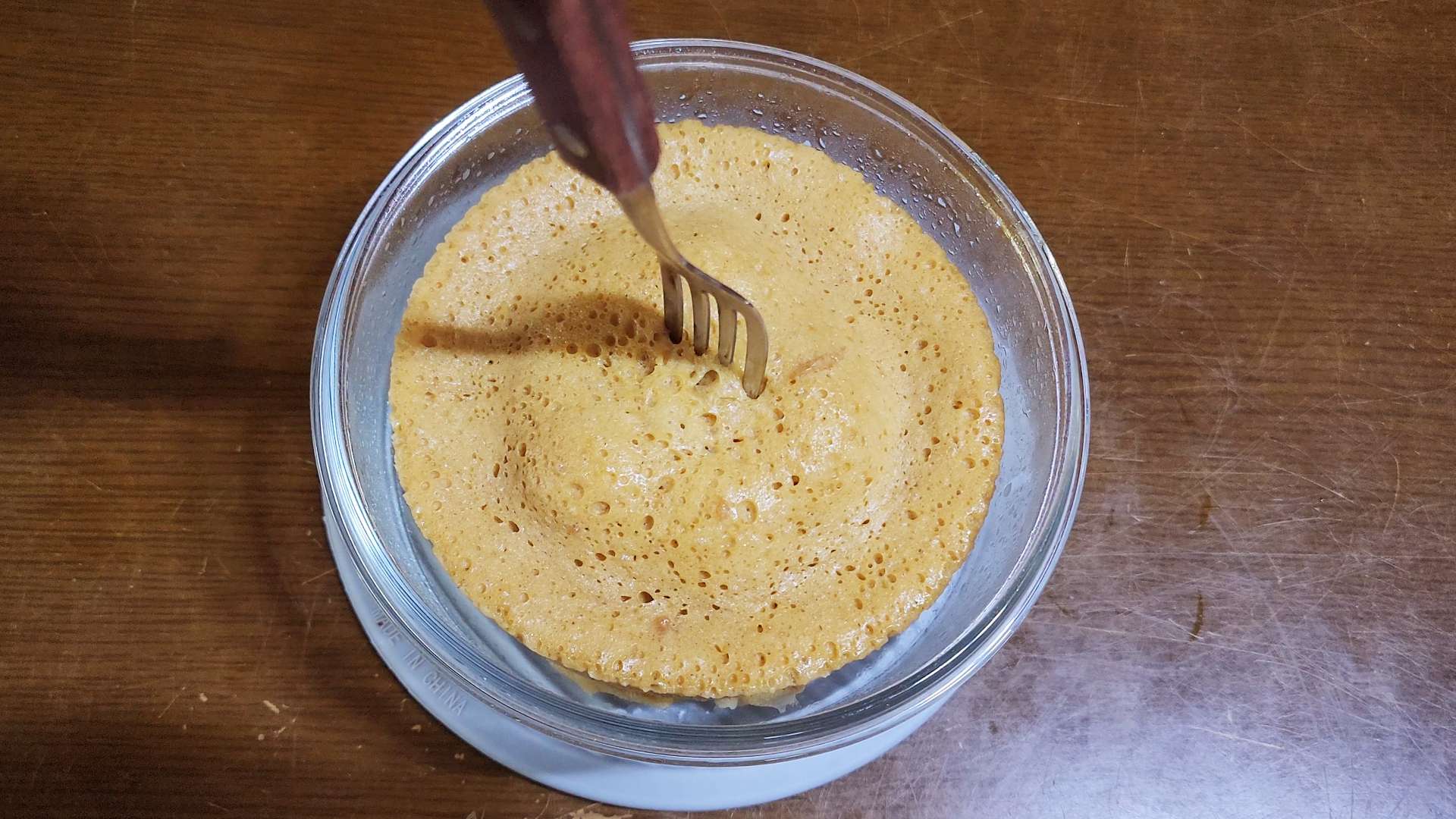 반죽을 부어 윗면을 고르게 펴고 용기 바닥을 살짝 쳐서 기포를 빼줍니다. 전자레인지에 4분 정도 돌려줍니다.