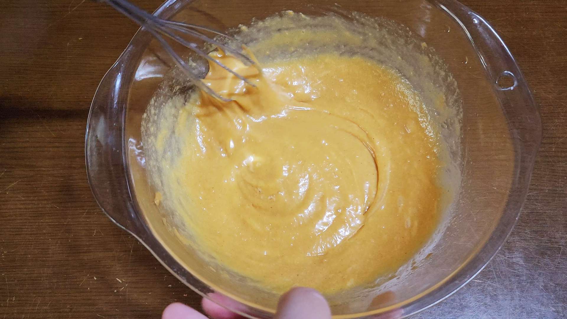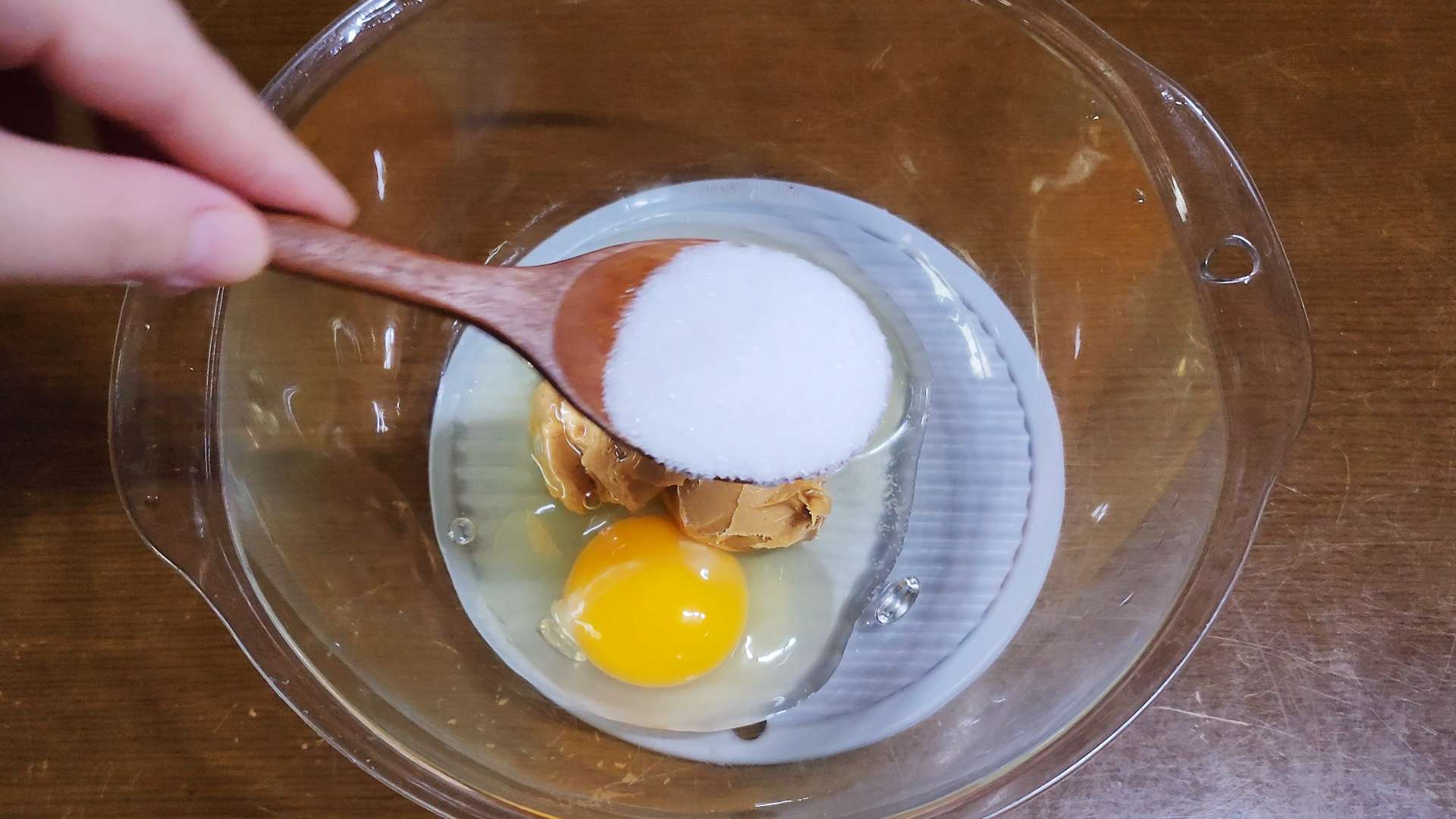 땅콩버터 3T, 달걀 2개, 설탕 2T, 베이킹파우더 0.5t를 넣고 섞어줍니다.