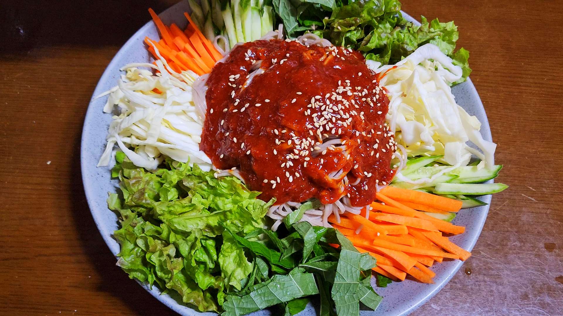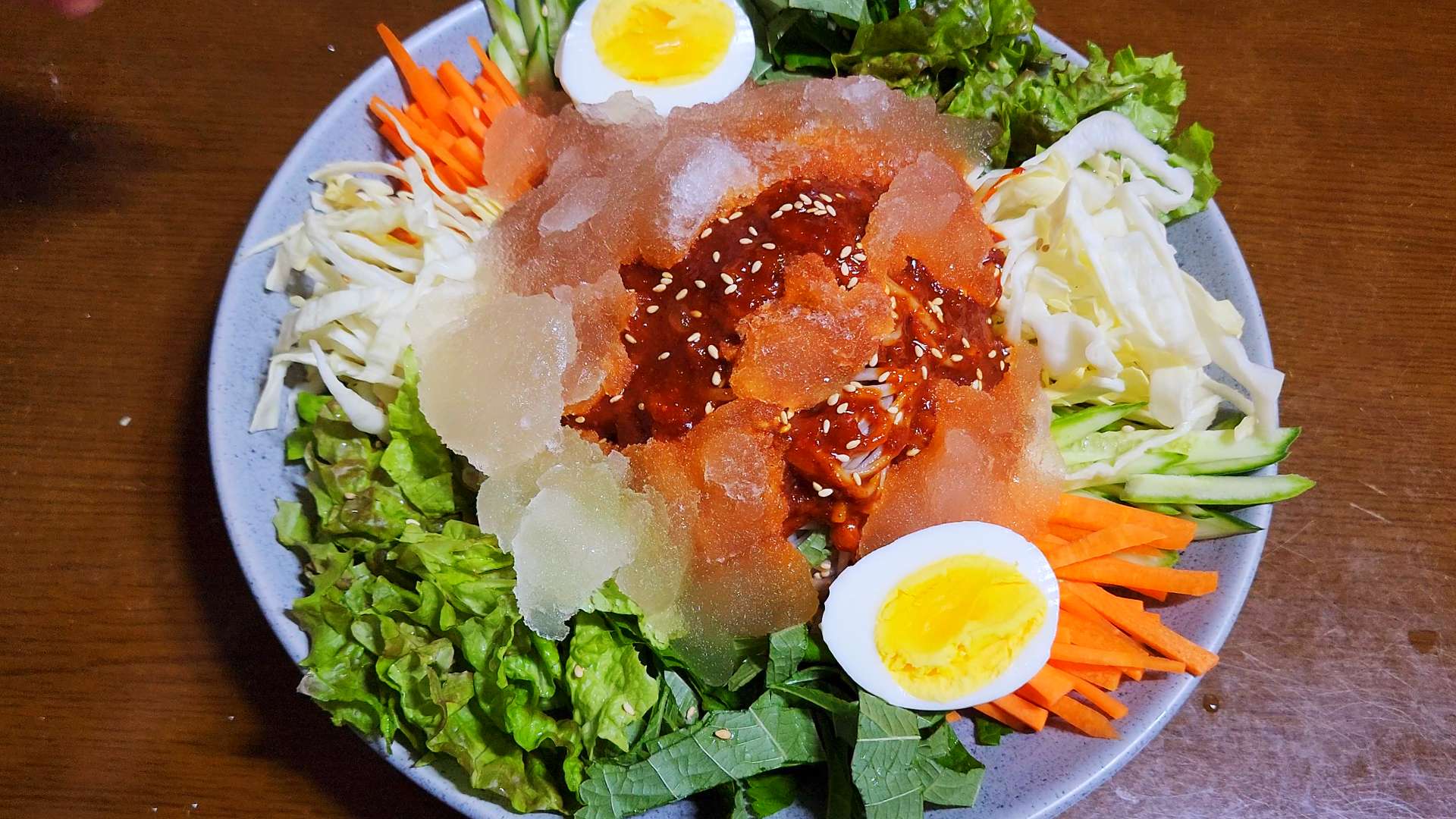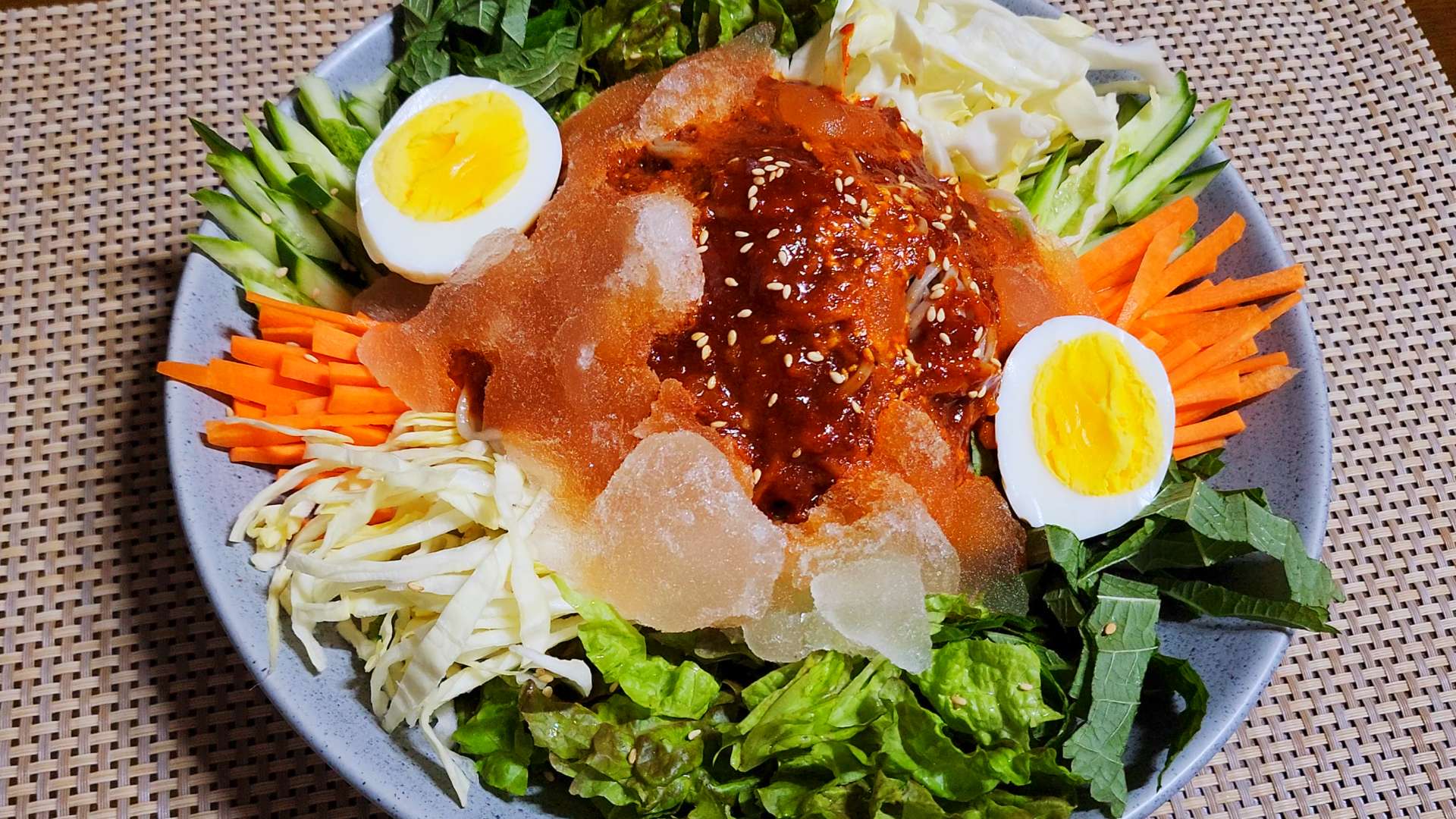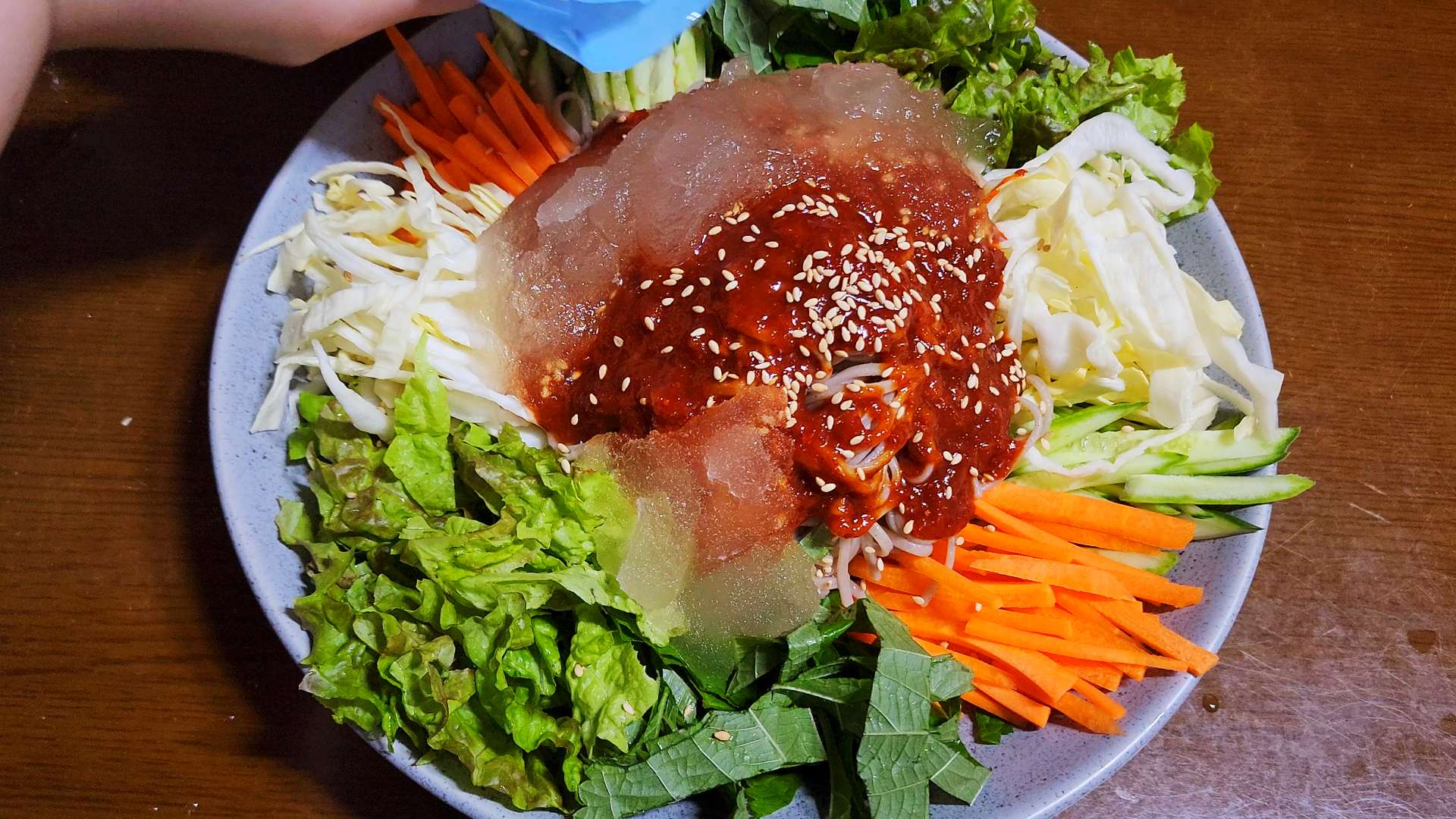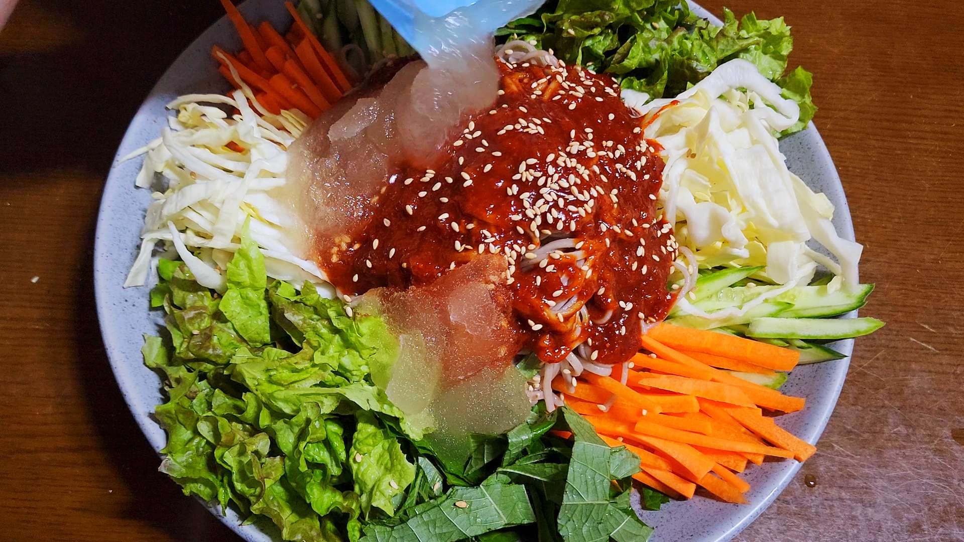 아삭한 야채와 매콤 달콤한 양념, 시원한 육수에 버무려 먹으면 맛있답니다.