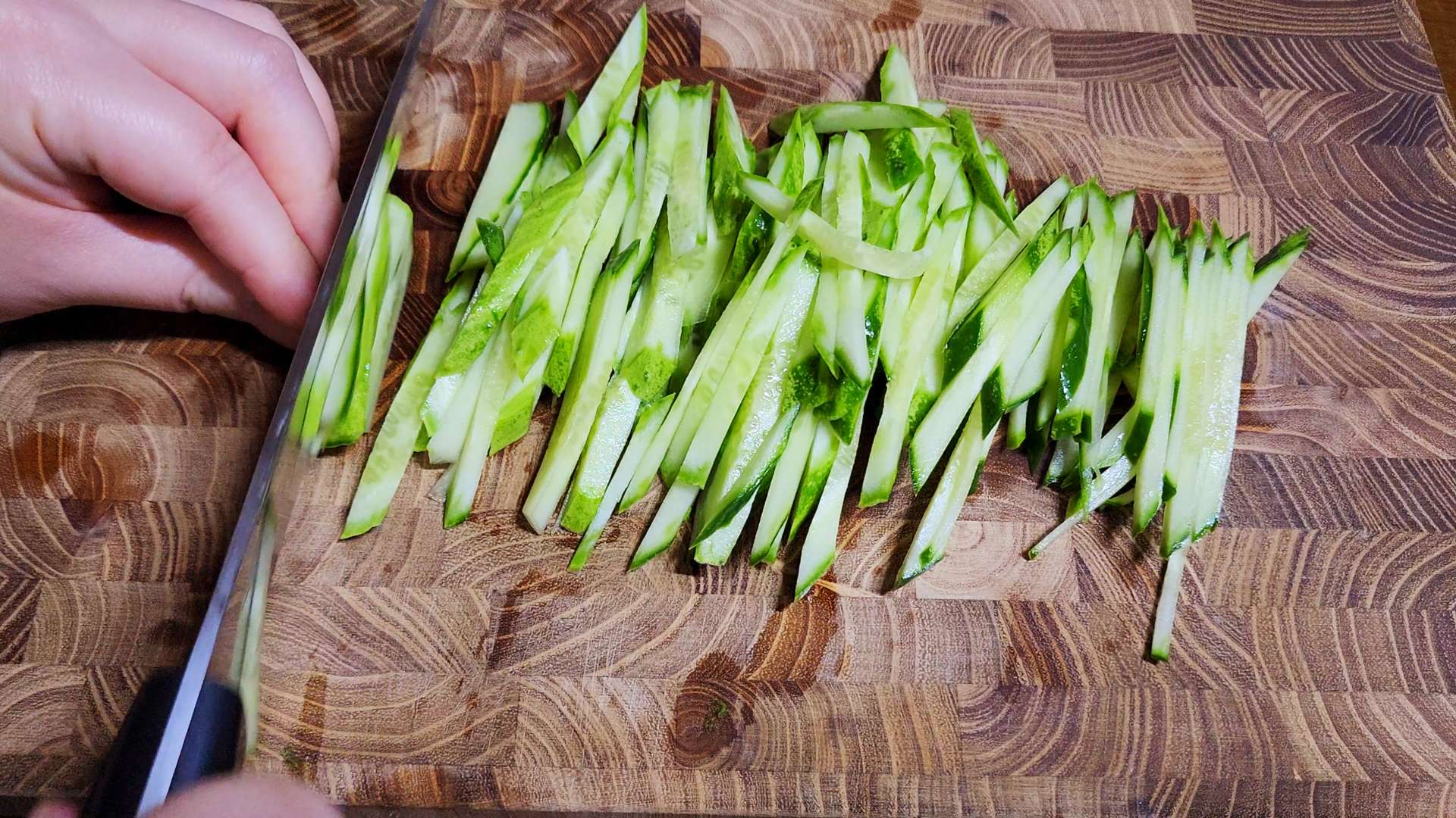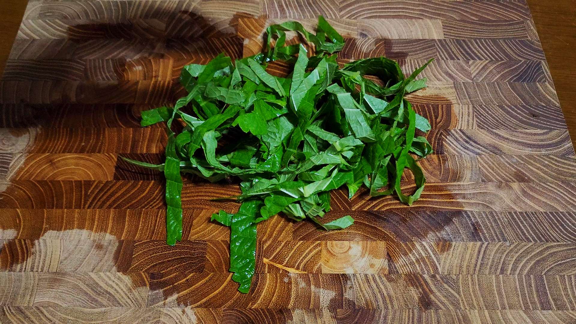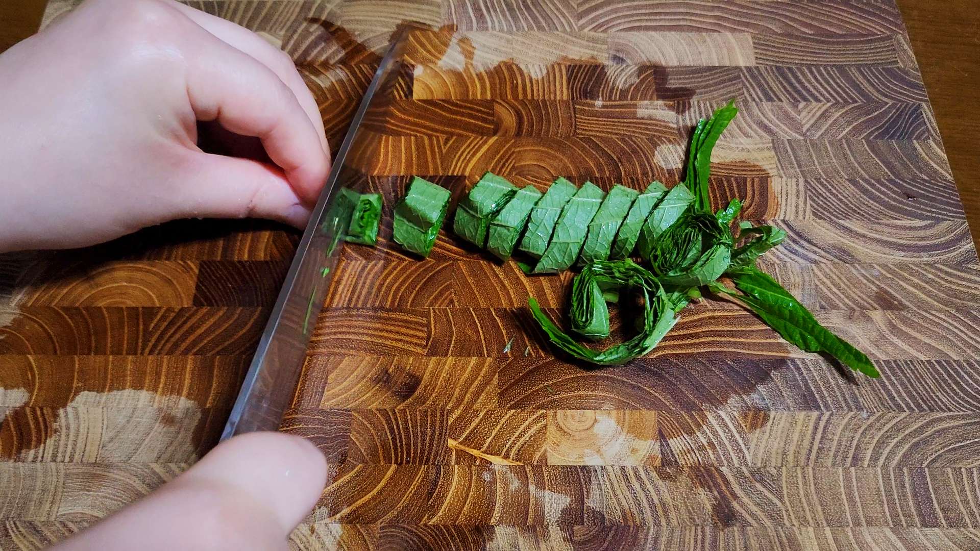 깻잎은 돌돌 말아 채썰어 줍니다.