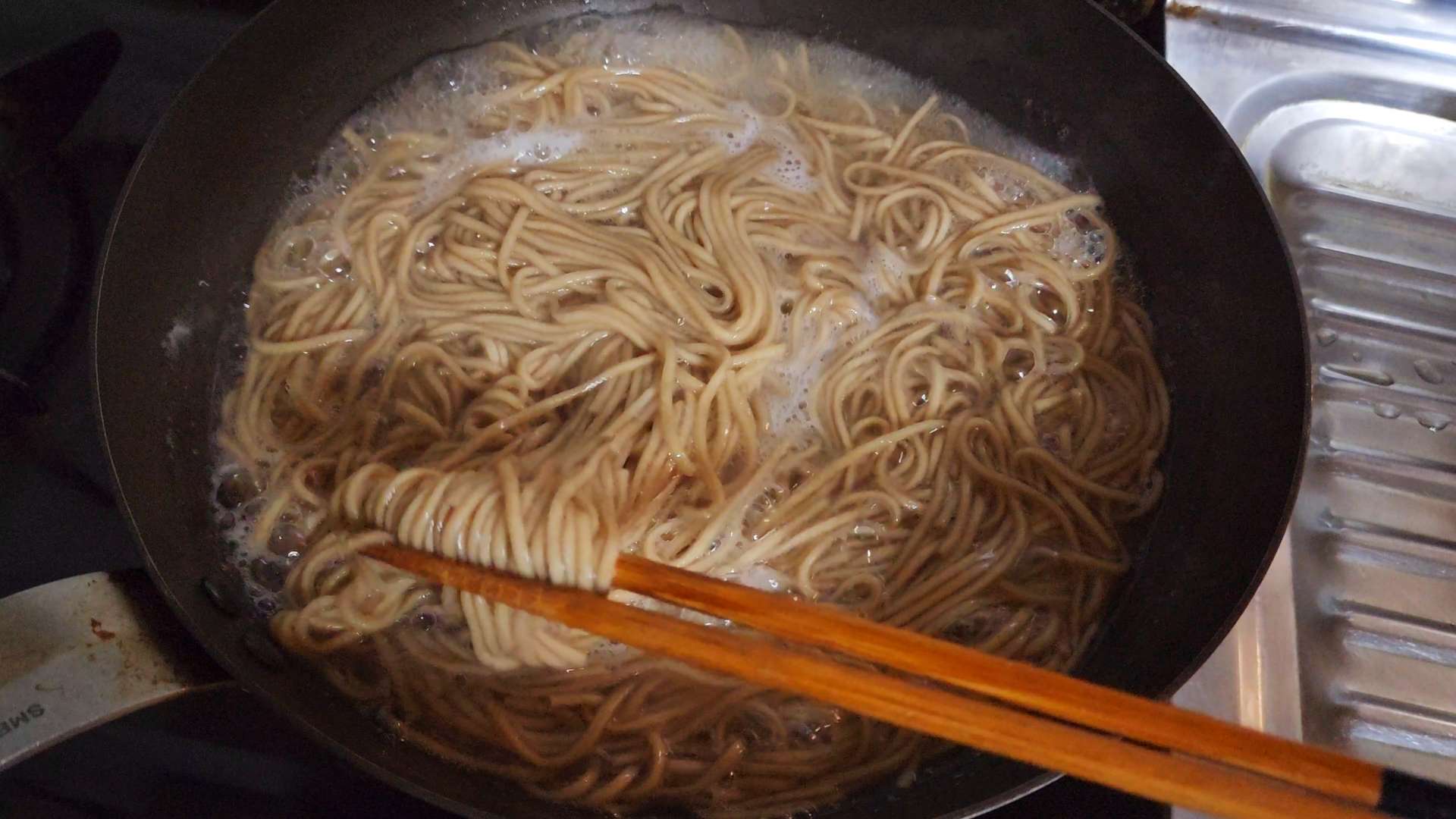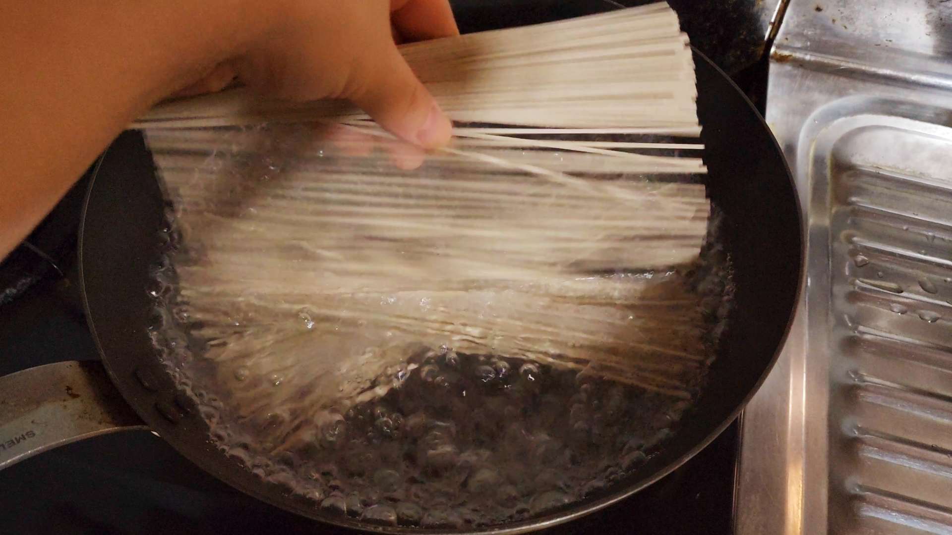 끓는물에 메밀국수를 넣고 5분 정도 삶아줍니다.