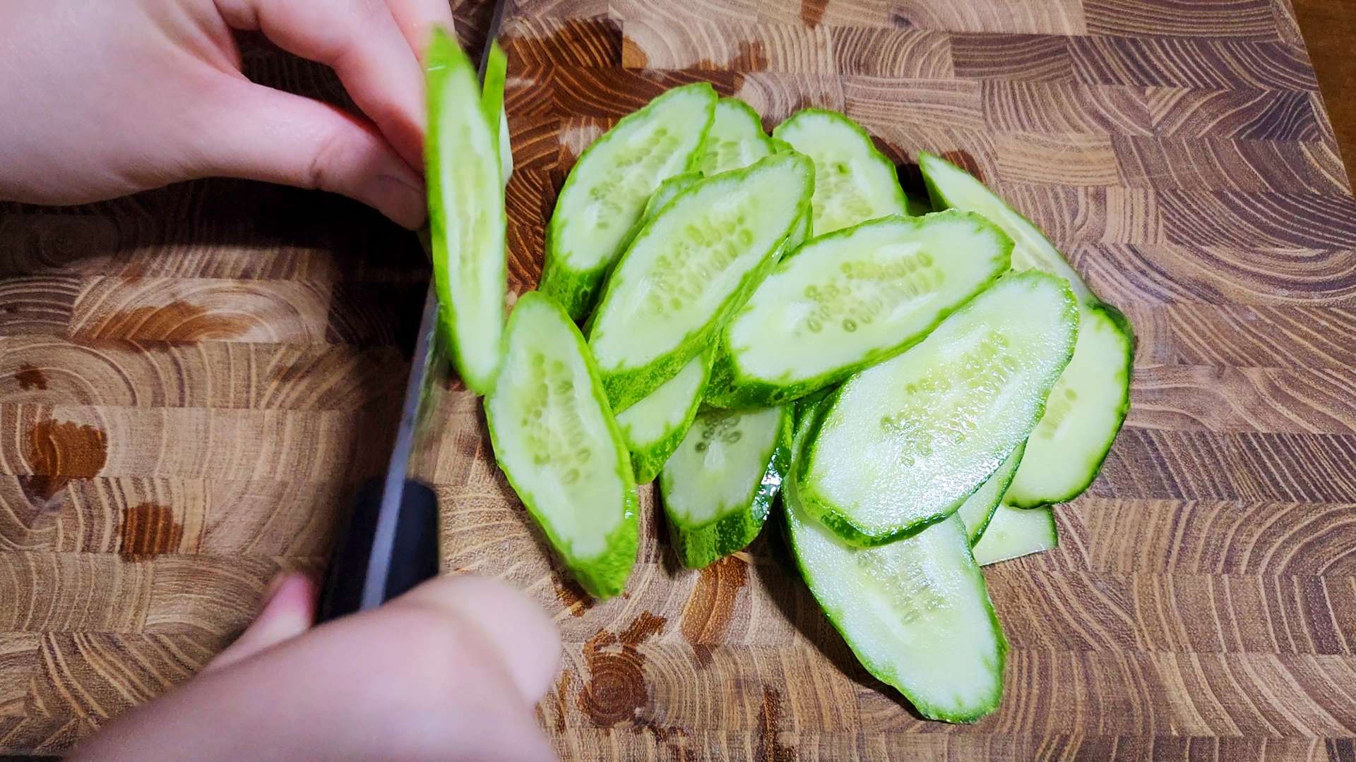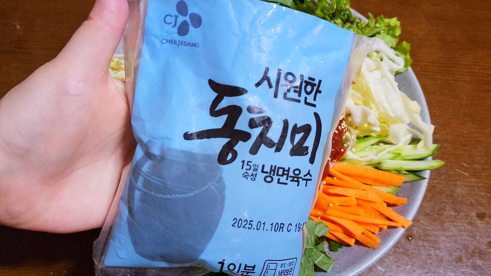 재료: 메밀면 2인분, 오이 1개, 당근 1/3개, 양배추 조금, 상추 4장, 깻잎 6장, 통깨, 시판 동치미 냉면육수 1개,
