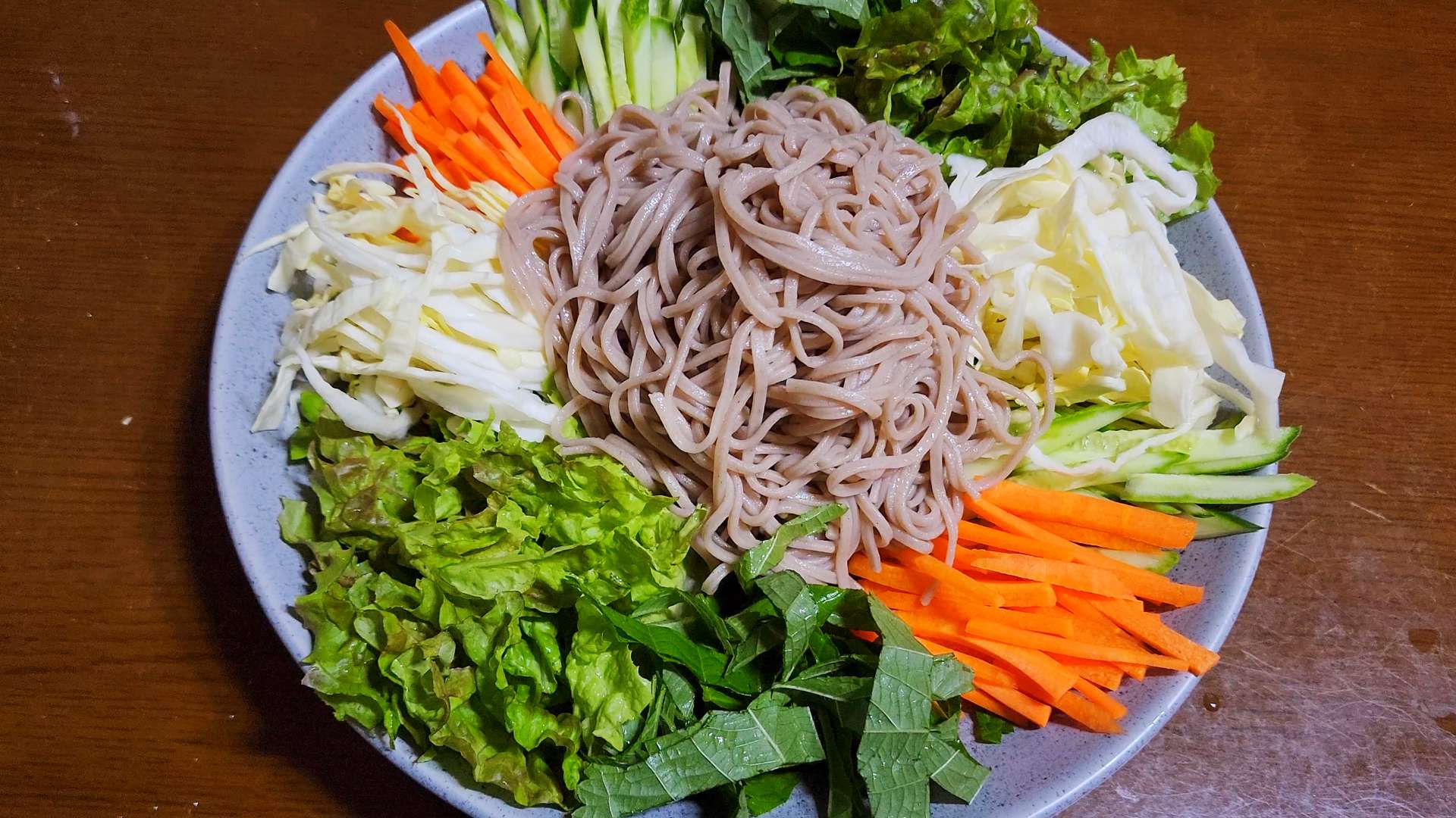 그릇에 상추, 깻잎, 오이, 당근, 양배추, 메밀국수를 담아줍니다.