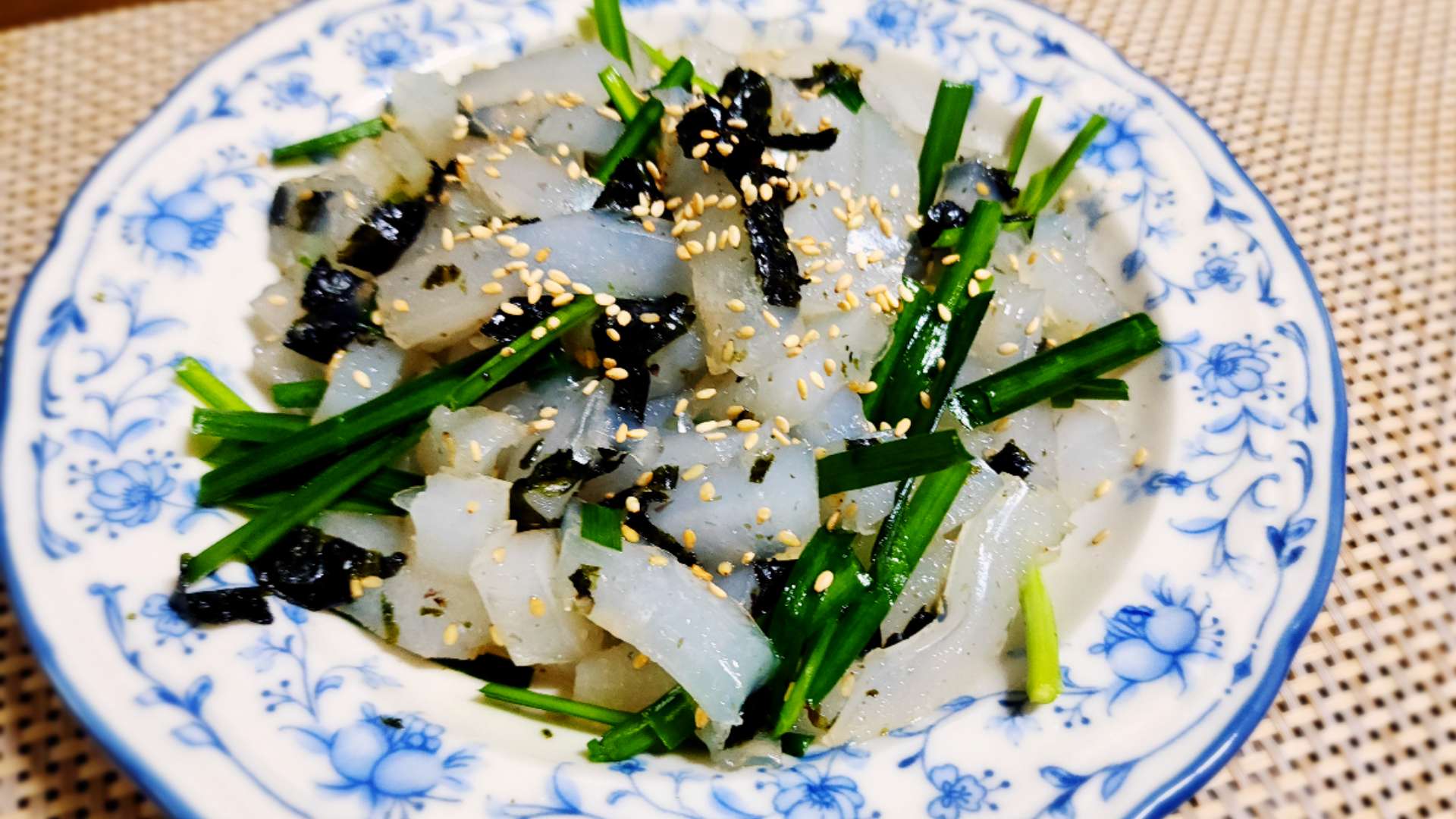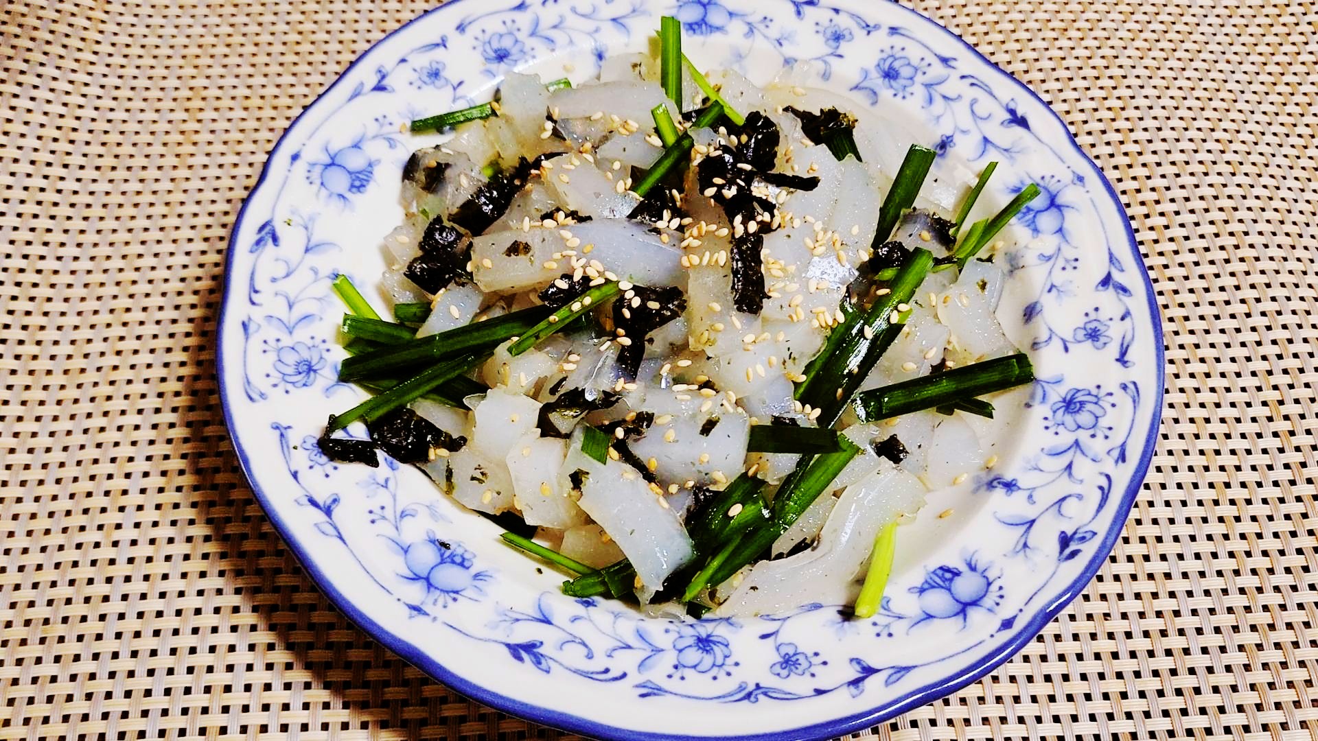 재료: 청포묵 1모(200g), 부추 3줄기, 조미김 조금